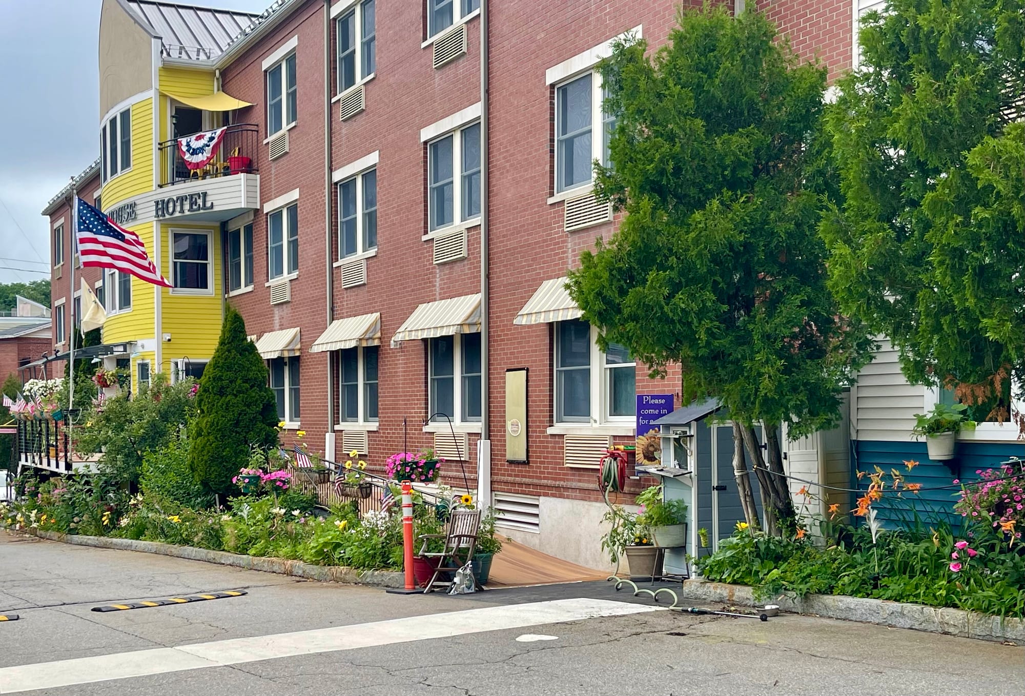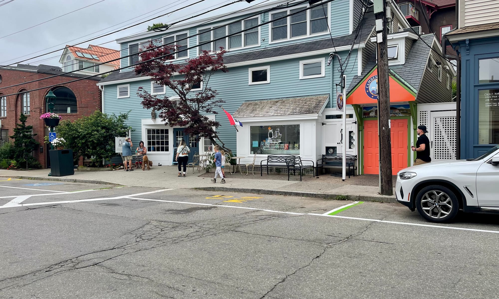 The combination of an ice cream shop, bridge of flowers, and picturesque hotel here is lovely, but it is totally hidden from the main intersection. For those who know about it, it is an important node of activity and community life. But being tucked down a side street and surrounded by pavement, it doesn't do well at attracting foot traffic and new visitors. Widening the sidewalks, making the parking parallel and moving it to the other side would open up a view of the River Ducks.