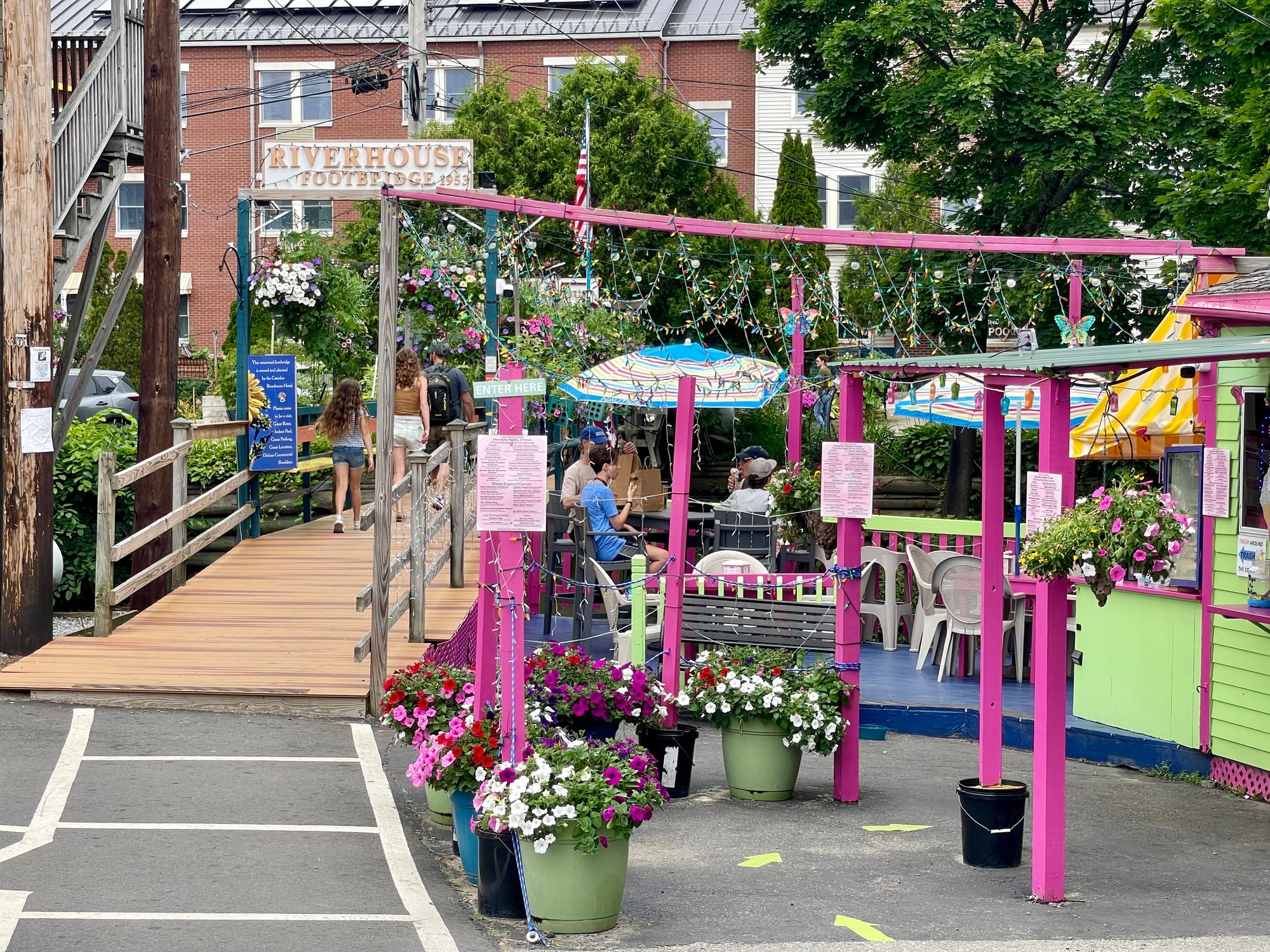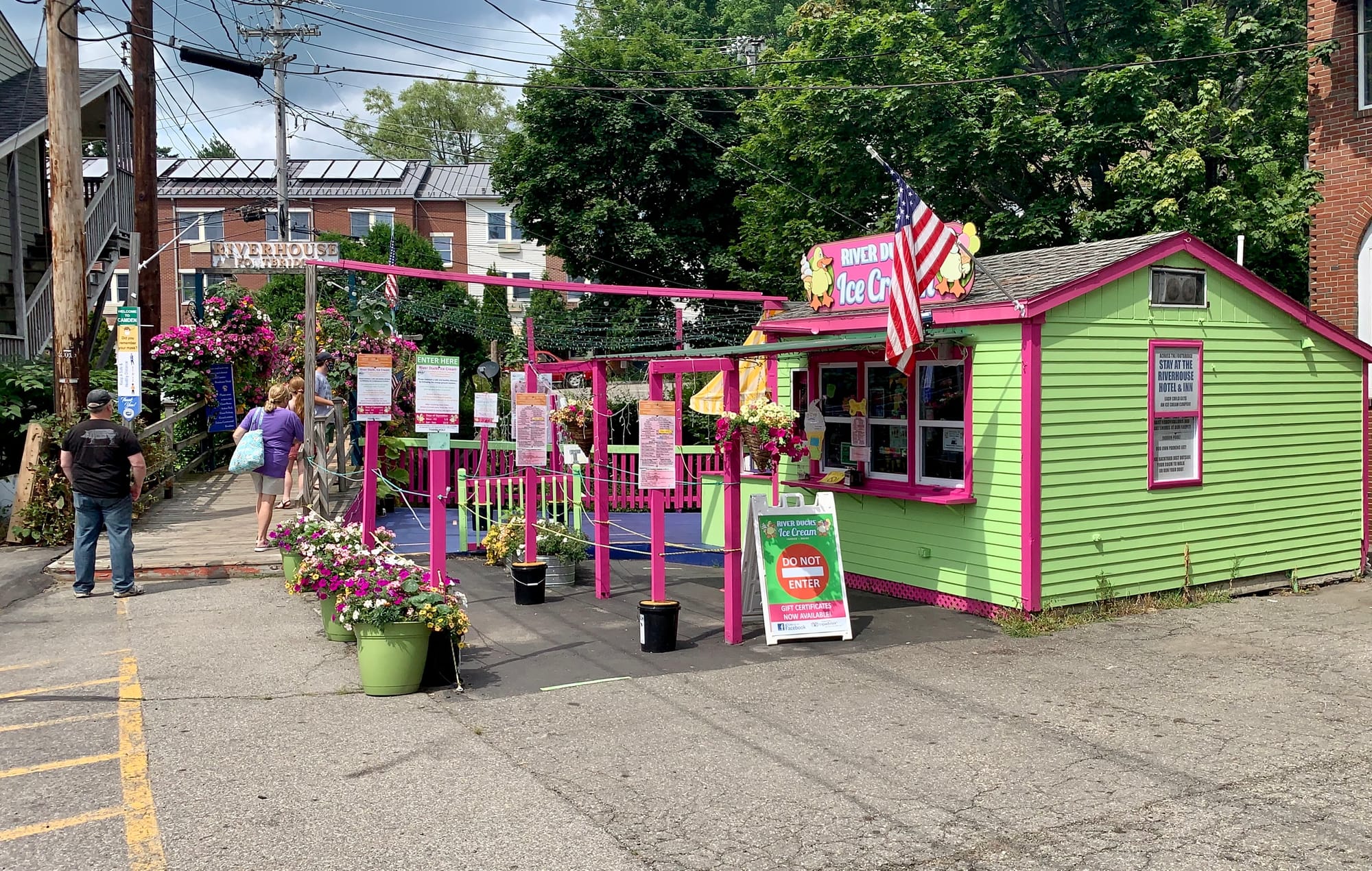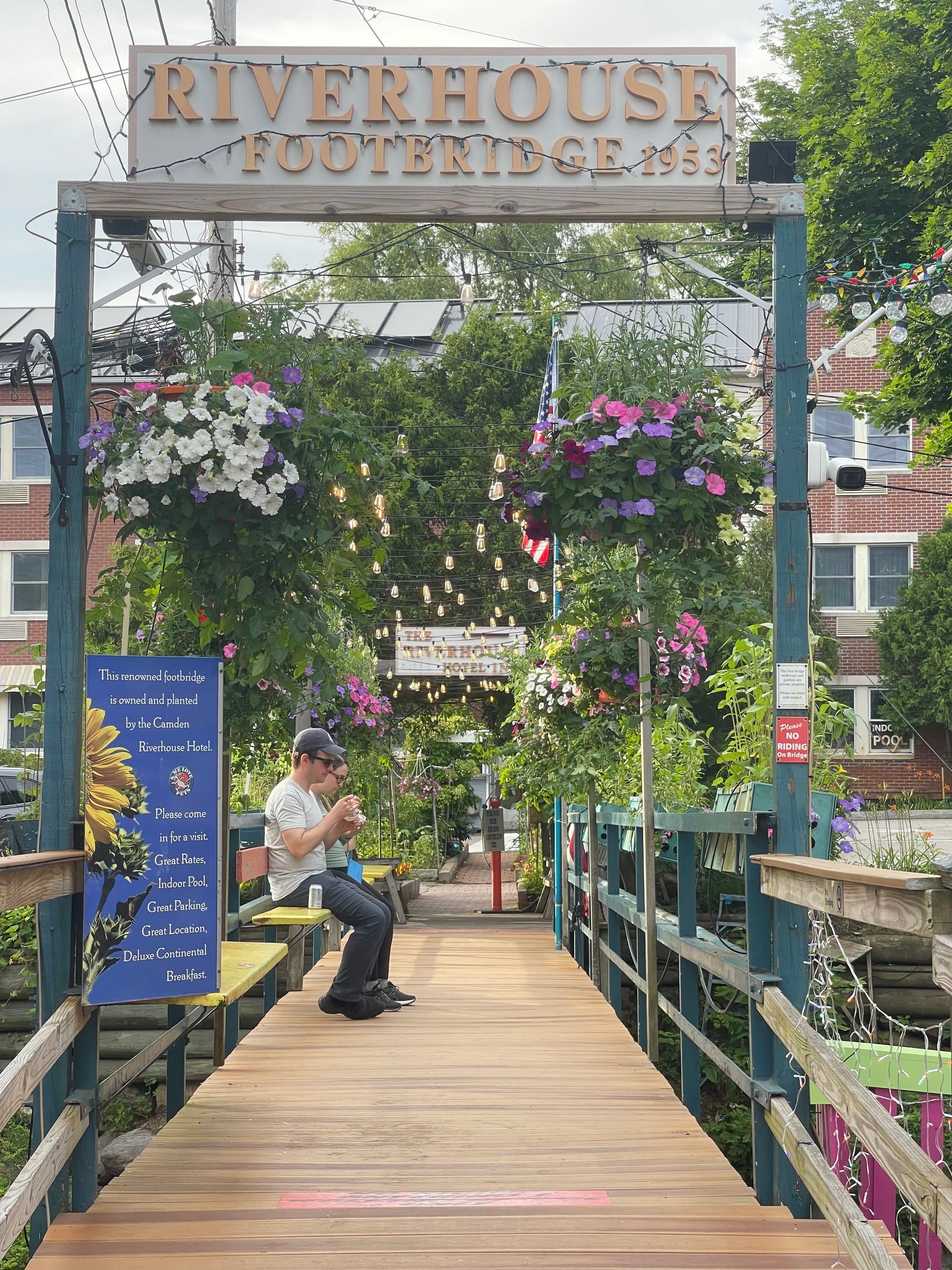 Riverhouse Hotel and flower bridge lead to River Ducks ice cream stand.