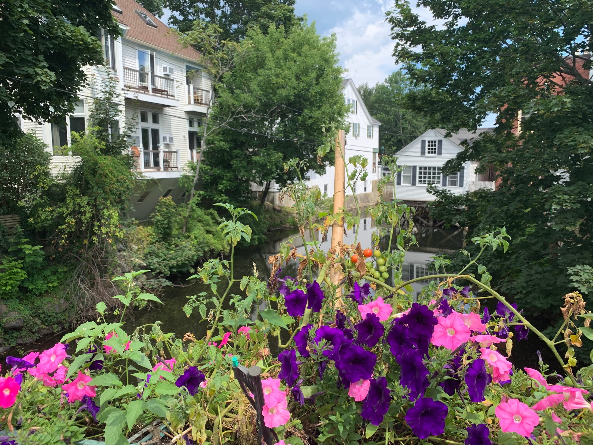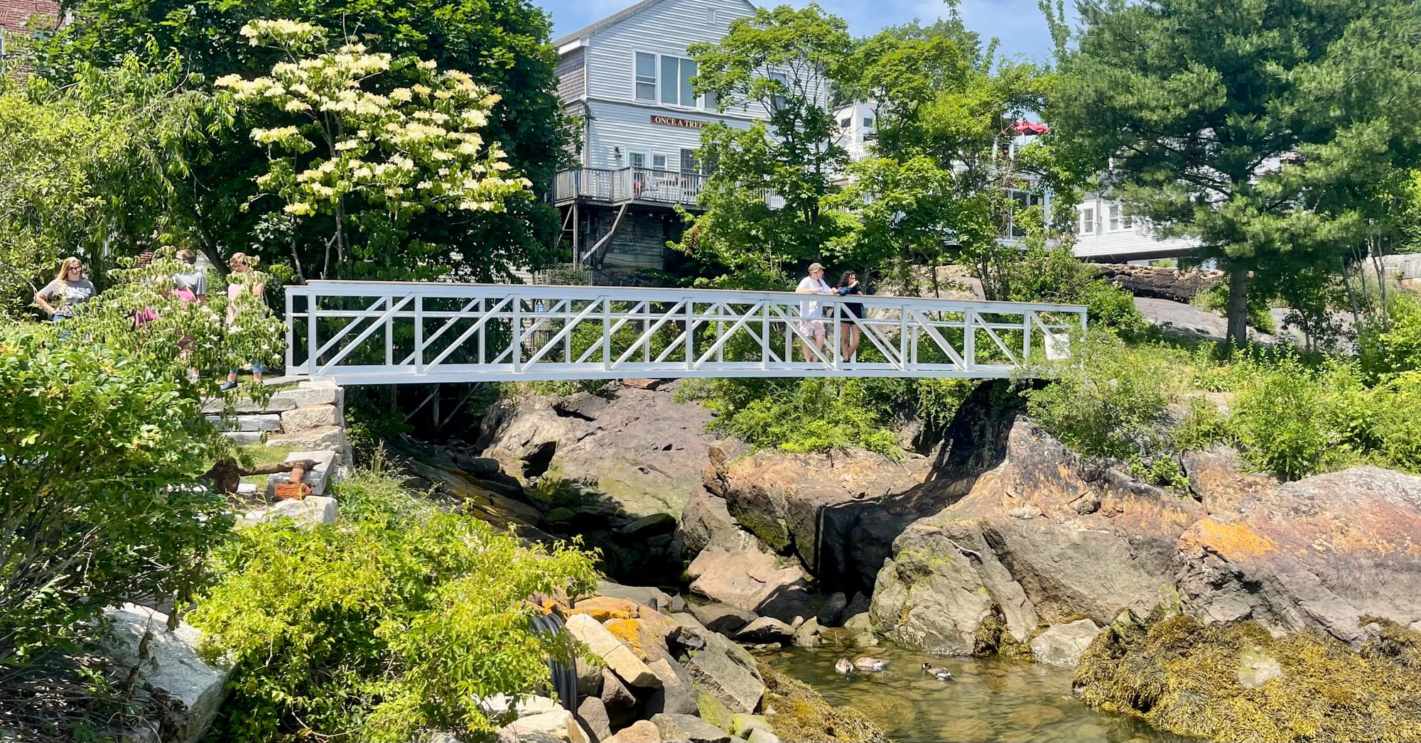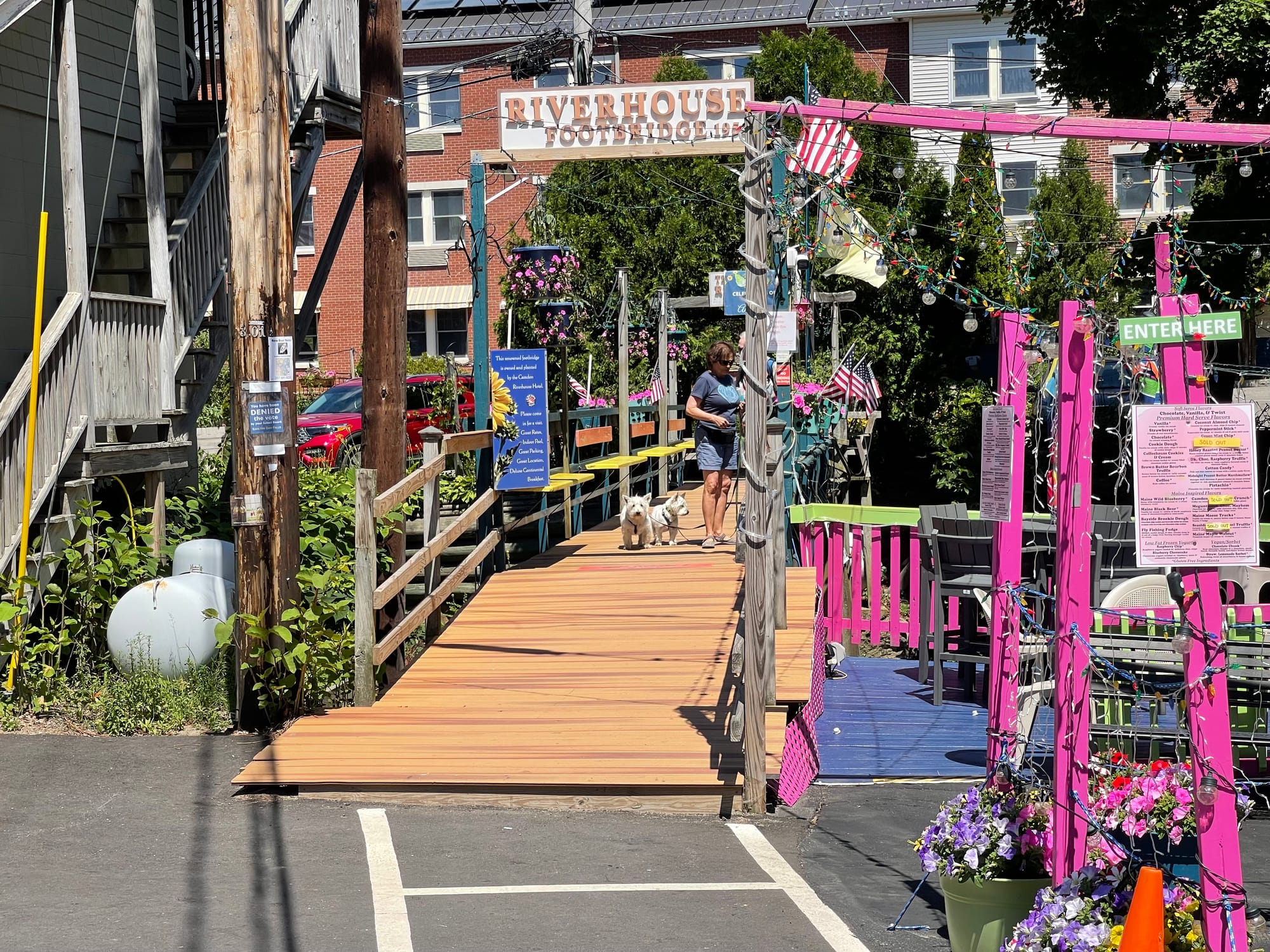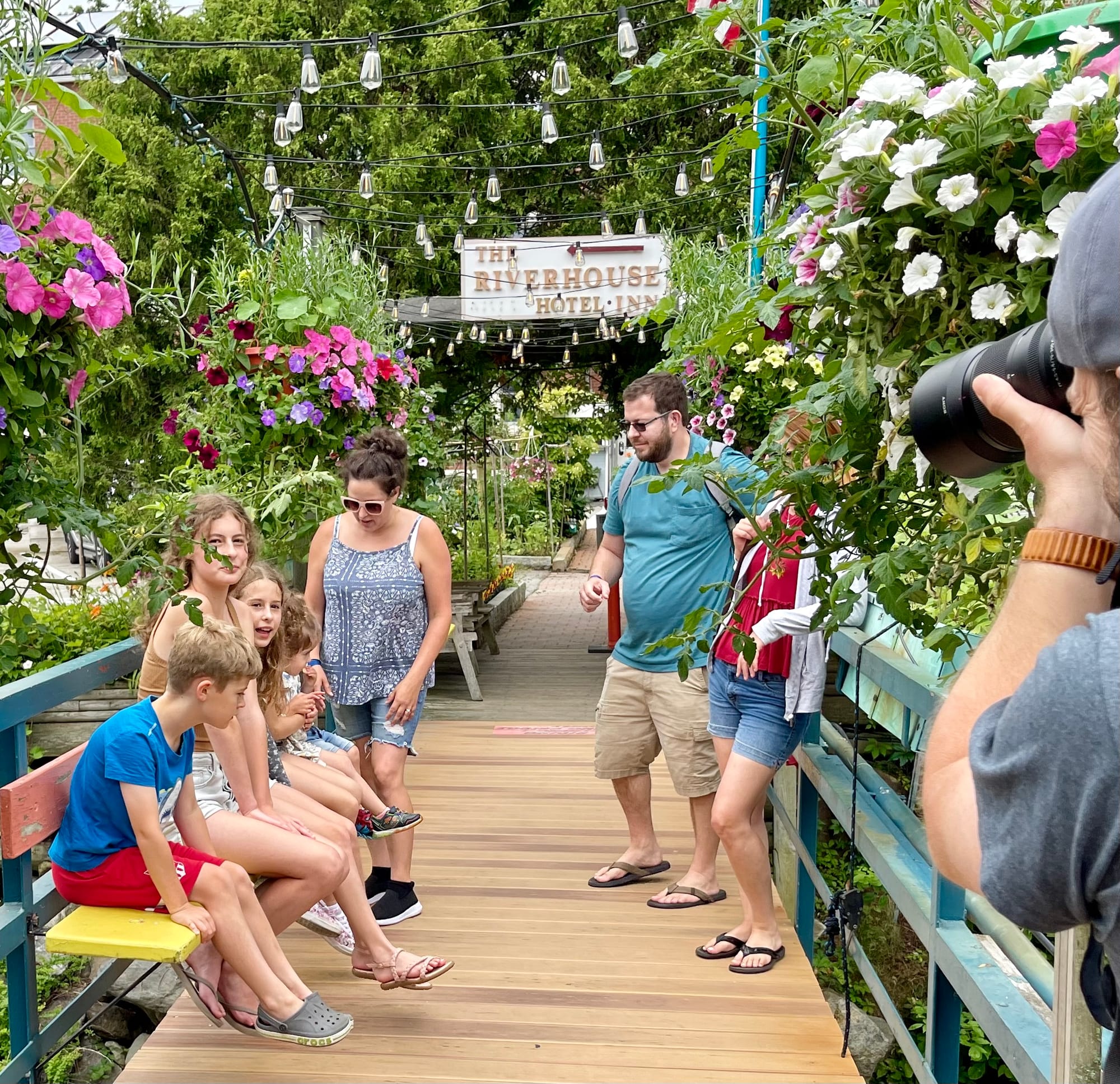 Riverhouse Hotel and flower bridge lead to River Ducks ice cream stand.