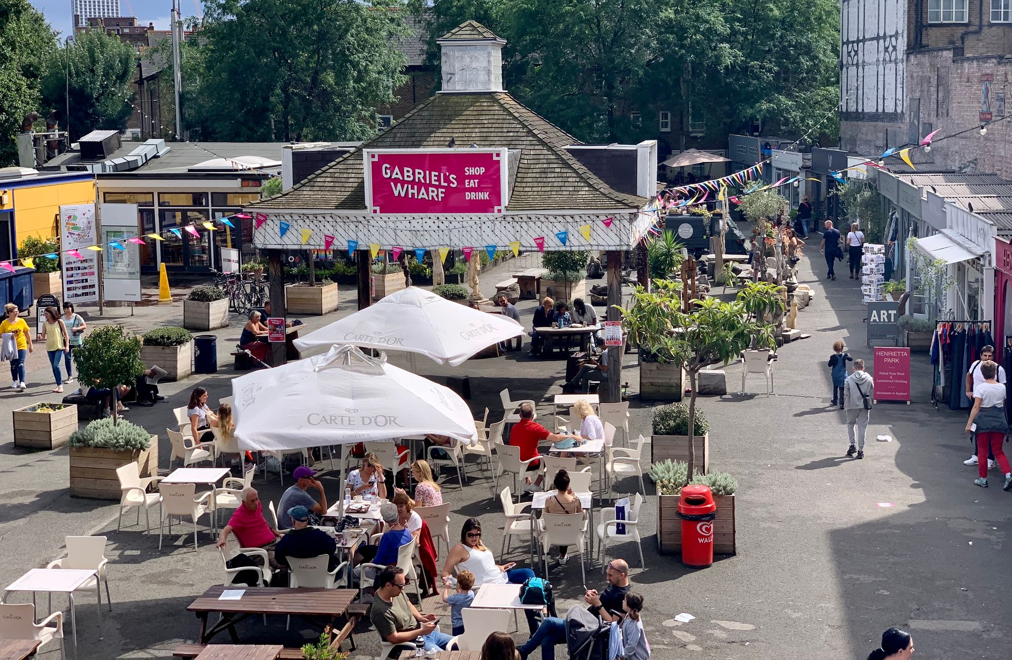 Art can also be a way to attract people to a place where there were no people before. One of our favorite examples of this is Gabriel's Wharf in London. Once a bare, industrial area with nothing to offer in terms of attractions or entertainment, a beautiful mural depicting a Georgian street initiated the complete transformation of the area into a bustling outdoor market.