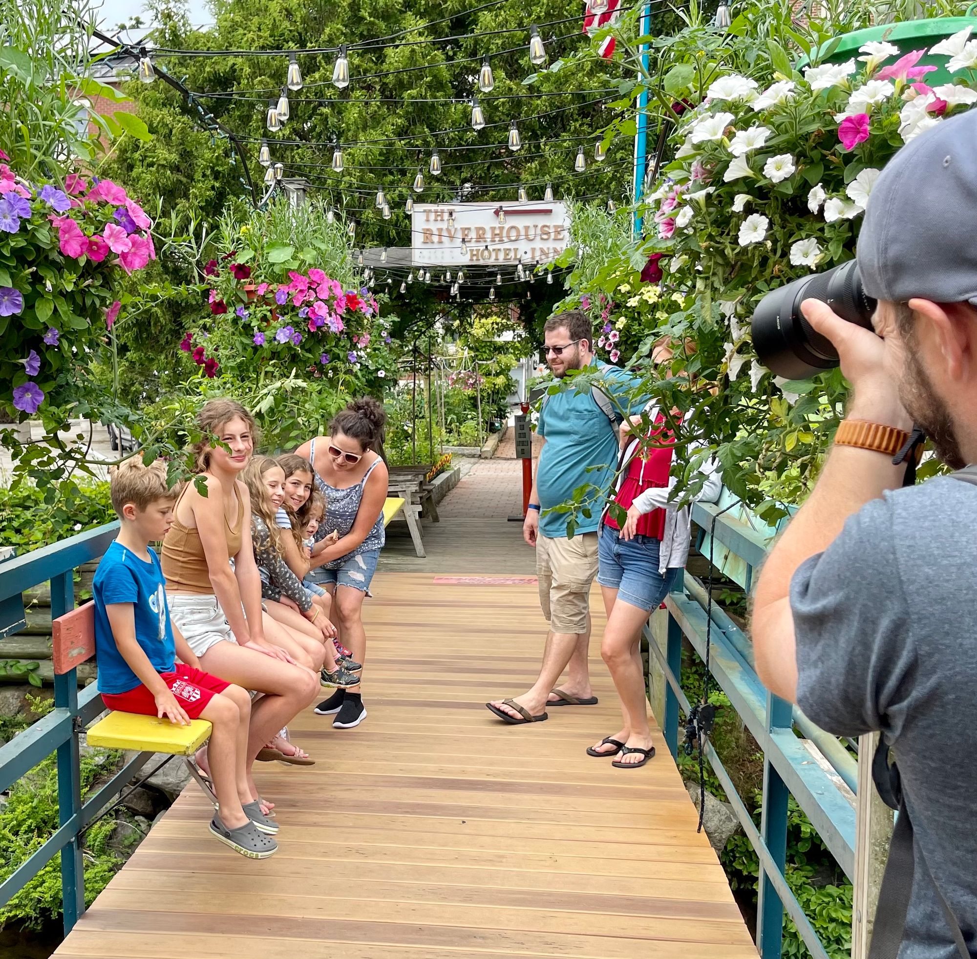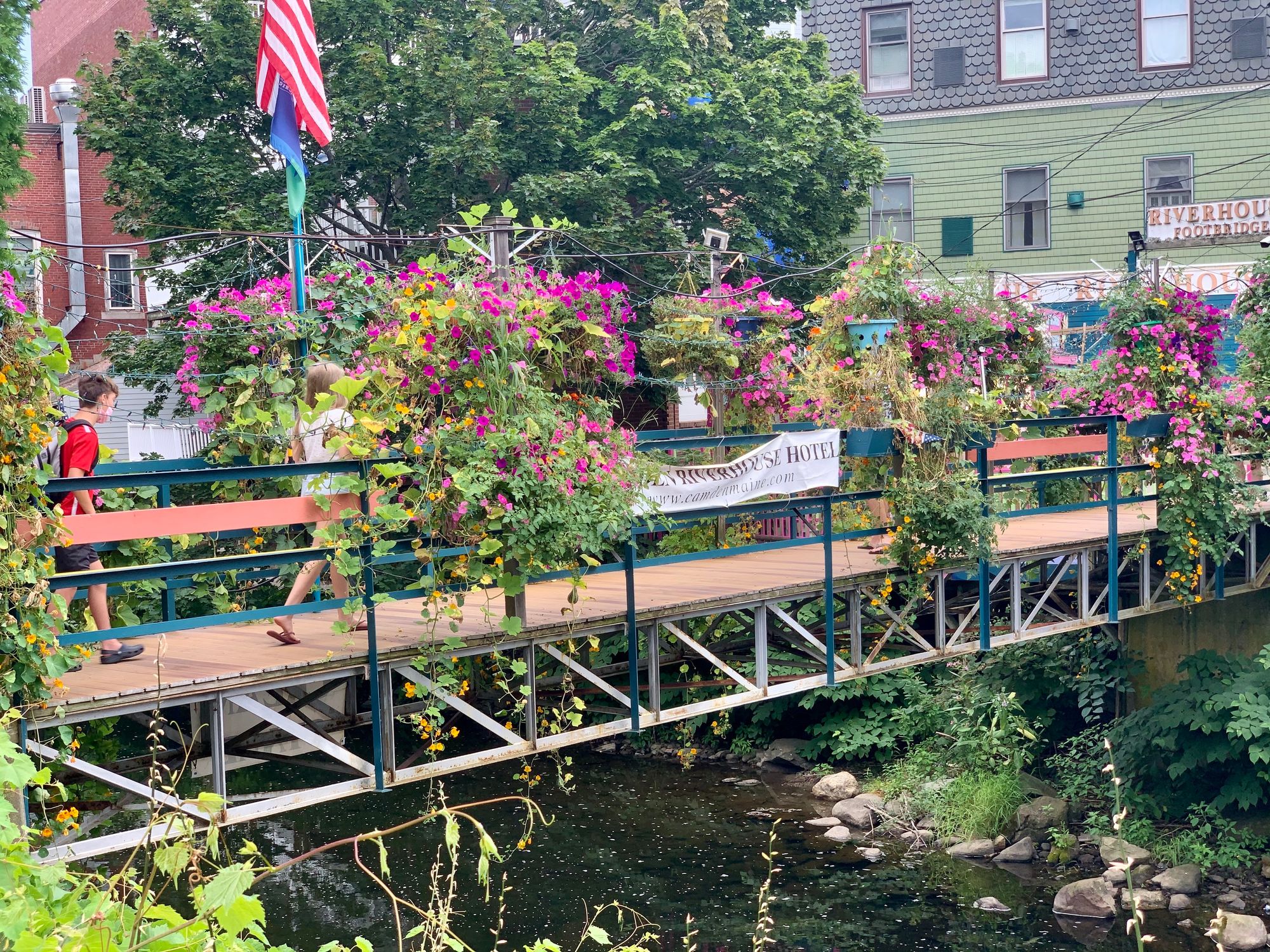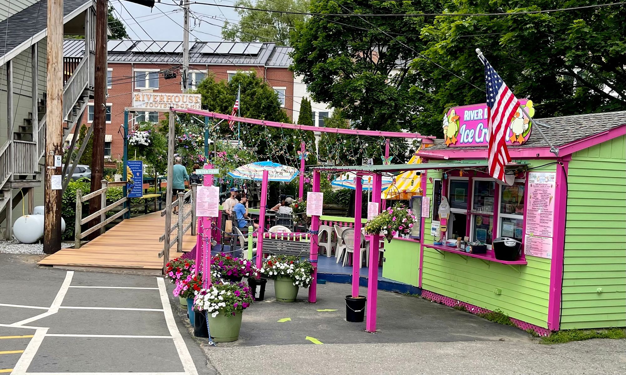 River Ducks Ice Cream Stand in Camden is located beside a short pedestrian bridge covered in flowers.
