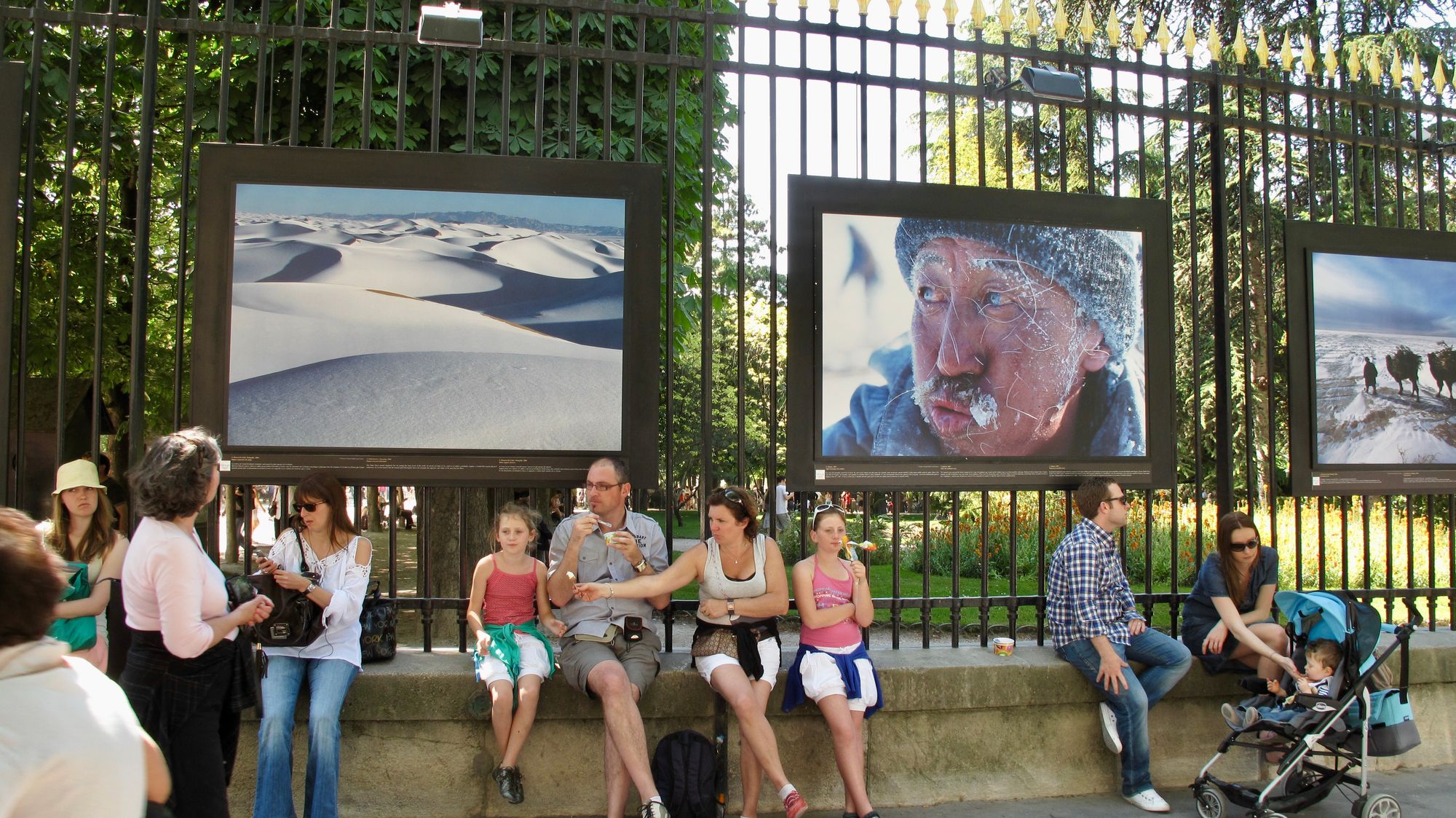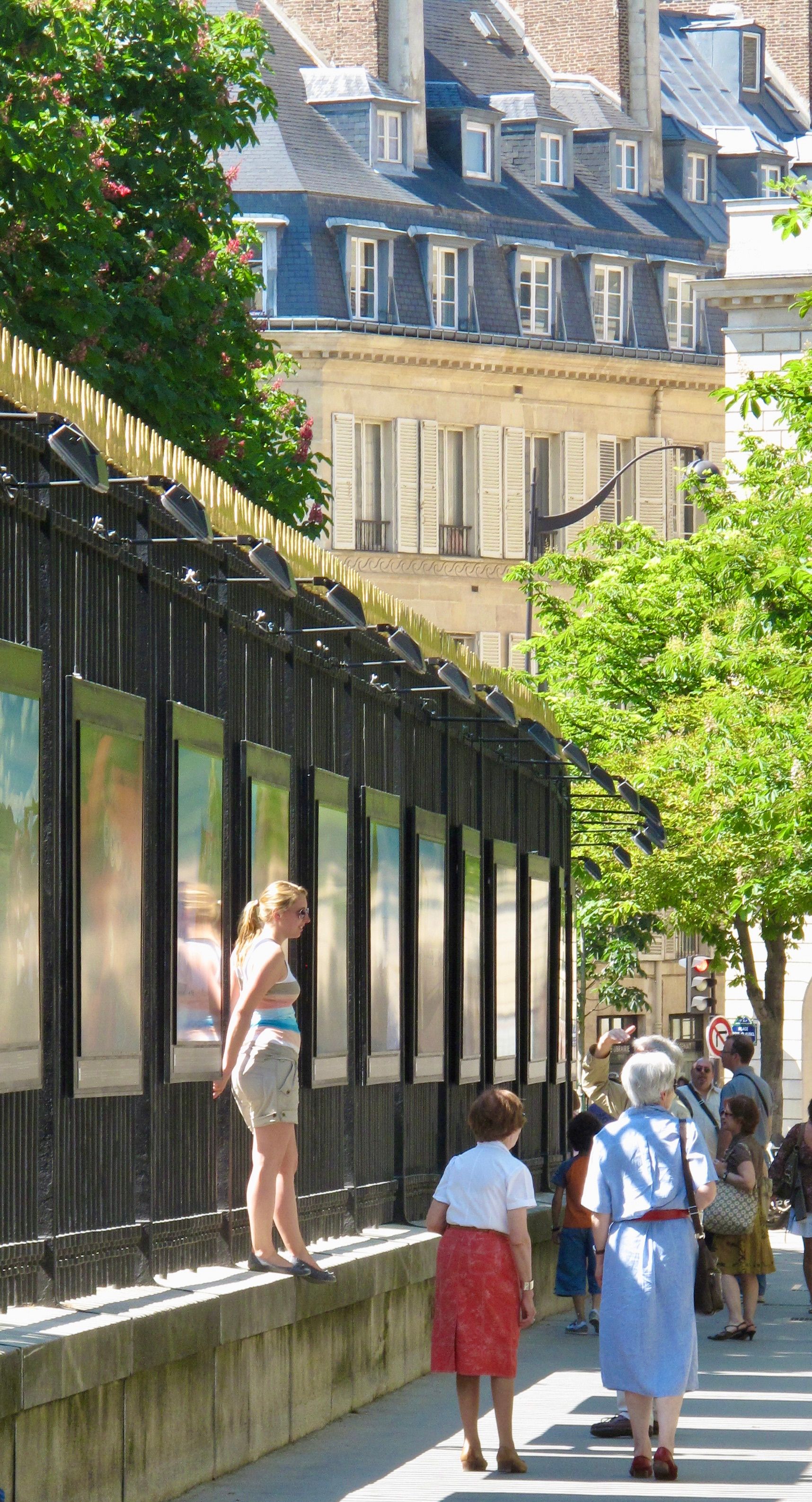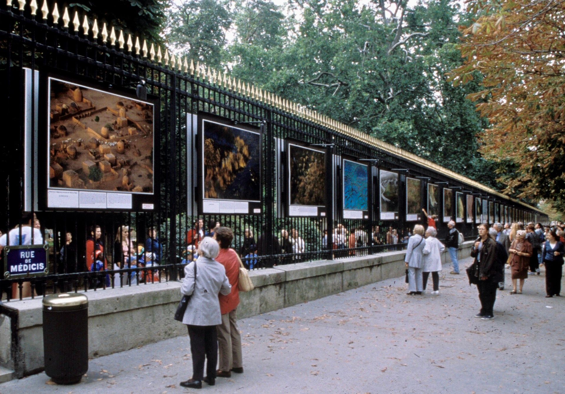 The art exhibits outside Luxembourg Gardens are often double sided with art displays on the fence as well as the other side of the sidewalk, creating a more multi-layered art experience.