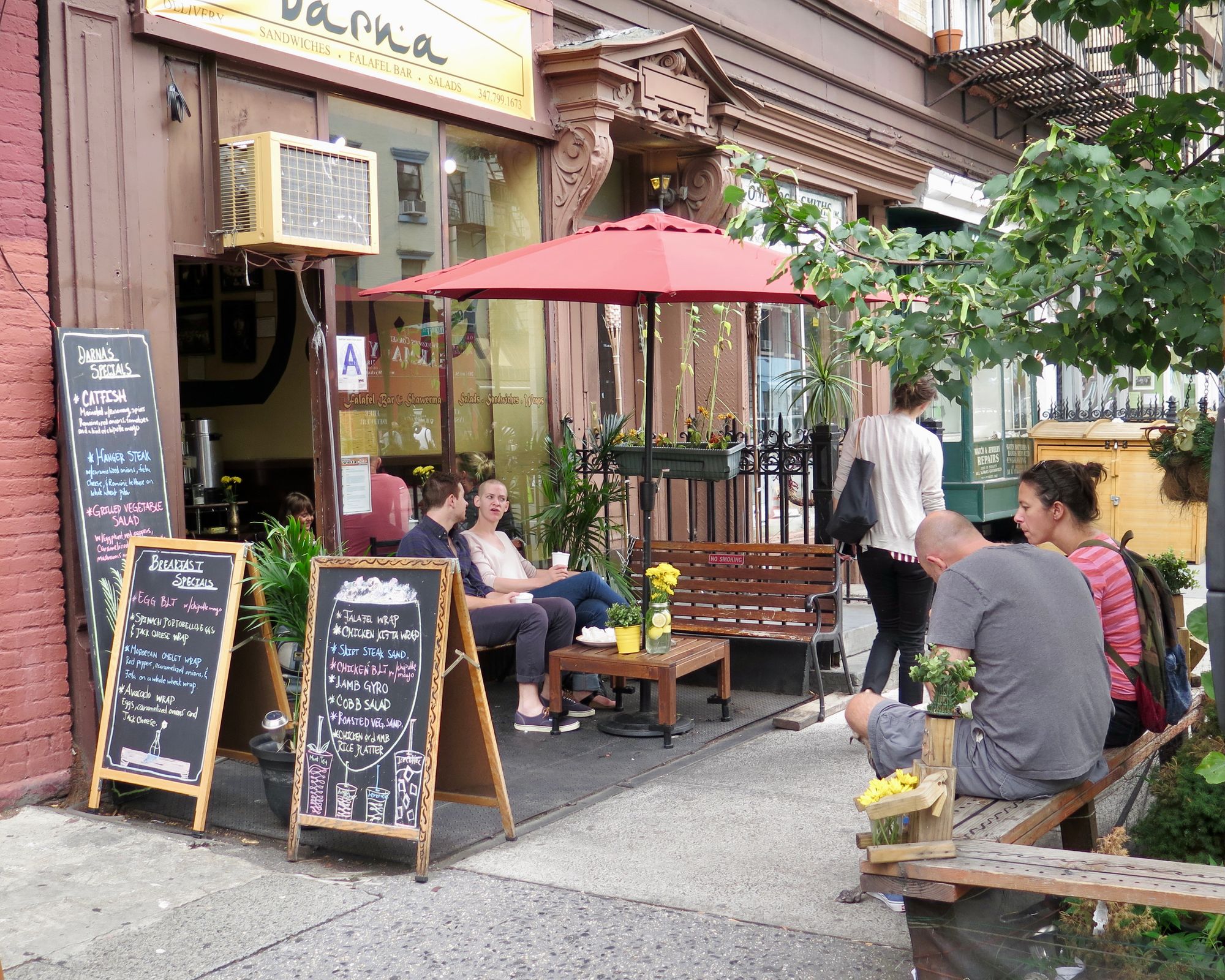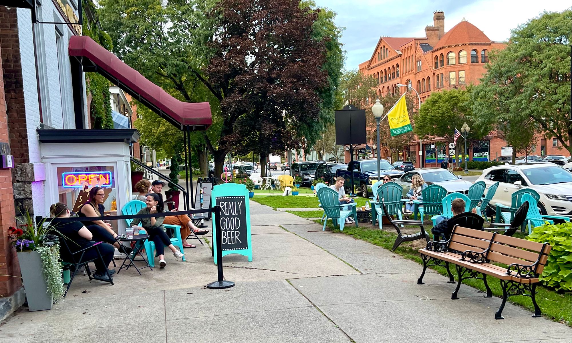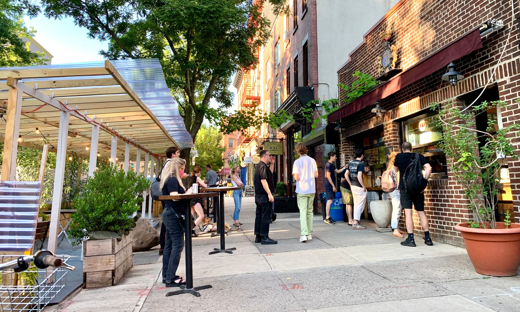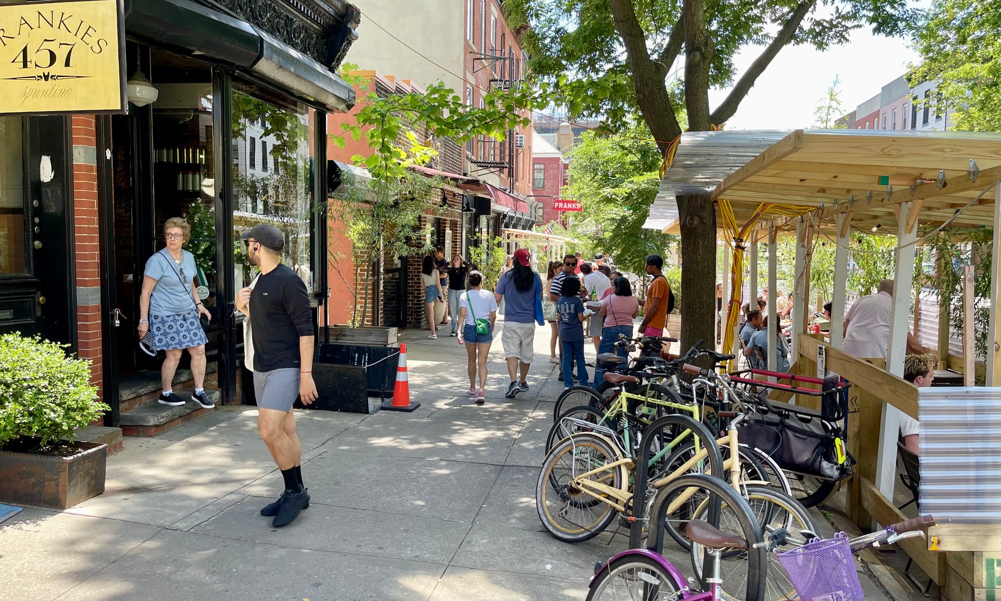 Brooklyn created amazing examples of double loading when it was allowed to put up dining sheds on the street during the pandemic. These unique constructions created social hubs all along sidewalks, transforming dull car-centric streets into main streets where the community loved to gather.