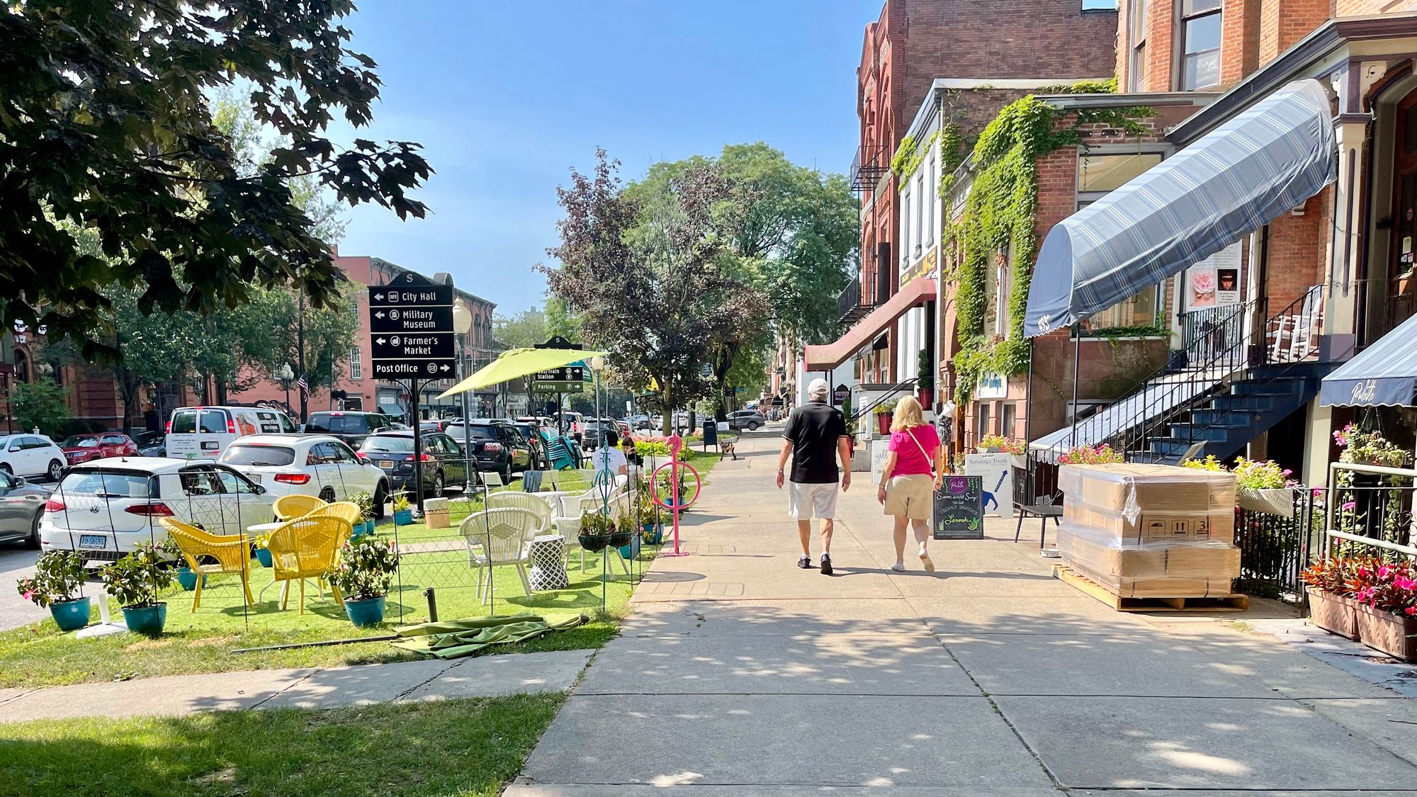 On many of our favorite wide streets, we see something that we call “inside-out design.” Inside-out design means that whatever is happening inside buildings spills out onto the sidewalks. Instead of a solid wall between the private and public realms, the walls are permeable, with people and things moving in and out. This is achieved through open windows and doors, outdoor seating, porches, and displays of goods pulled out into the sidewalk area.