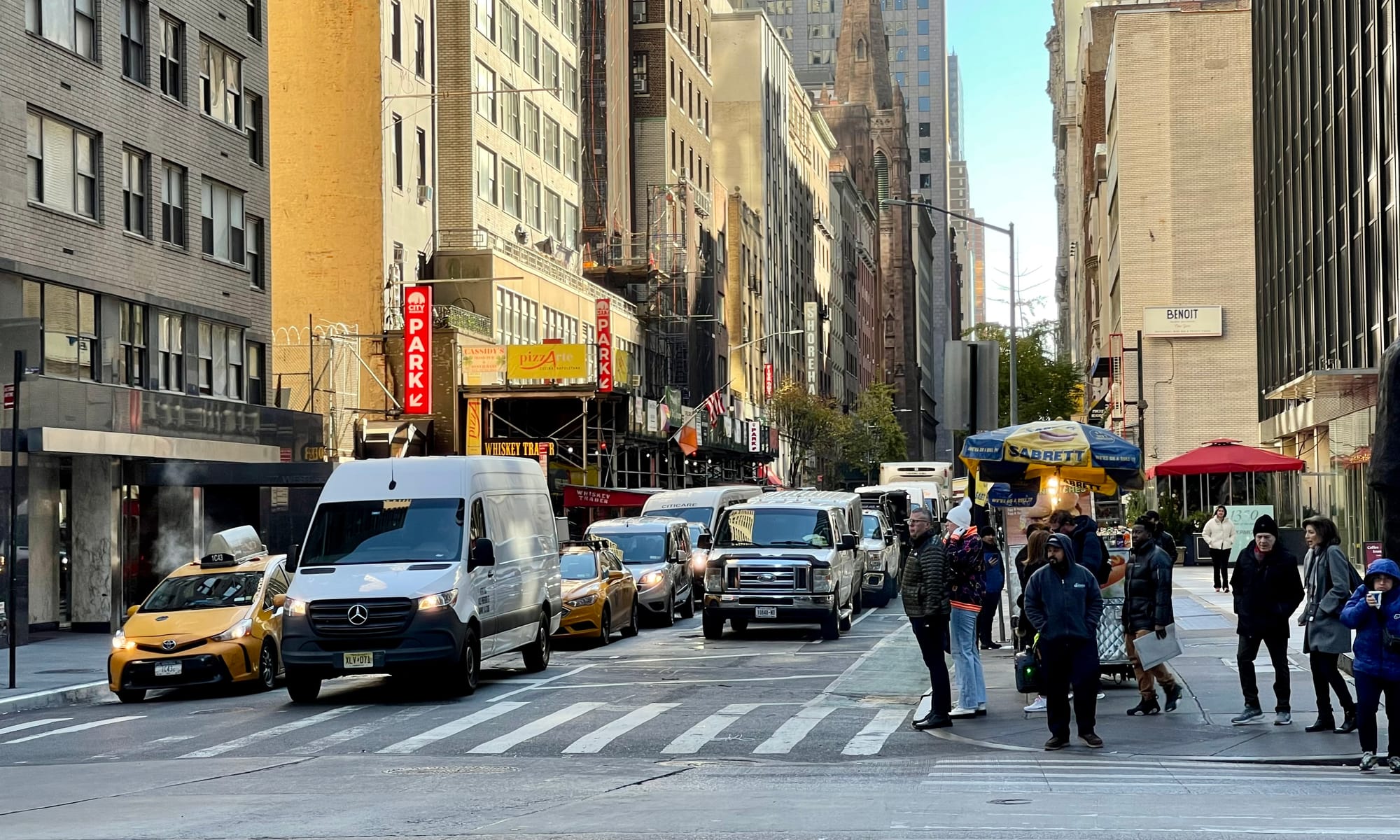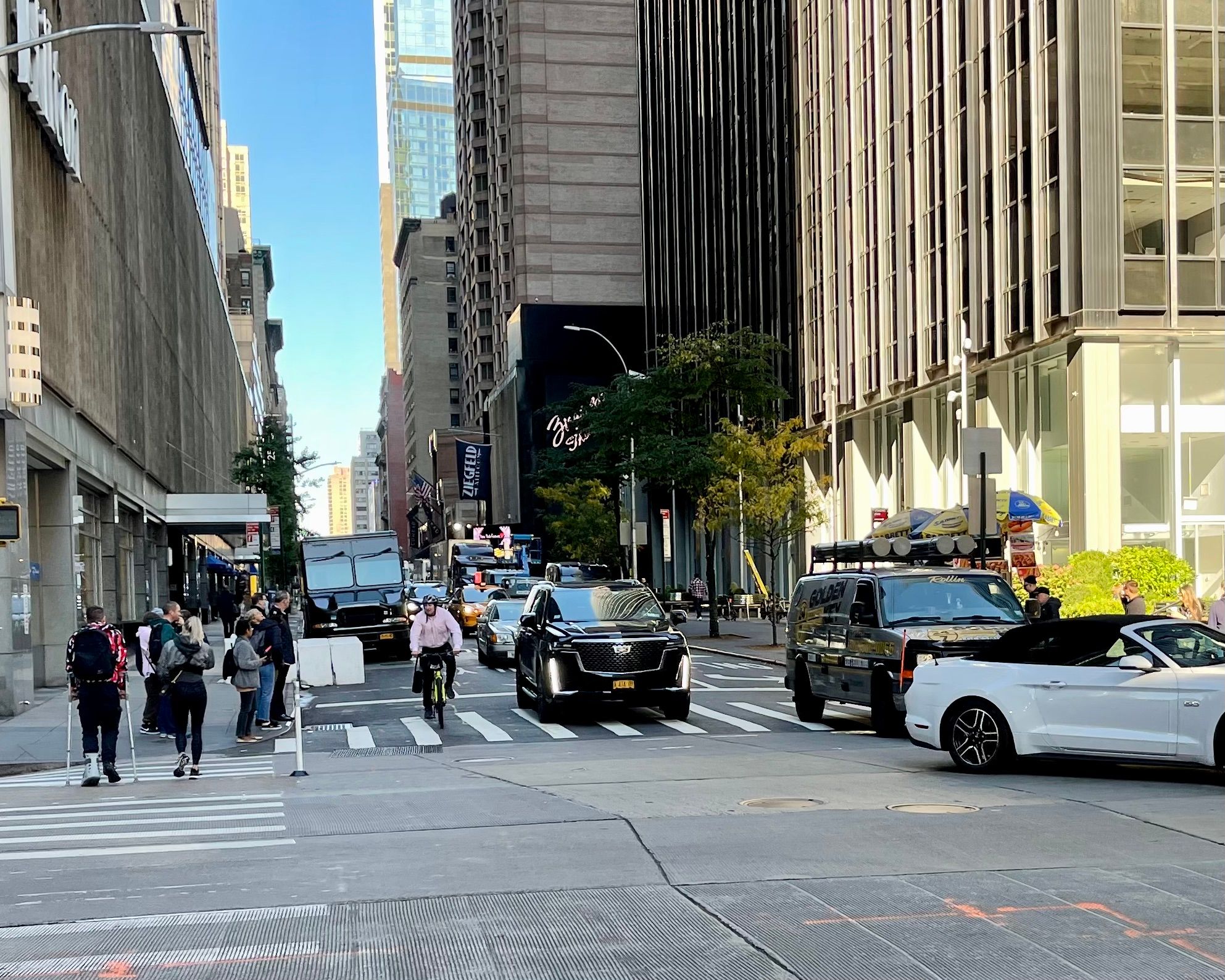 Most of Midtown Manhattan has sidewalks like these where intersection have car "stacking" of 3+ lanes