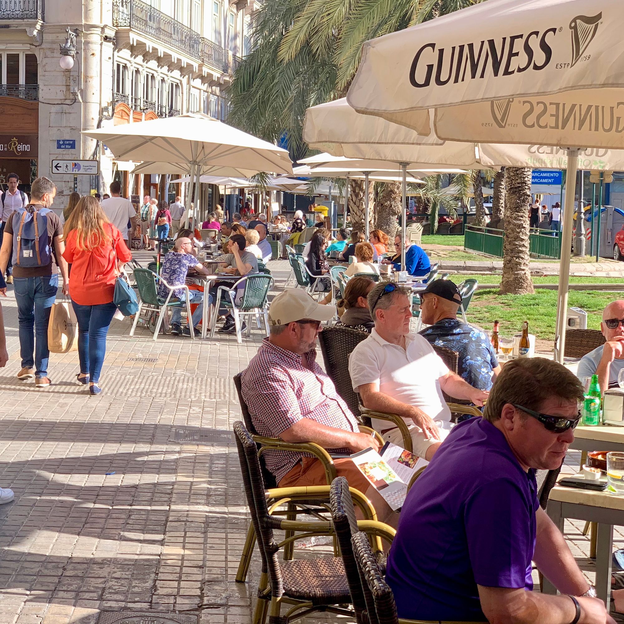 Worth noting in these examples is how people don't seem to notice the presence of cars at all, even though there are often multi-lane streets on the other side of the sidewalks. Double loading makes a wide street feel like a cozy, safe, narrow walkway where the pedestrian is king. While we should work on developing more pedestrian-only areas, promenades, and narrow streets, in the meantime we can retrofit our existing wide streets by double loading them.