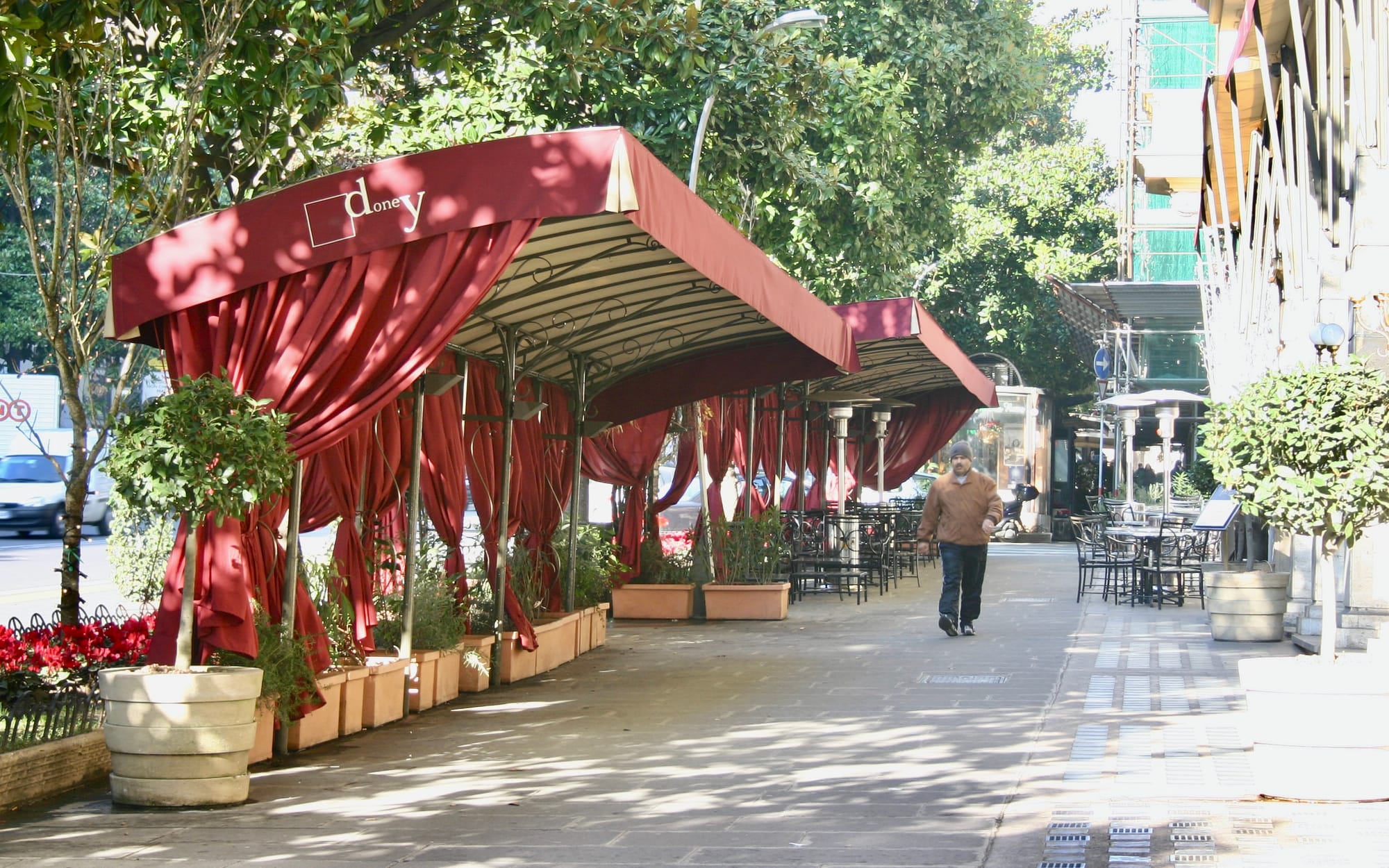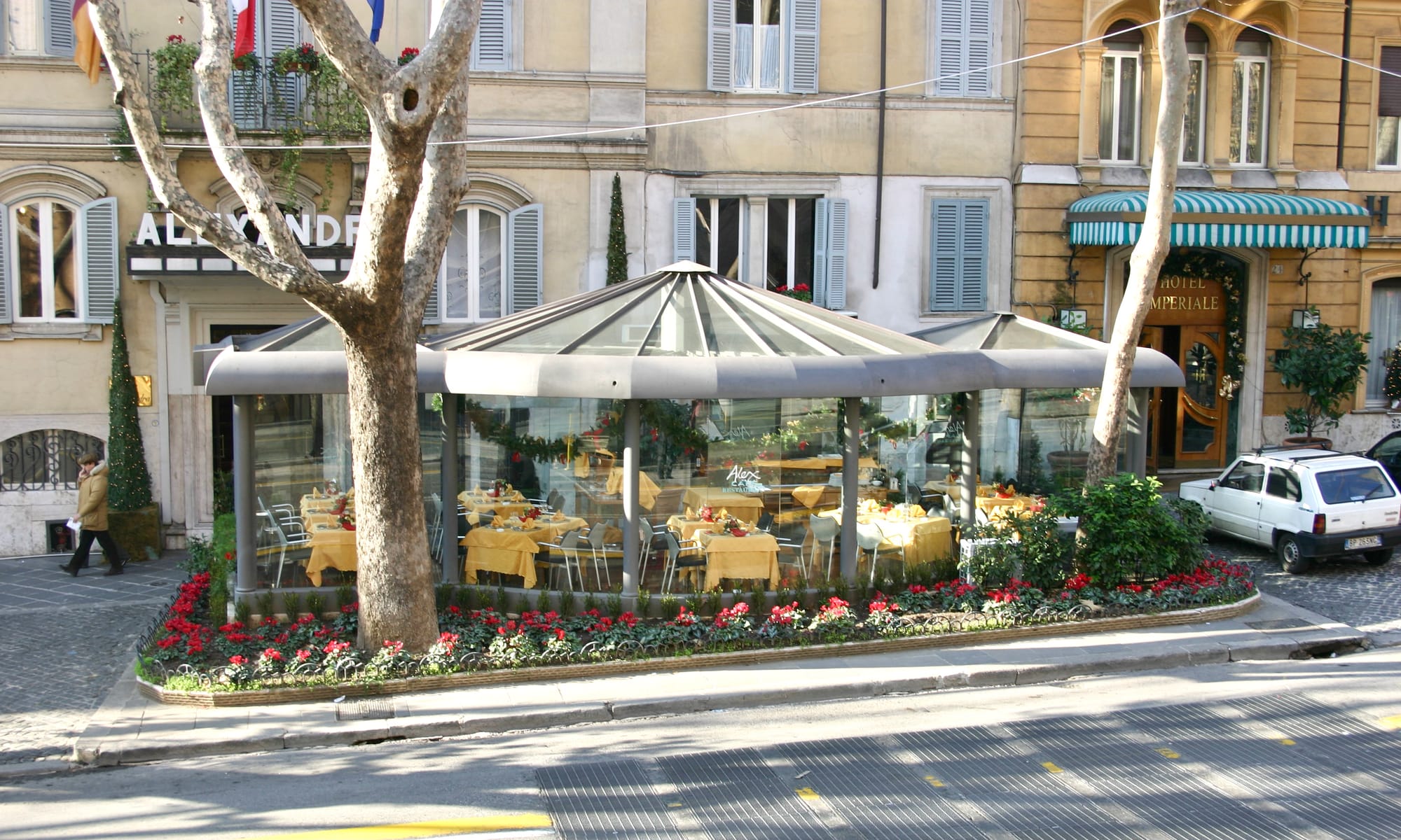 Rome's dining pavilions are reminiscent of NYC's dining sheds, creating extensions of restaurants and cafes on the sidewalks. Their closed design protects the outdoor dining areas from the elements, while their glass walls and open designs allow them to interact with sidewalk life.