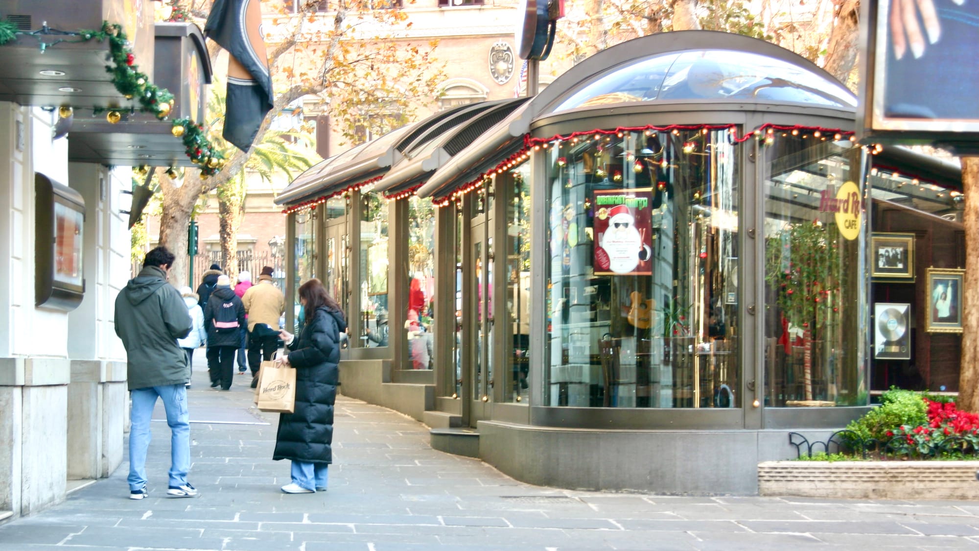 Pedestrians can shop or eat on either side of this sidewalk.