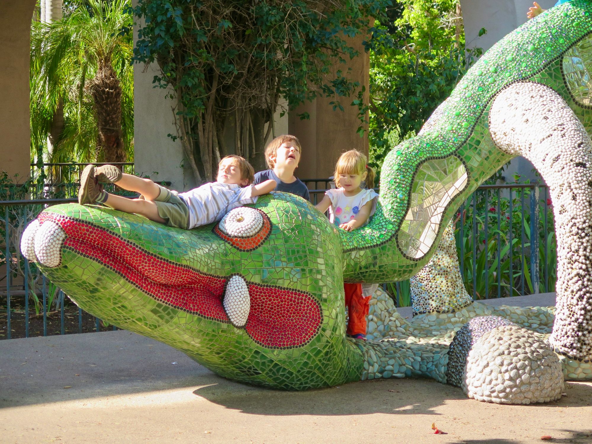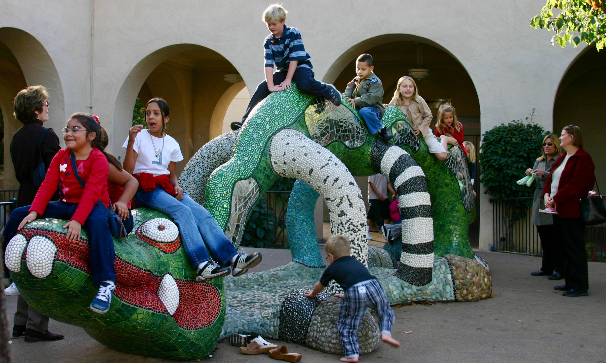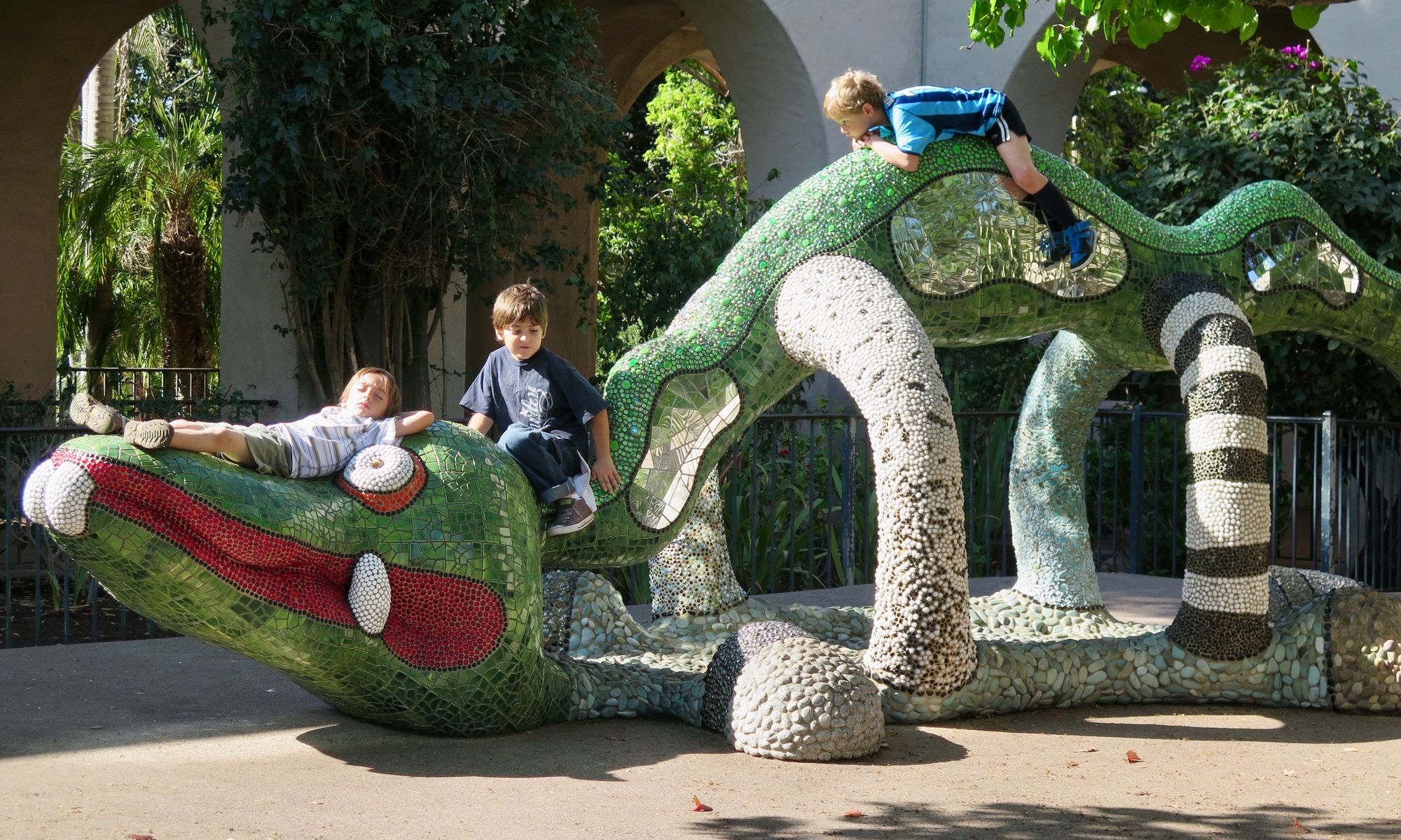 Niki de Saint Phalle is a well-renowned sculpture artist whose pieces have enlivened parks and museums across San Diego. One of the most kid-friendly of her pieces, the "Nikigator" is a large, reptilian figure that invites climbing and play. The tiled creature is just one of many of de Saint Phalle's works scattered around San Diego and Escondido — a point of public pride.