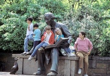 "Make Way for Ducklings" is a major draw in the Boston Public Garden. The artist, Nancy Schön, says that she wanted her sculpture to be interactive and touched, while also teaching a lesson. The sculpture brings to life the classic children's book by the same title, written by Robert McCloskey. The book takes place in the very park where the statue now stands; with Schön seemingly dropping characters from the storybook straight into the book's real-life setting.