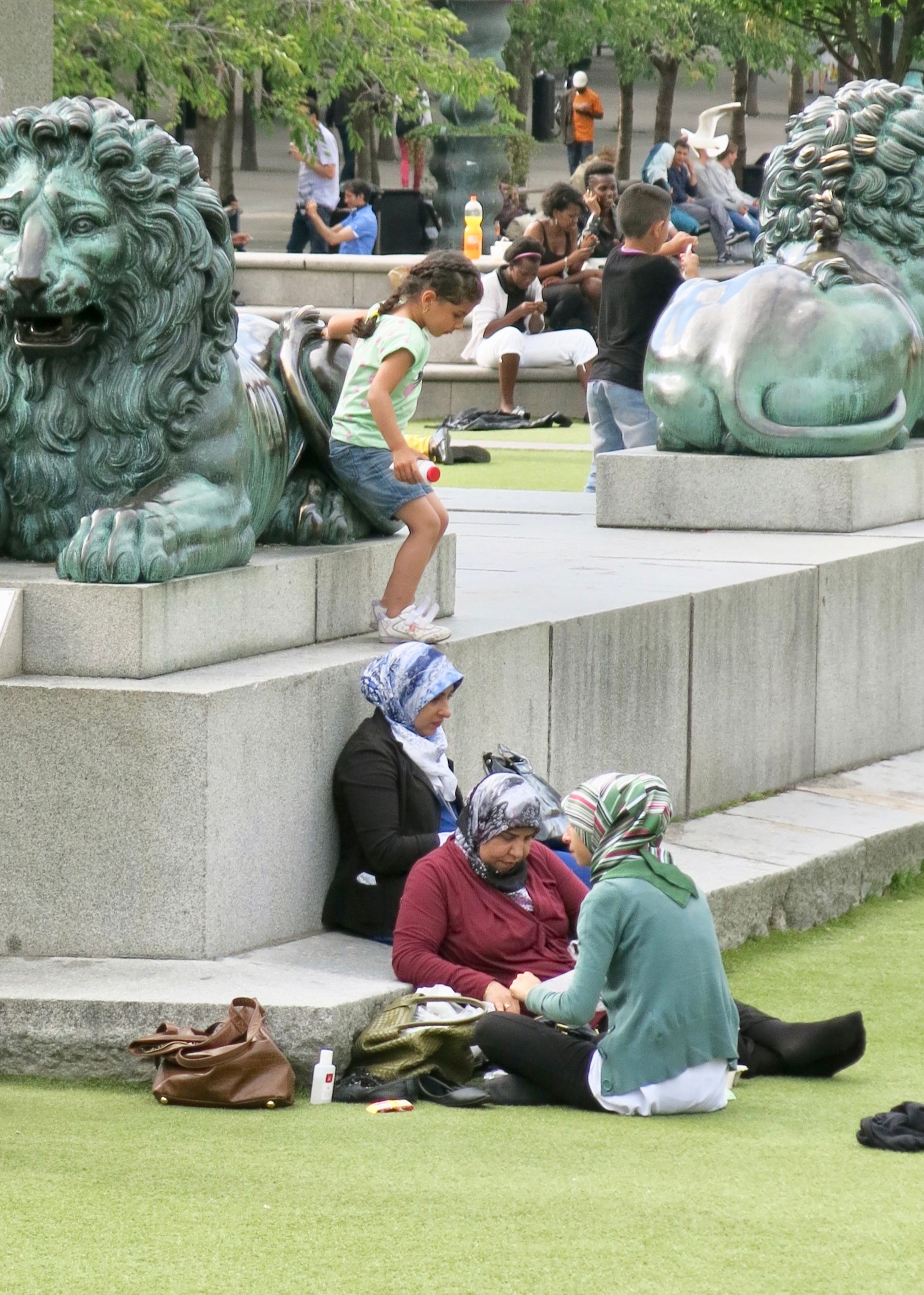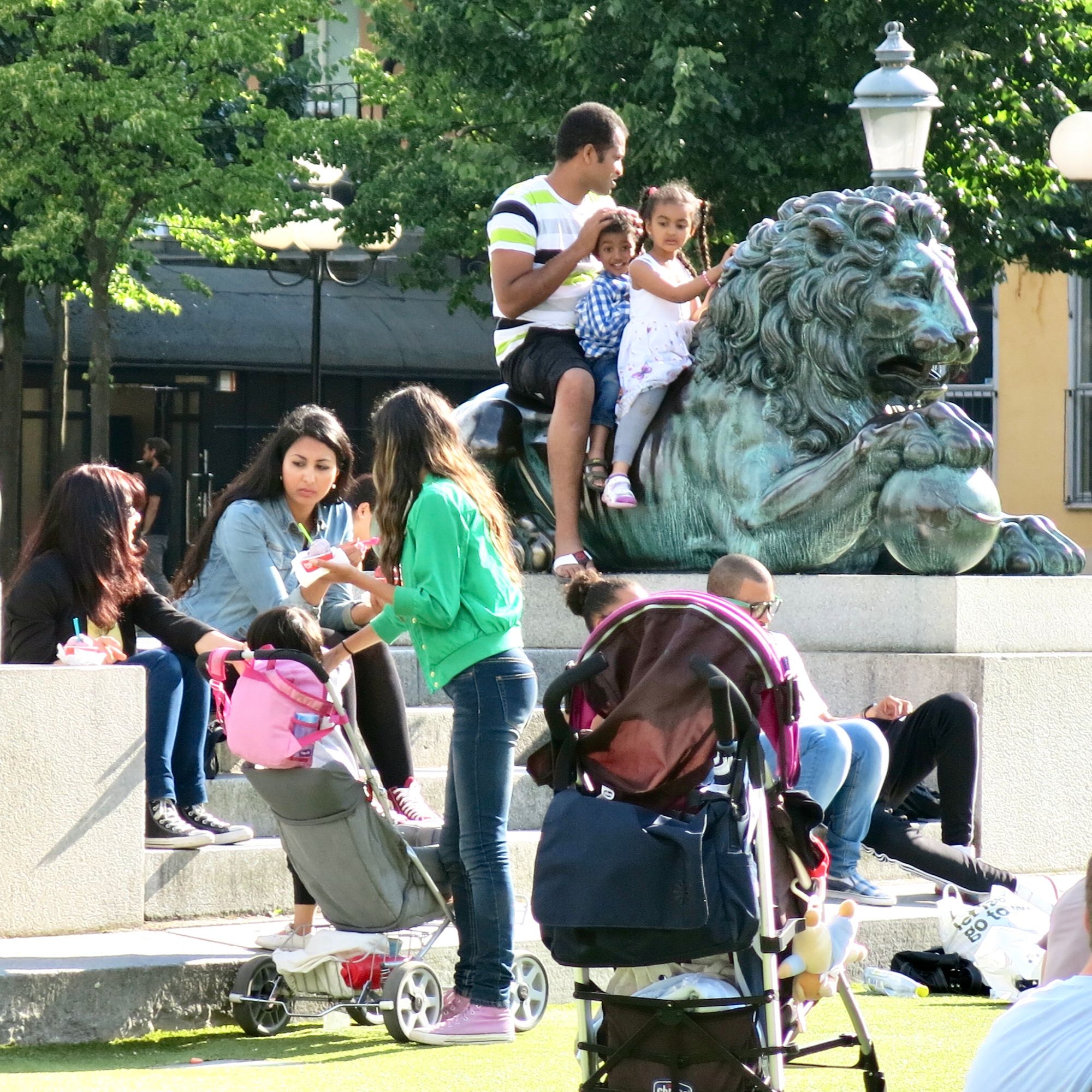 These lion statues in Stockholm's Kungsträdgården are delightfully climbable, sittable sculptures, inviting visitors to get up close. The fact that these statues are situated so close to a set of steps and ledges is further enticement for young visitors to find a higher perch while their friends and family sit nearby.