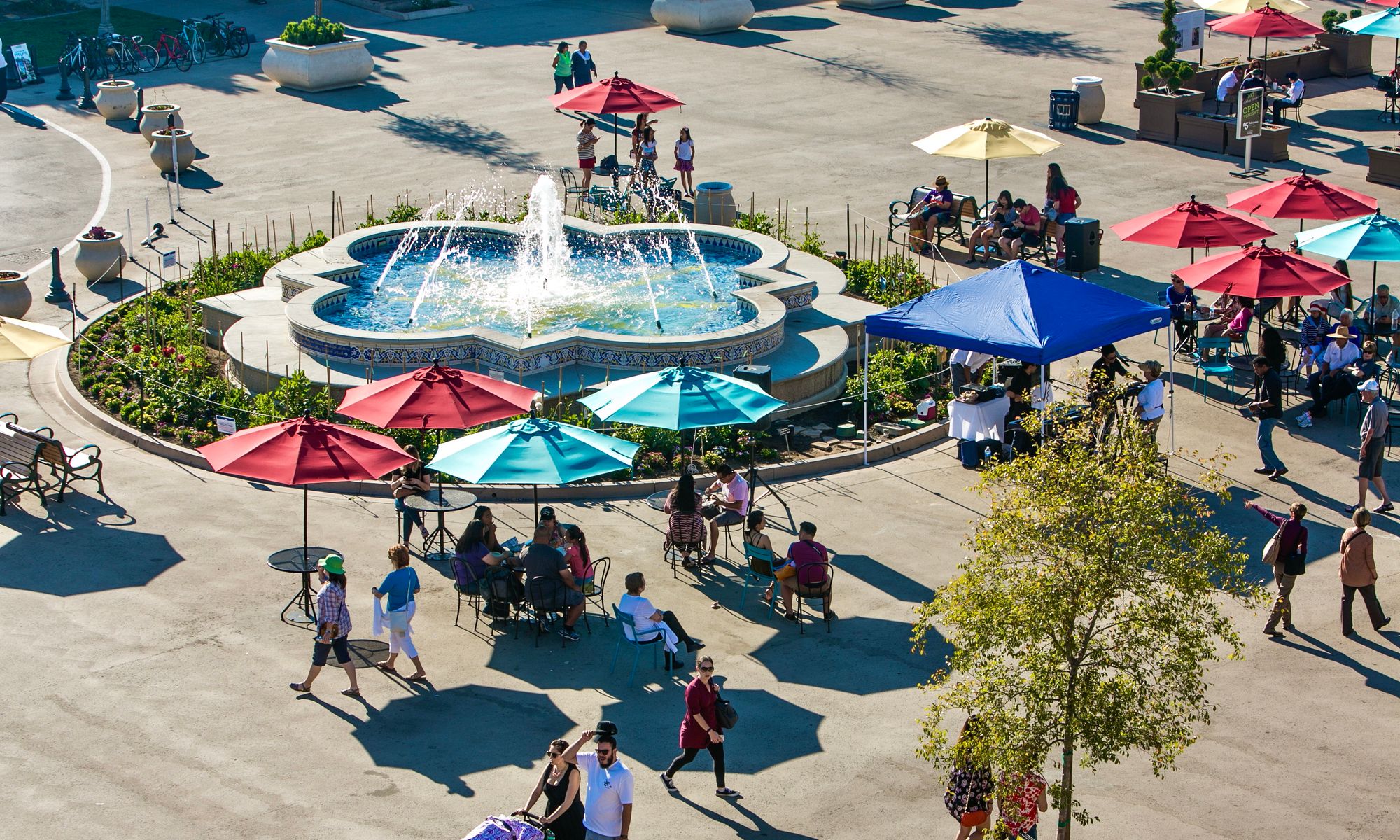 As a centerpiece in the square's amphitheater setting are its climb-able lion statues. These are a particularly playful feature, and a definite draw for kids, year-round.