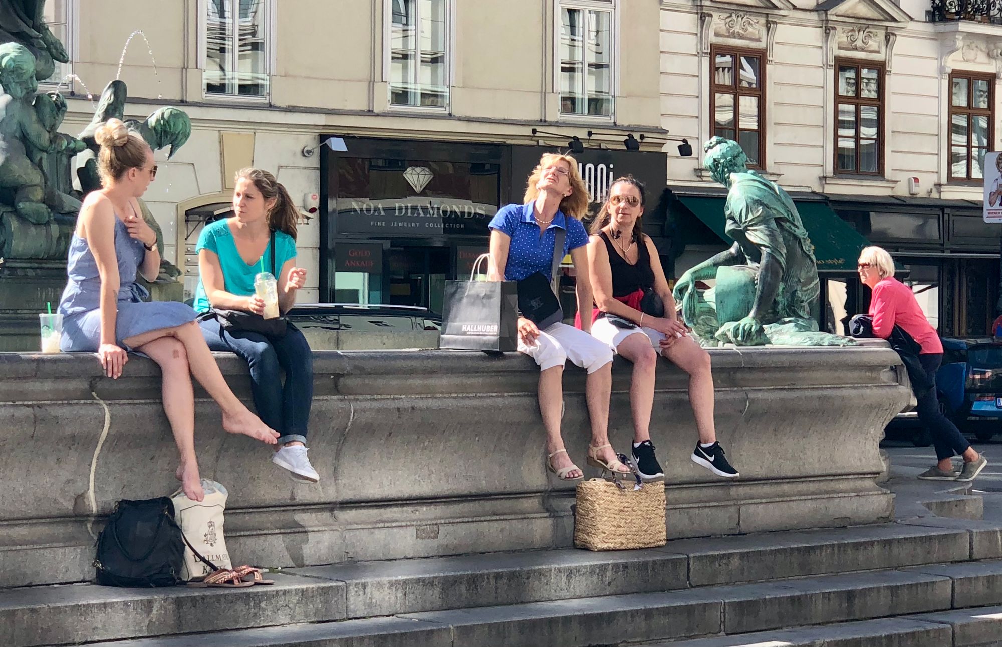 The historic center of Vienna has multiple squares and plazas. Most seem to revolve around features that give an identity to the place. One such feature that is a major gathering place is The Fuente de Donner (Donnerbrunnen), built in 1739, is in a long plaza adjacent to the main pedestrian street, Graben. Like in many of our examples, its steps and ledges seem to call out to passersby, encouraging them to take a moment to stop and rest.