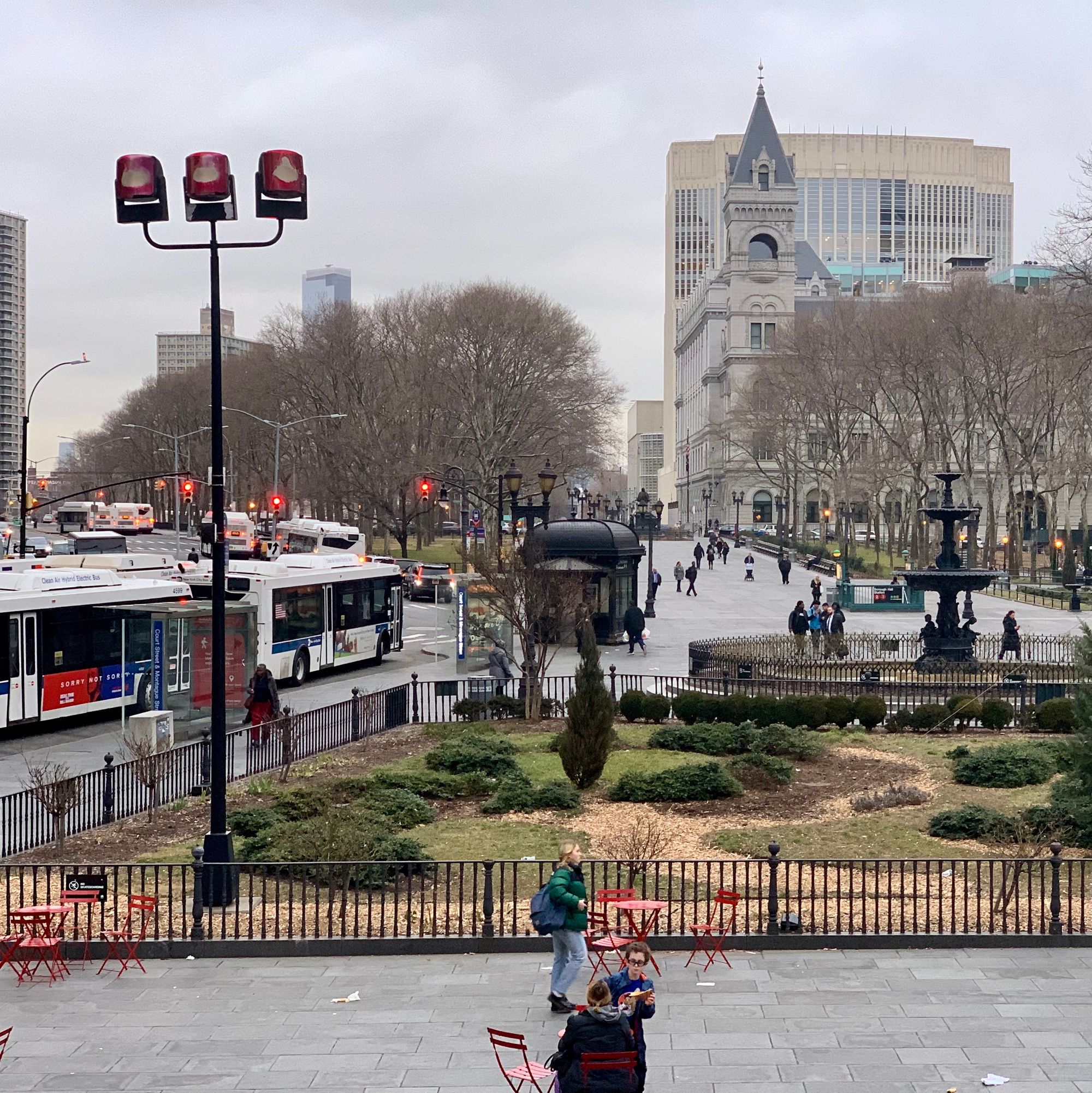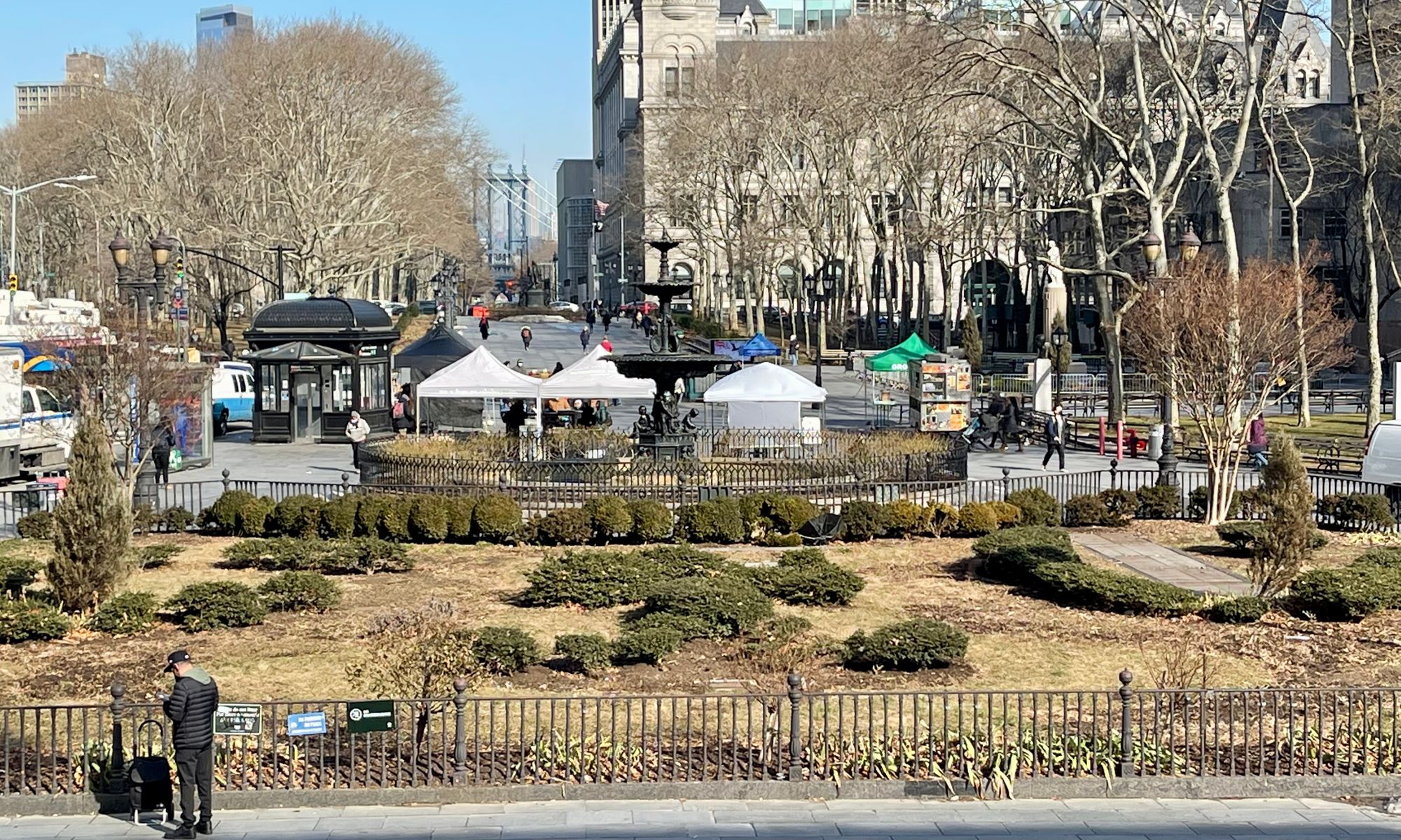 In Brooklyn's Borough Hall - Cadman Plaza, we can see an example of a lost opportunity. The fenced-off planted area may be a nice feature, but it also acts as an empty space in the larger area. If woven together, the area could become the "Heart of Brooklyn." Instead of a place set apart by a fence, this could be something more socially active, like a temporary cafe with a kiosk.