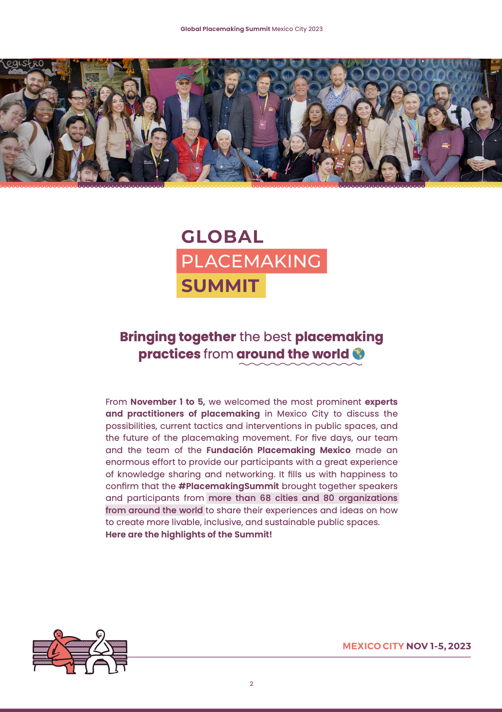In November, we participated in the first Global Placemaking Summit, organized by our partner organizations – PlacemakingX and Placemaking Mexico. It was an incredible experience in the heart of Mexico City, where placemaking leaders from all around the world gathered to share their experiences, inspire each other, and pave the way for the movement’s next steps.