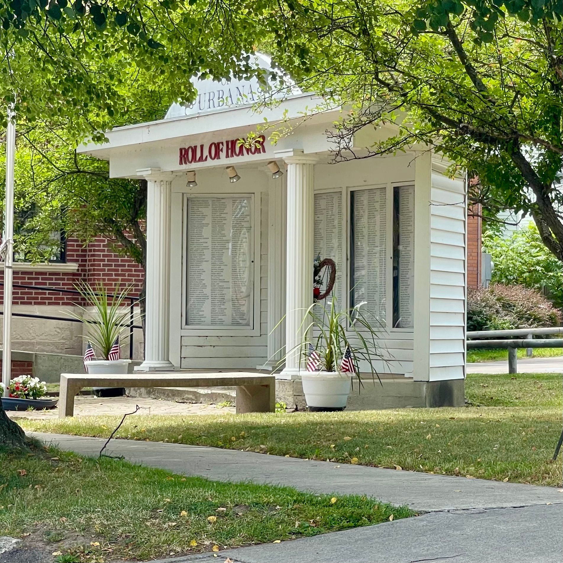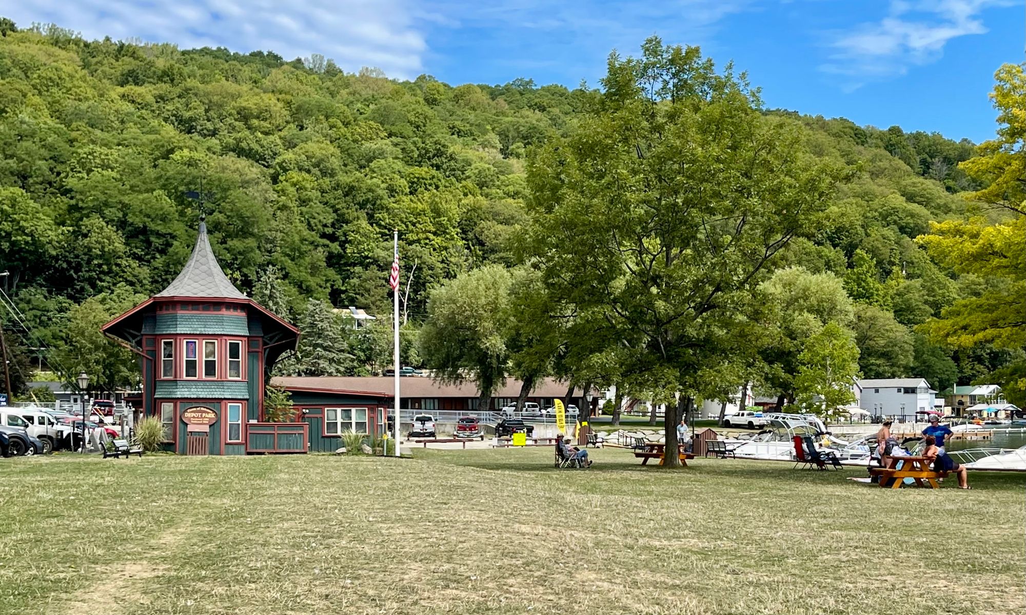 Keuka Watersports, lake shop and boat rentals and police station on the waterfront, church on the square, bed and breakfast and gazebo and seating in the town square.