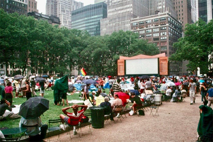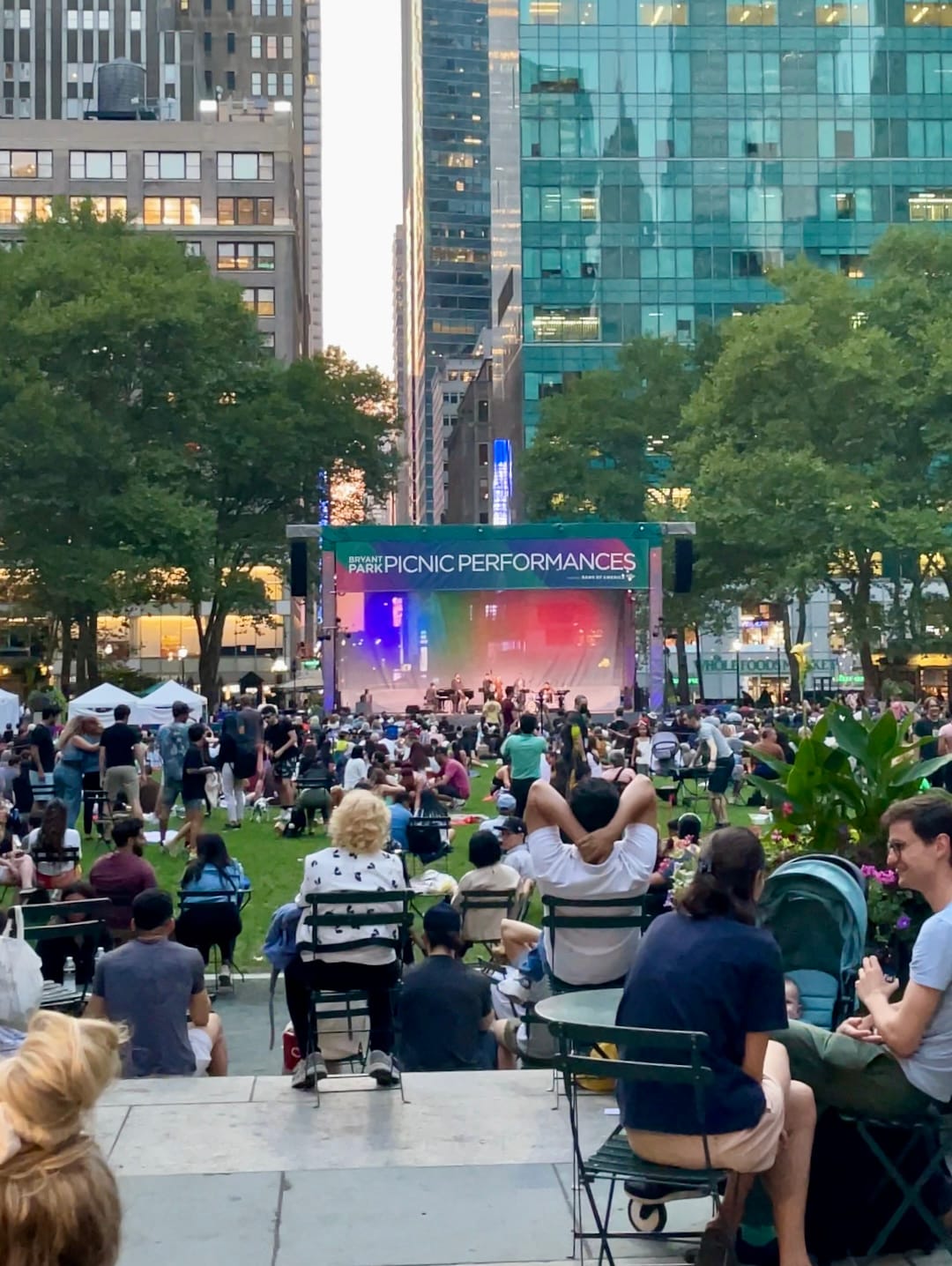 The summer marks movie and concert season in Bryant Park. A huge stage is set up on the great lawn, and signs display a packed schedule of screenings and performances. When the weather is nice (and even when it isn't), the park is packed with excited attendees. People bring picnic blankets and snacks and enjoy a memorable show among friends, family, and neighbors.