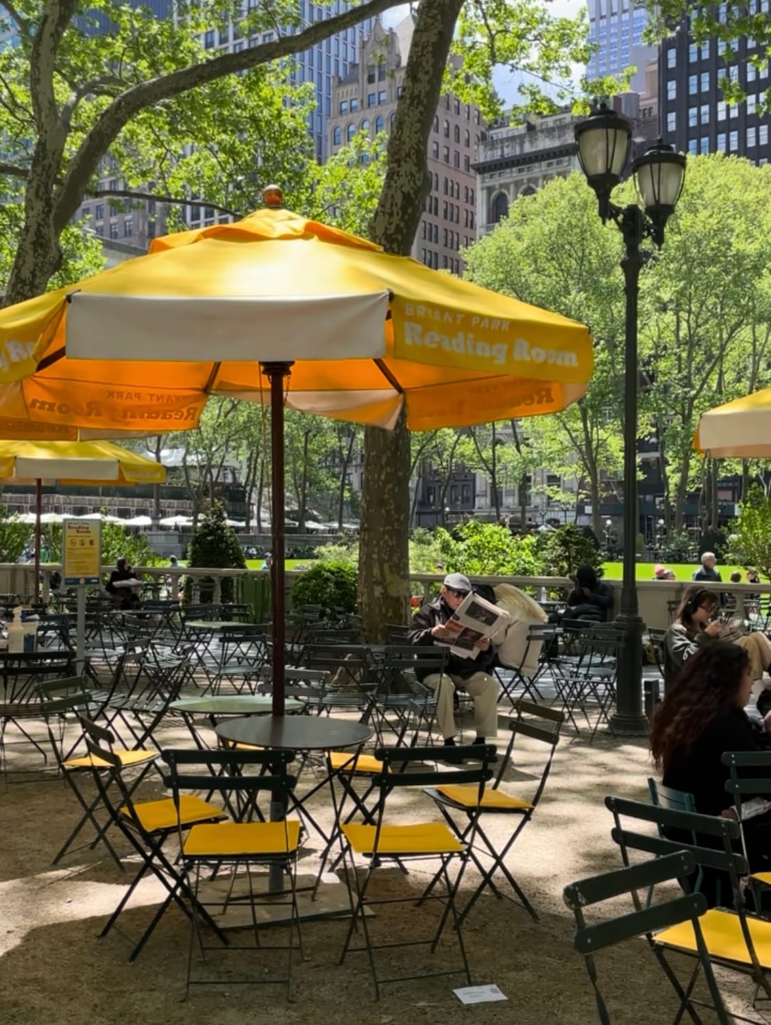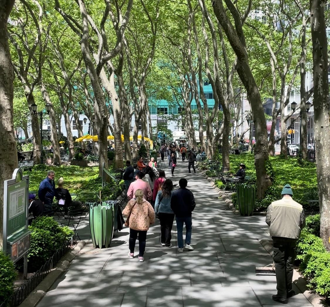 Bryant Park's ample trees create a refreshing and enjoyable atmosphere. Without them, the sun would relentlessly beat down on visitors, discouraging people from spending time outside. Movable chairs and tables under the trees along the alleys let people choose whether to sit in the sun or shade, so they can feel comfortable enjoying the park from morning to evening, summer to winter.