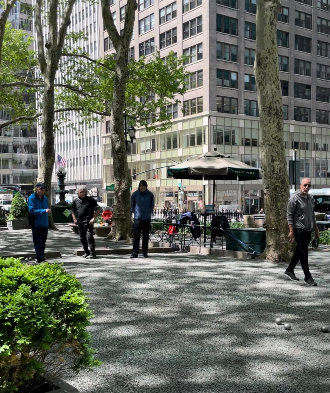 A great public place needs to offer activities for every segment of the population. Too often, elderly people are overlooked when activities and play areas are introduced. Games like petanque are fun and accessible for people at every age. The petanque courts in Bryant Park are always in full swing.
