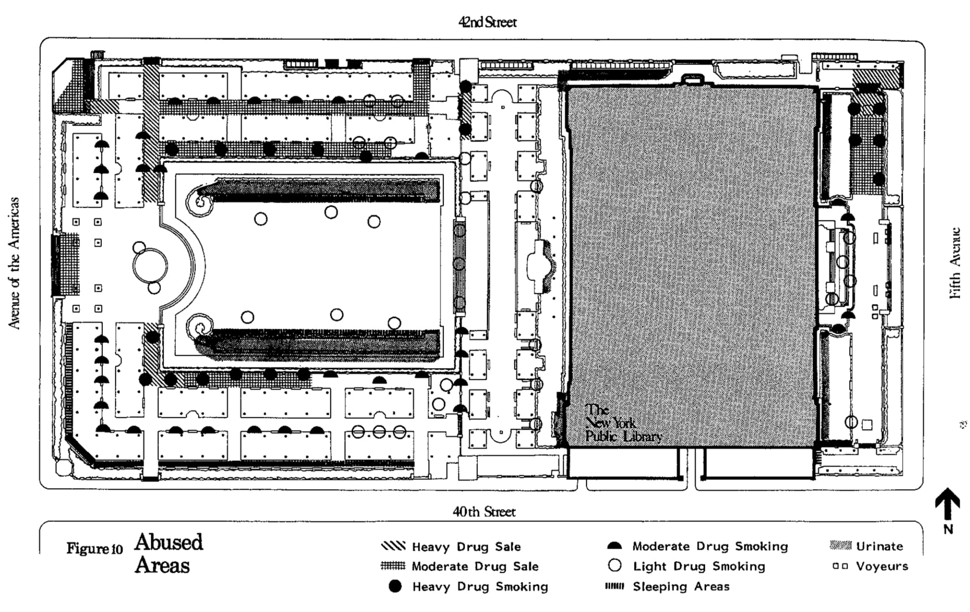 By the 1970's, multiple drug-dealing groups worked in different parts of the 9.6-acre park, discouraging people from entering or visiting. Litter was strewn across the grass and graffiti marred the monuments. This diagram, created by PPS, shows the park area with the highest levels of abusive behavior: