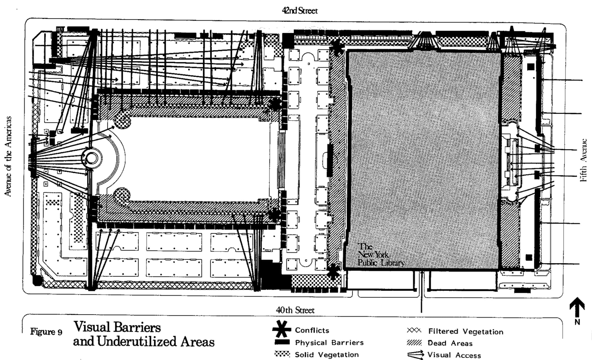 Bryant Park is surrounded by low walls and iron fencing, which cannot be significantly altered under New York City landmark law. By the 1970's, hedges and landscaping had matured, further obstructing views of what was happening inside the park, making it feel unwelcoming to passersby (hedges also reduced visibility and accessibility inside the park). The PPS diagram below shows the obstructed views around the entire park: