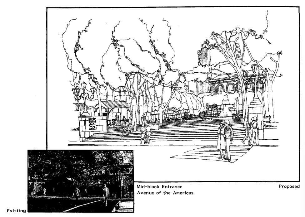A new entrance at the corner of 42nd Street and Avenue of the Americas was one of the most dramatic design changes. In addition to widening this entrance and taking down walls, food kiosks and cafe seating were added. These activities "reach out" to people on the street and invite them in, while also creating an informal security presence at a key location where drug dealing once flourished.