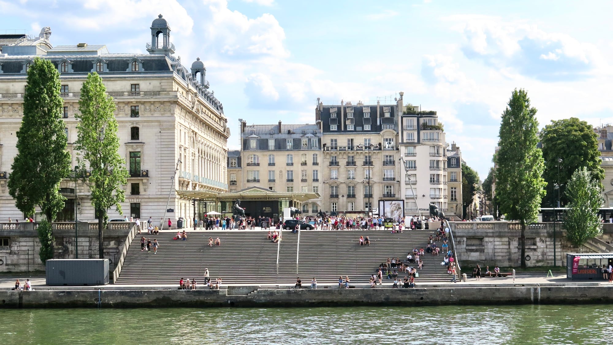 The Musee d'Orsay is unique because of its location along the water. It makes the most of this positioning by interacting with the heavy foot traffic in the area through outdoor art installations and programming. Doing so shares the arts with the public beyond the walls of the museum.