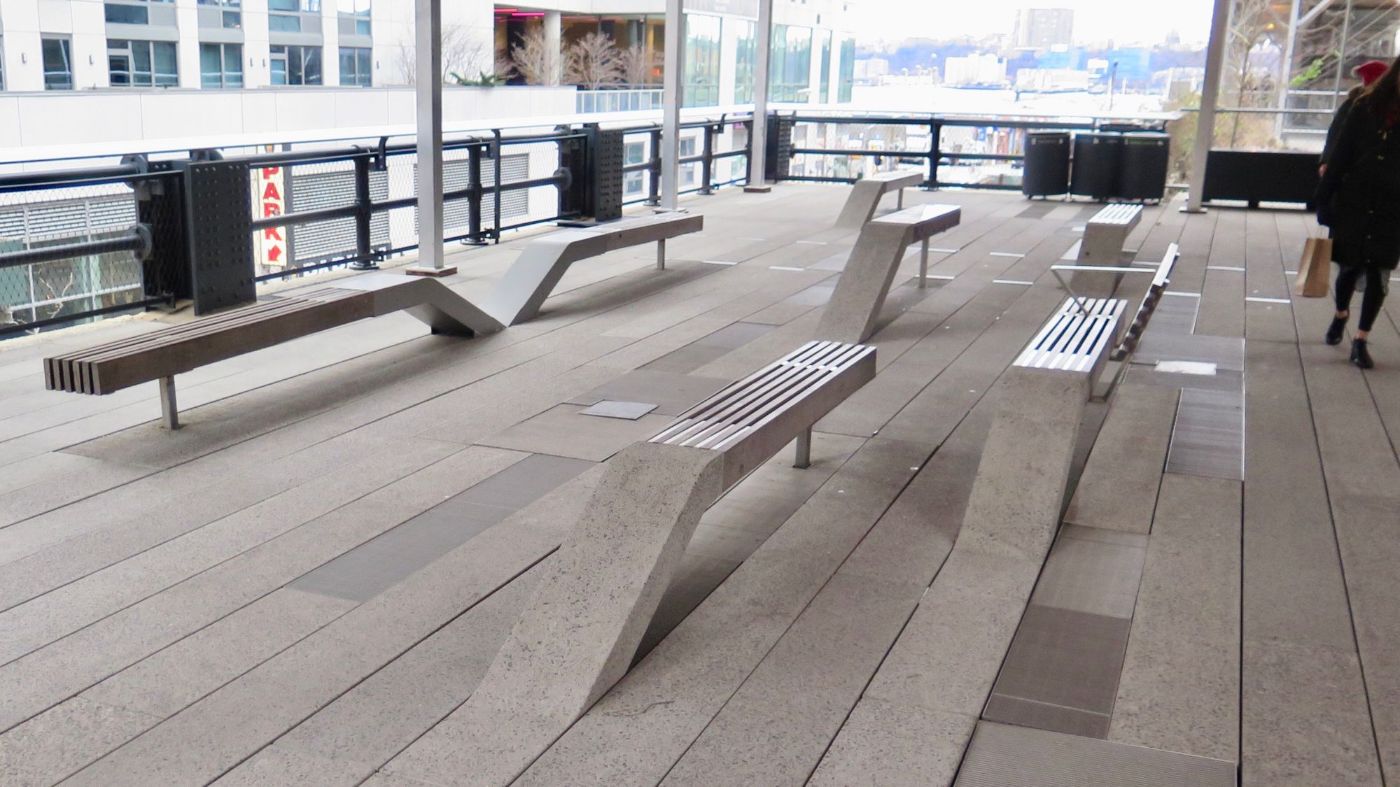 Lack of good seating: Comfortable spots to sit are rare on most city streets, despite their importance to older people and anyone who wants to relax a bit. Clockwise from the top: 1) This couple is "social distancing" before the concept was invented; 2) This woman had nowhere to sit except on top of her child; 3) This woman and her dog, as well as the man with a child across the street have no place to wait; 4) This man just gave up on finding a comfortable spot to rest; 5) The dismally uncomfortable seating on New York's High Line.