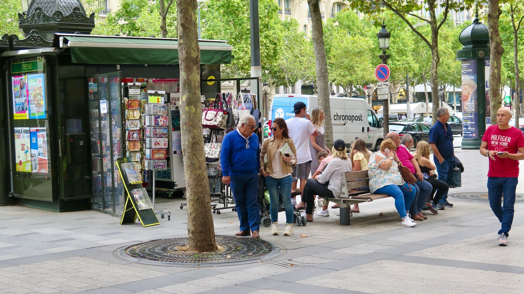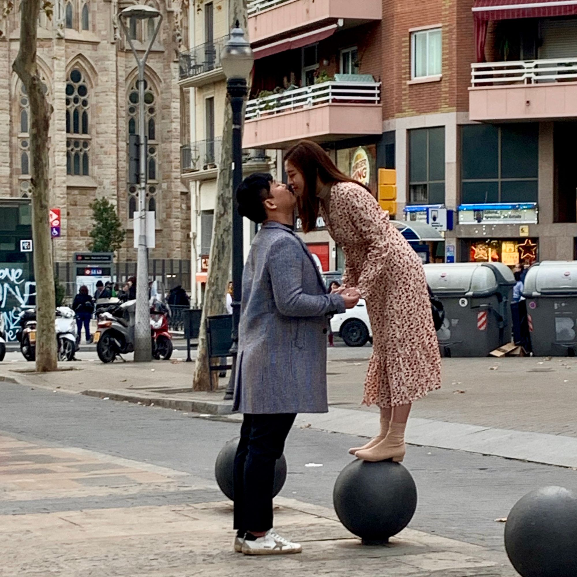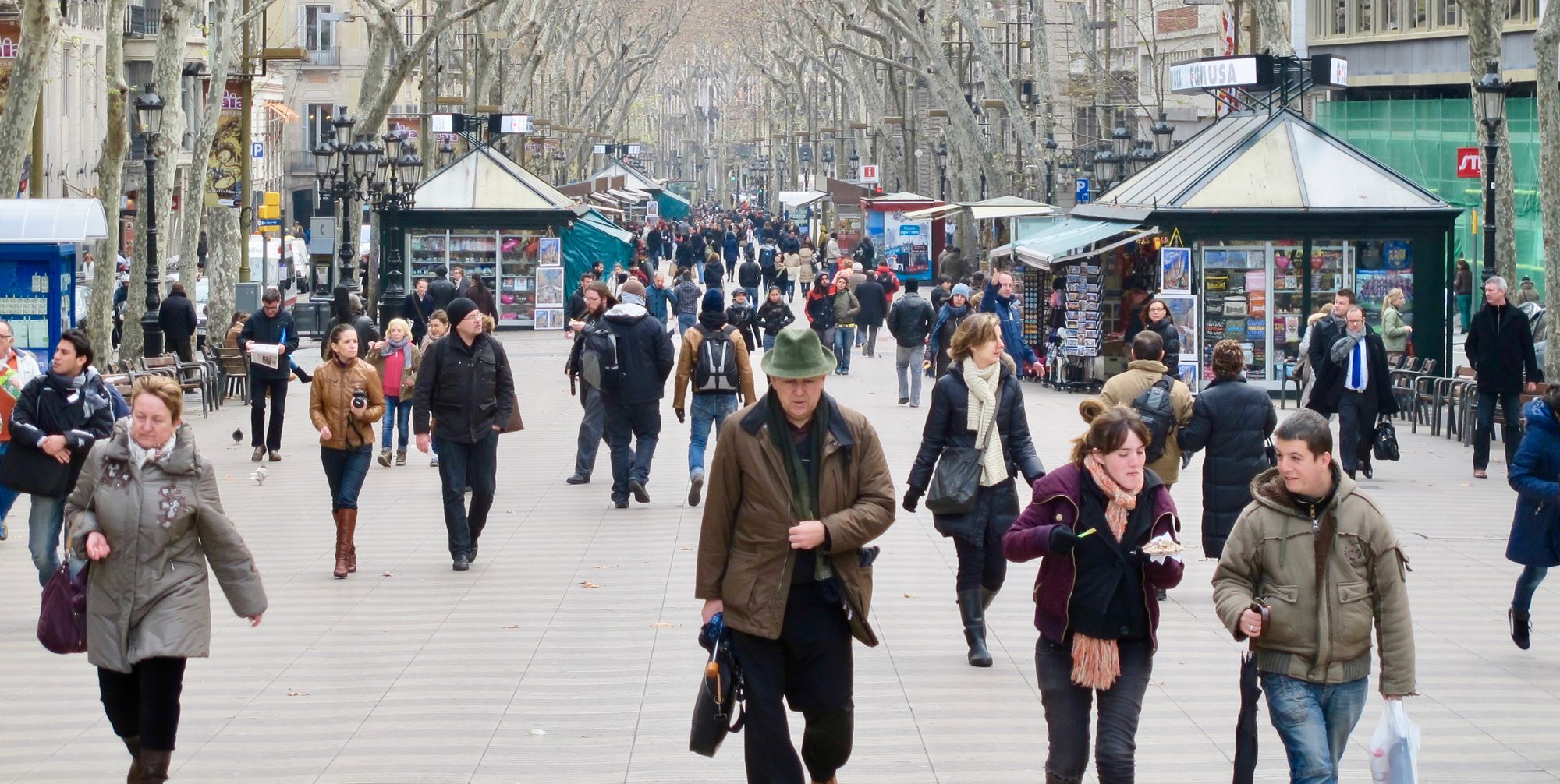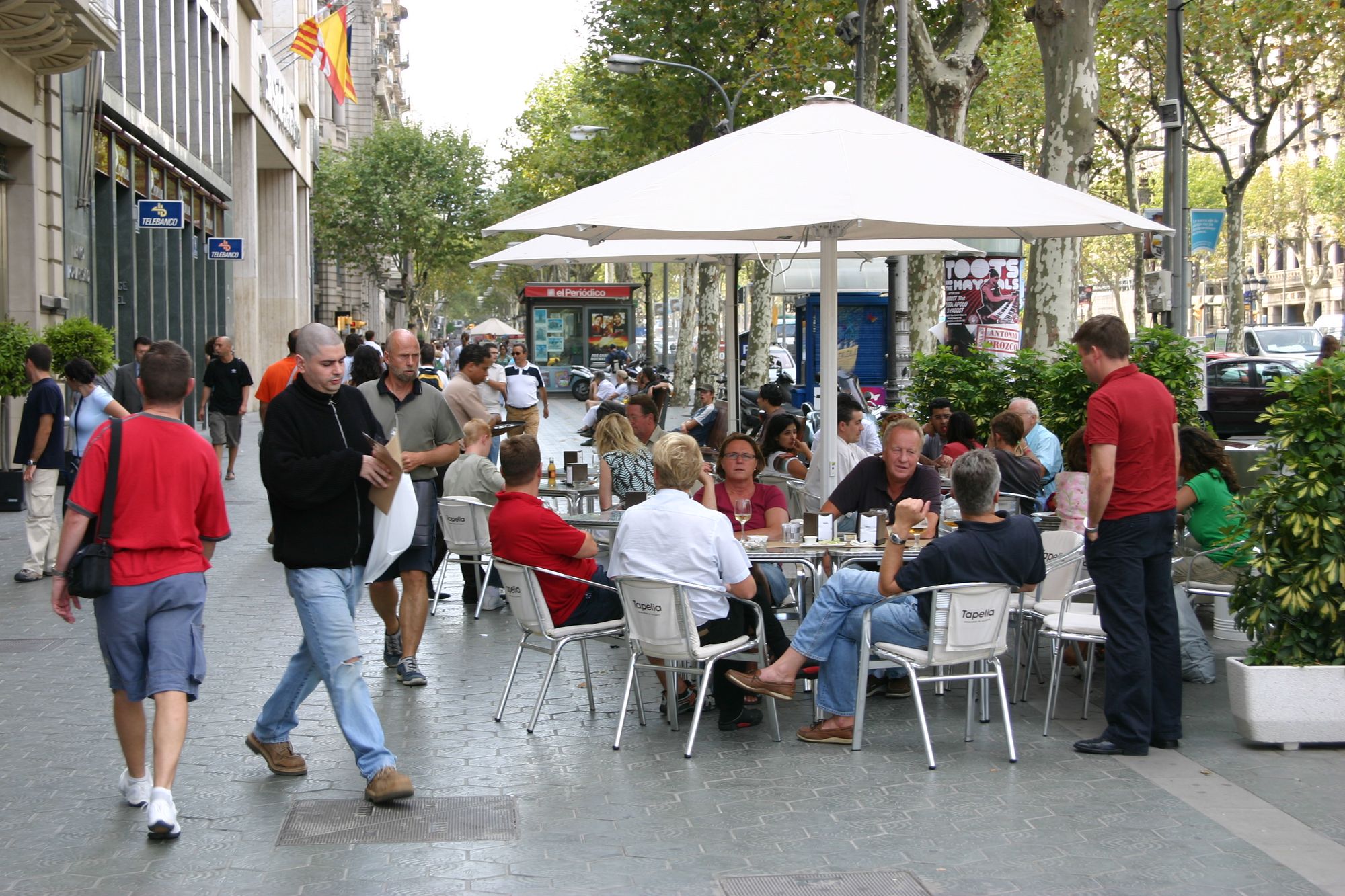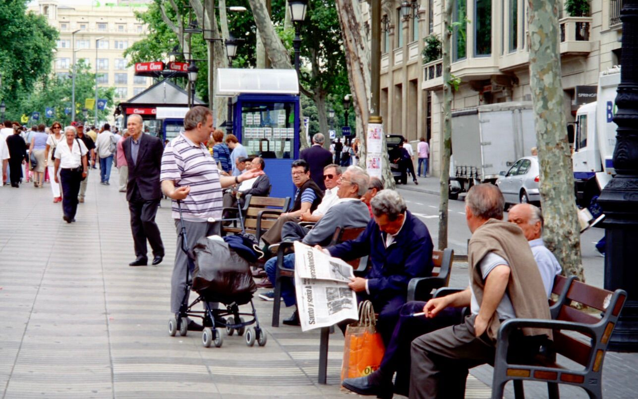 People strolling, socializing, talking at cafes...all basic activities on popular streets in Barcelona and Paris