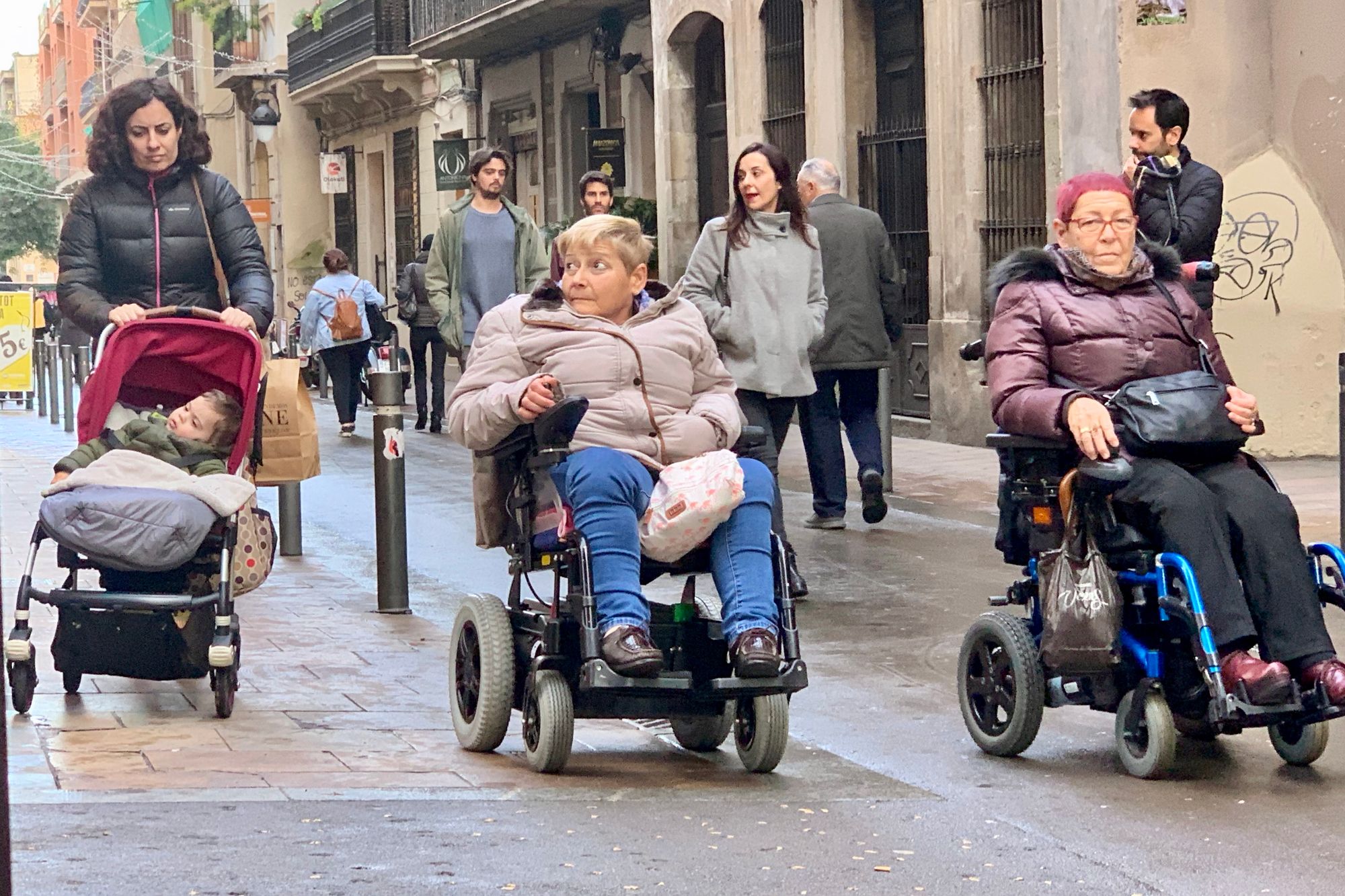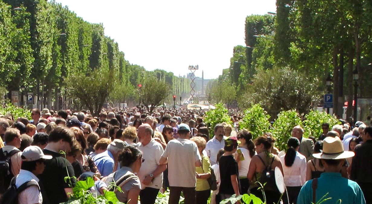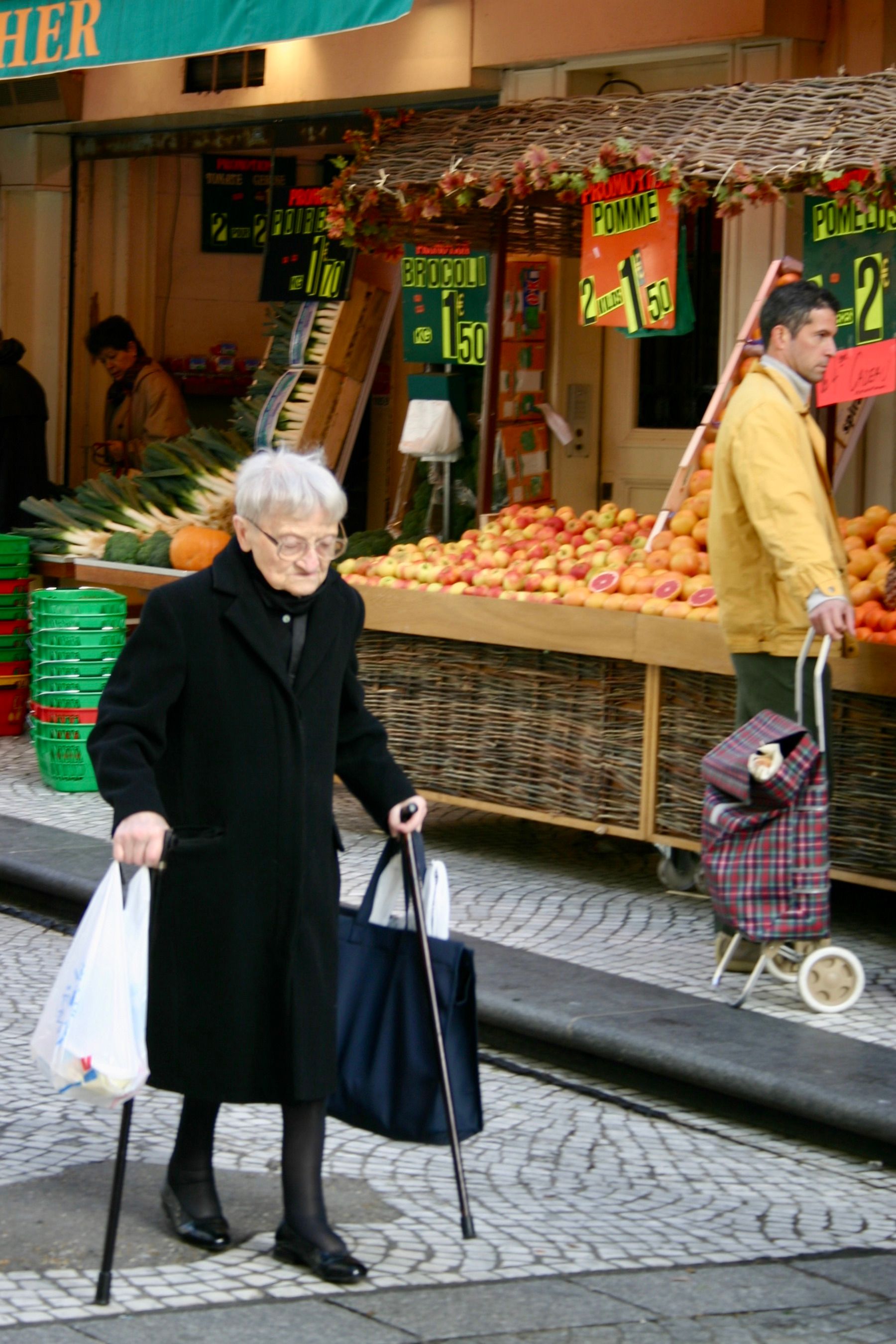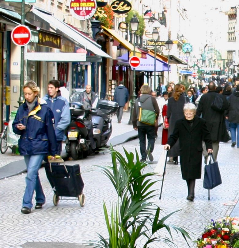 This older woman is able to live an independent life because she can do daily errands on a commercial street in Paris that is free of traffic. Taking care of people on foot is a basic responsibility for every city
