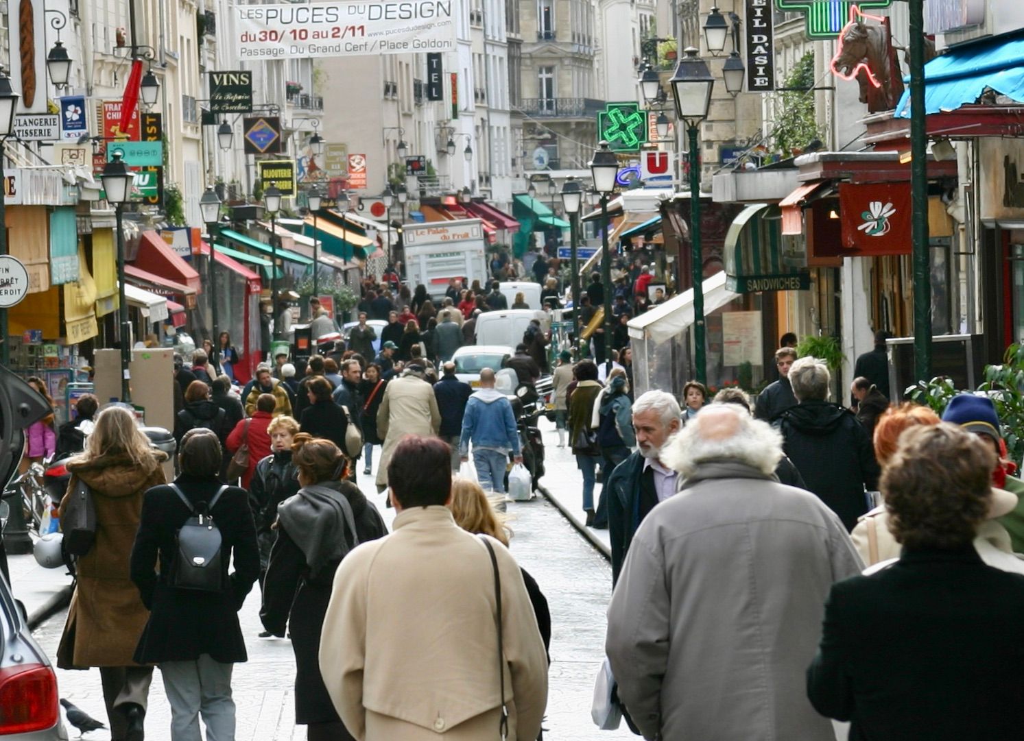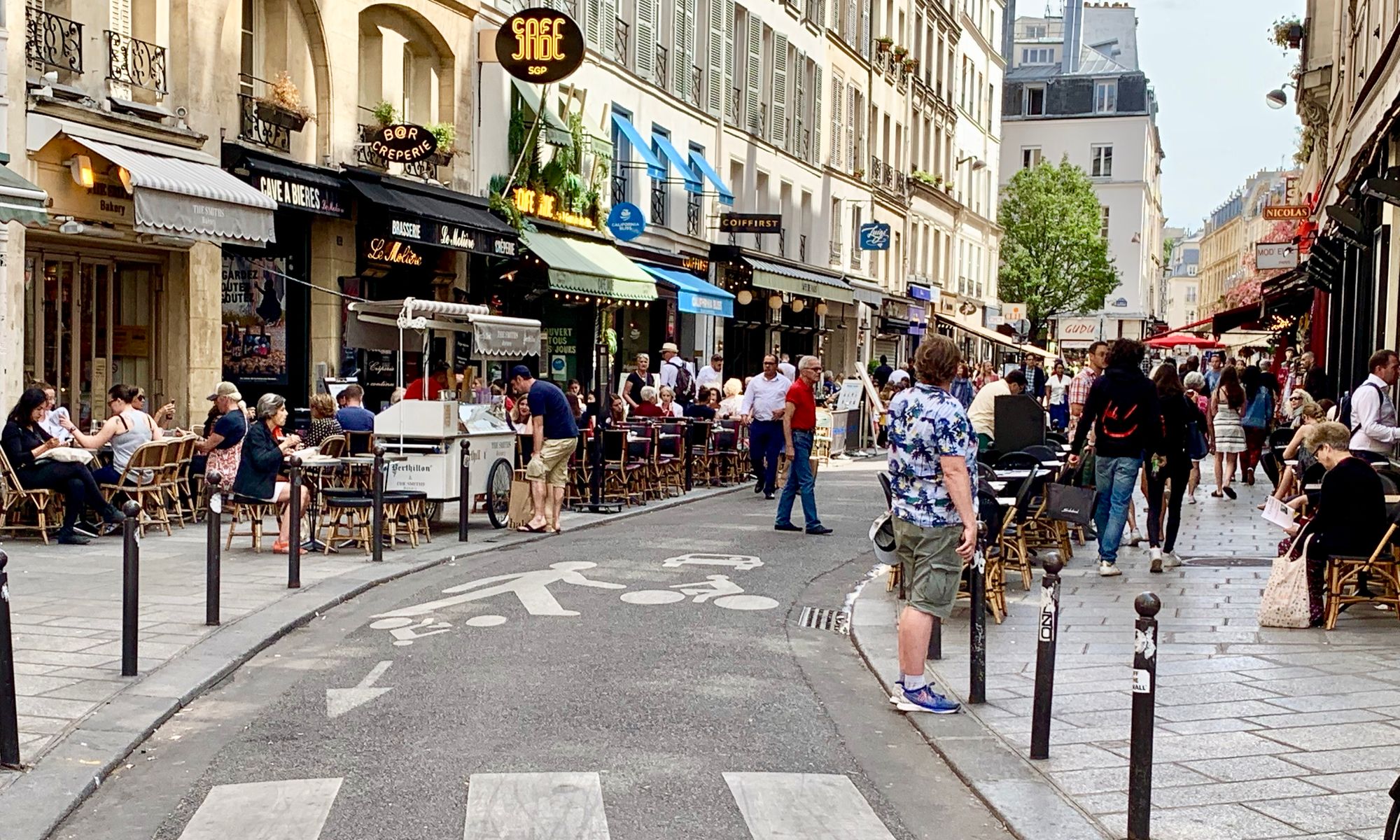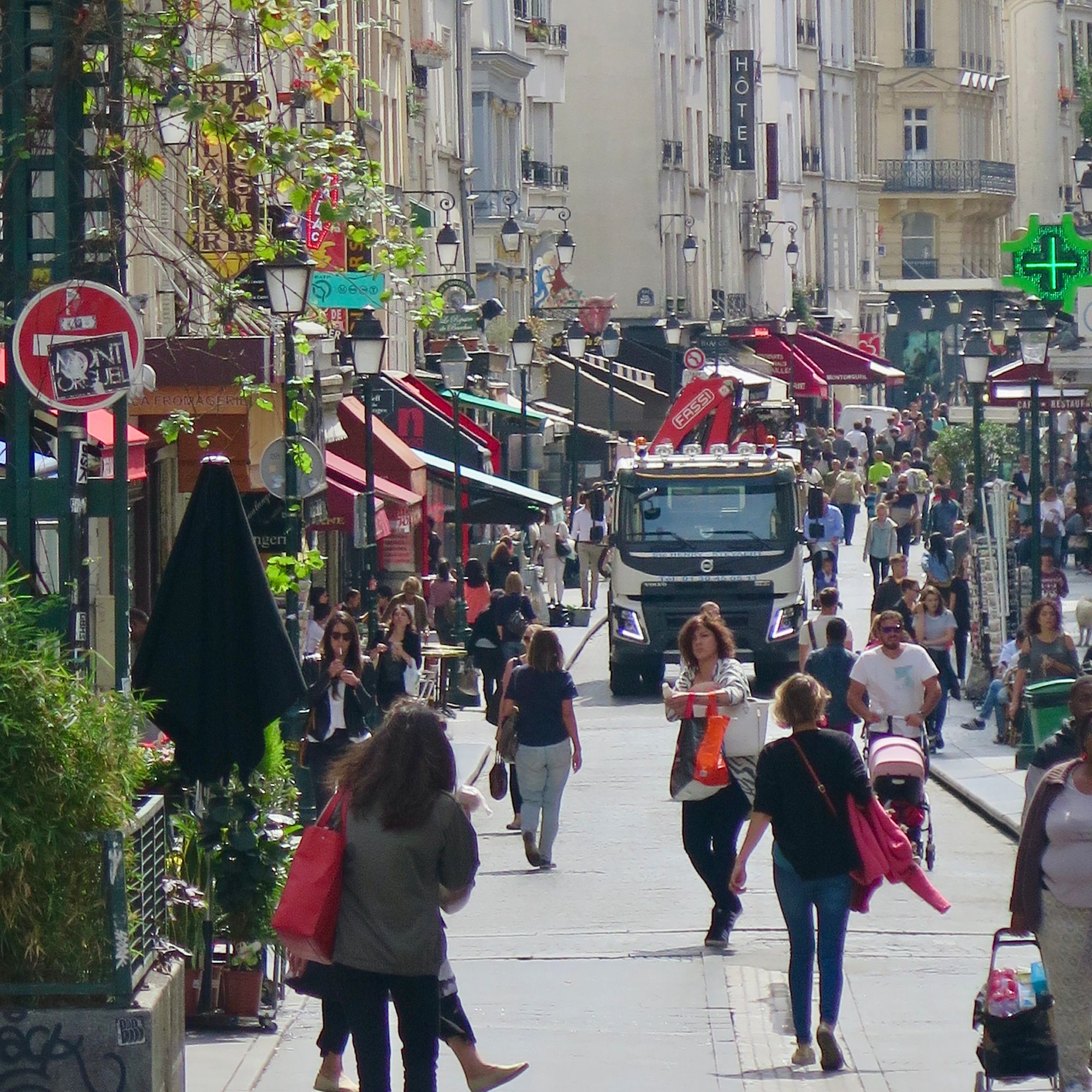 Rue de Buci and Rue Montorgueil, two of many streets in Paris that accommodate vehicles, but are primarily local community centers for residents and visitors