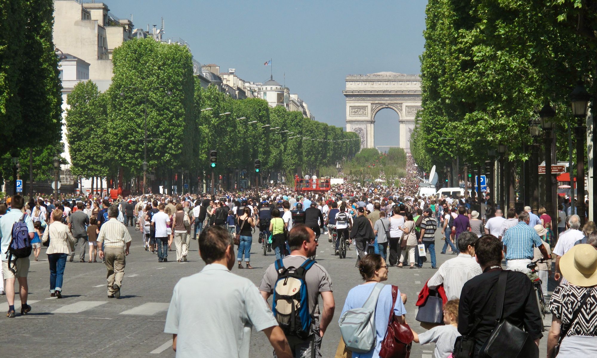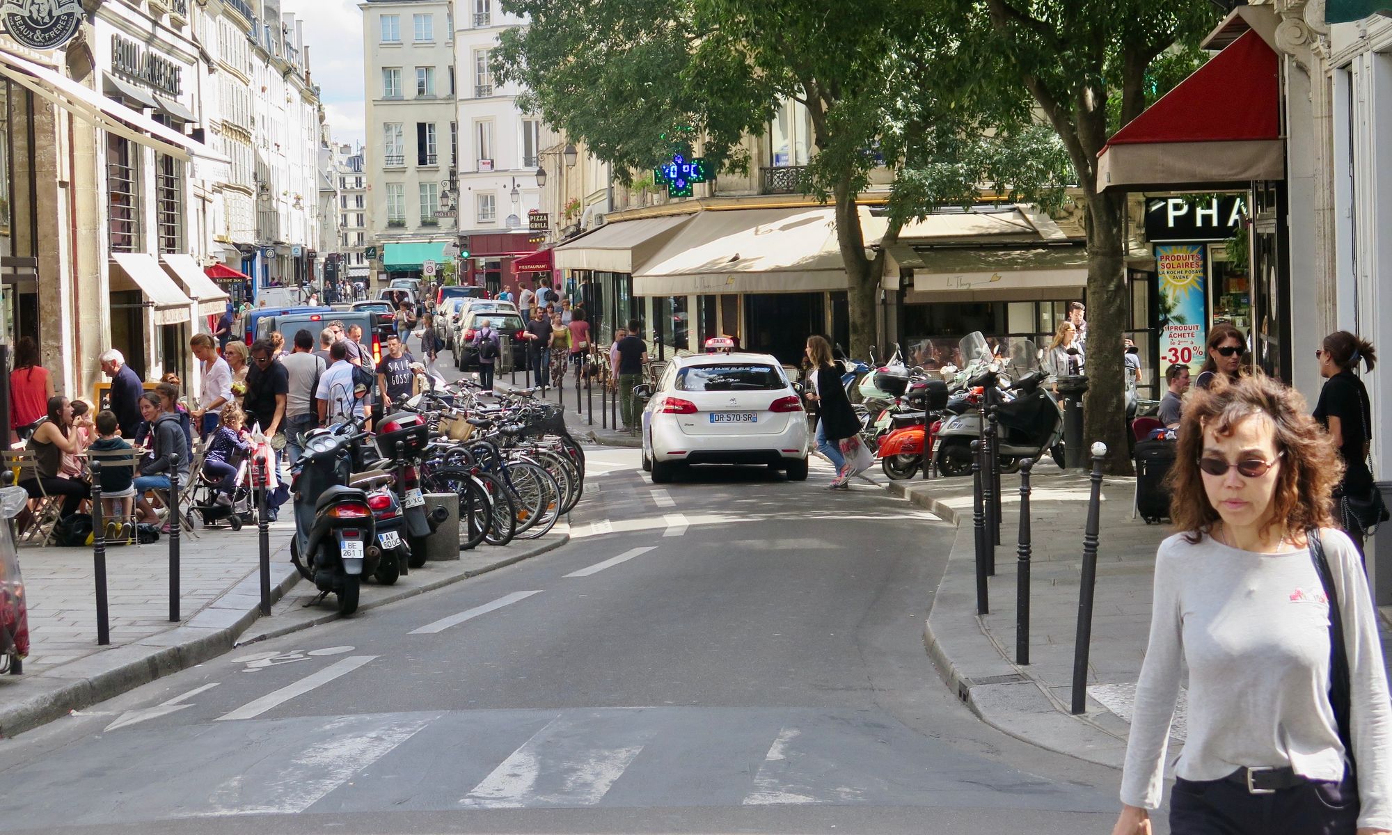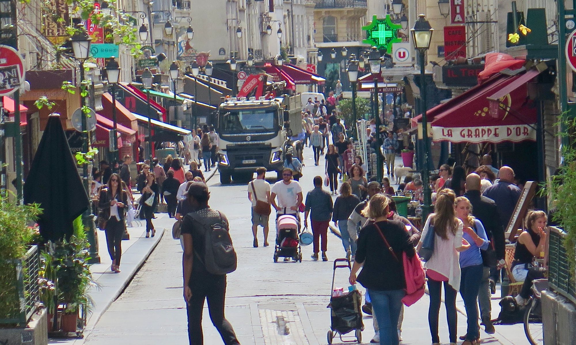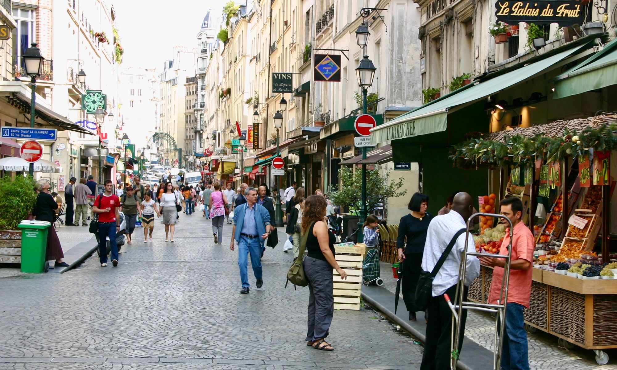 Rue de Buci and Rue Montorgueil, two of many streets in Paris that accommodate vehicles, but are primarily local community centers for residents and visitors