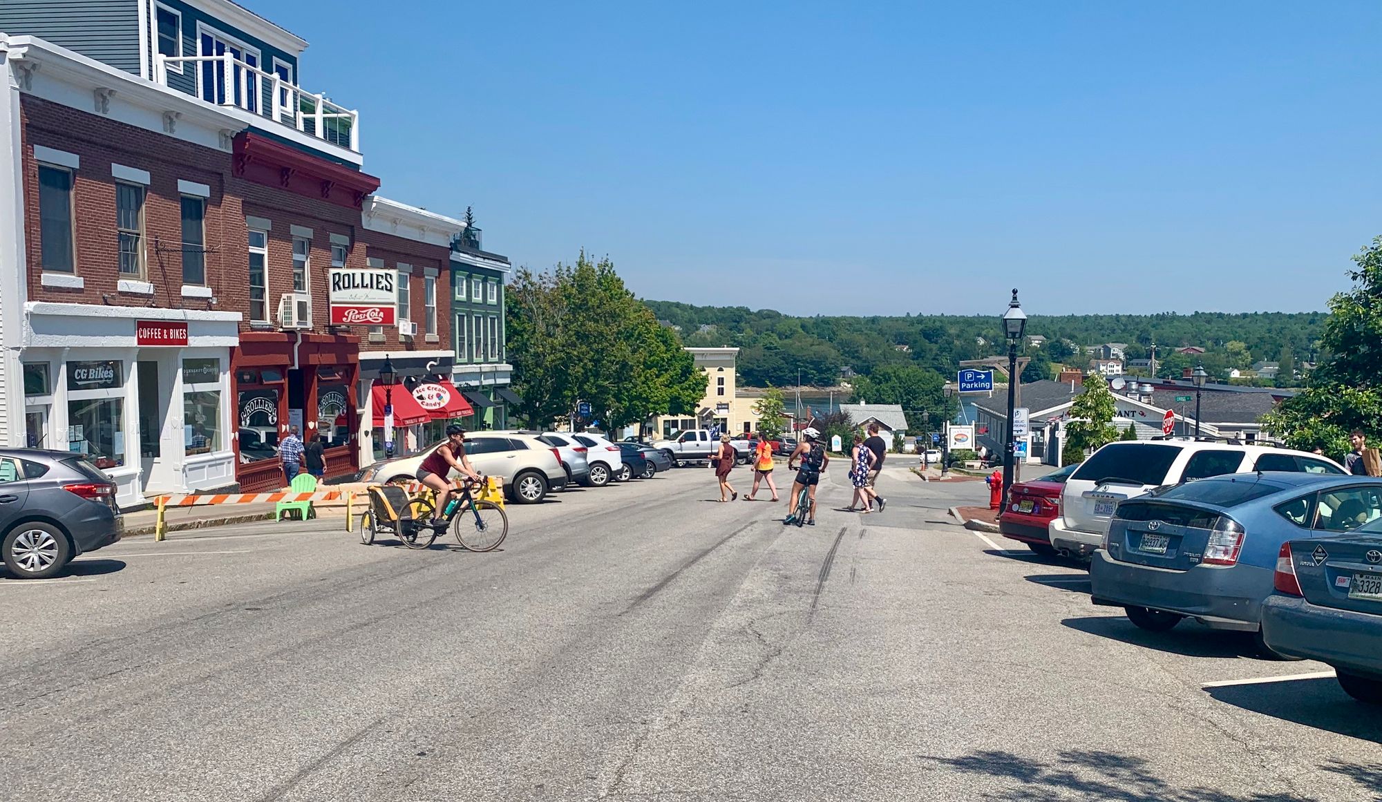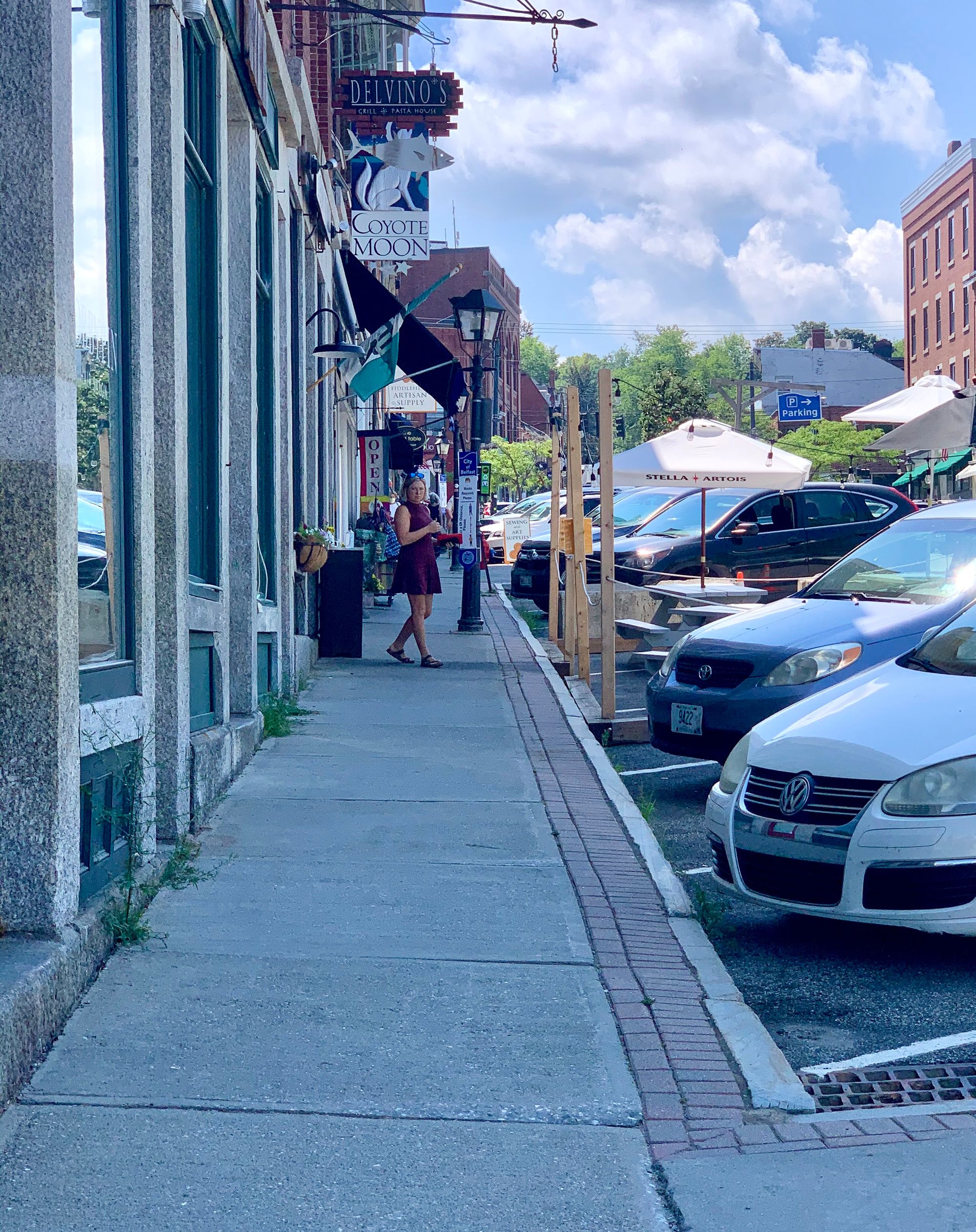 Belfast, Maine, a beautiful downtown with narrow sidewalks and a far too wide and dangerous street. This scene is common in most communities.