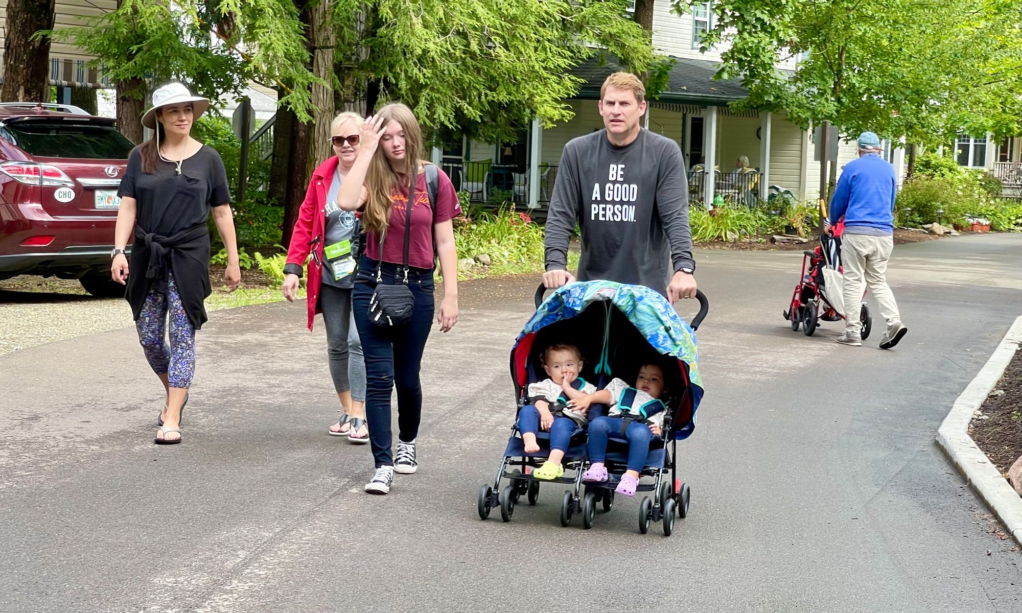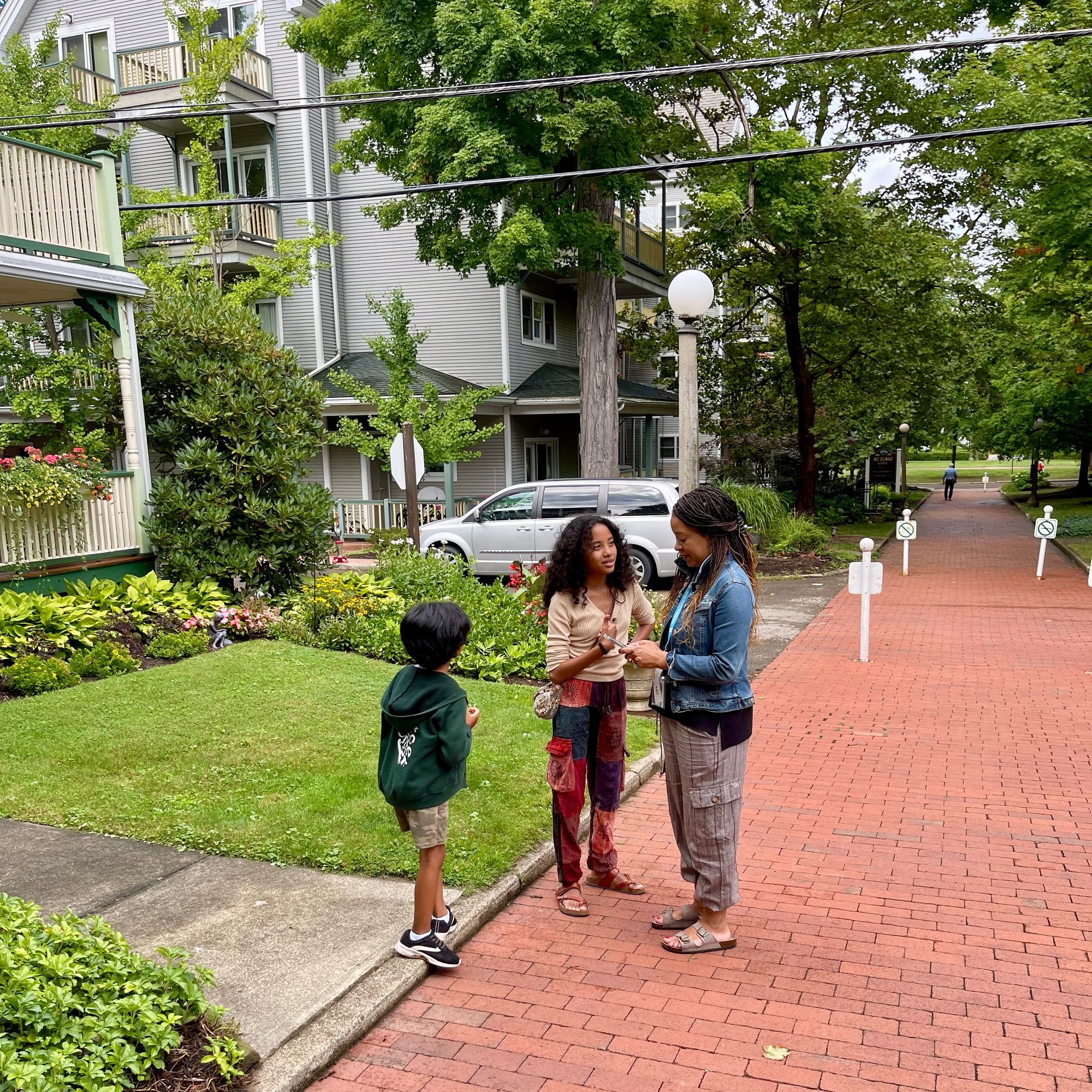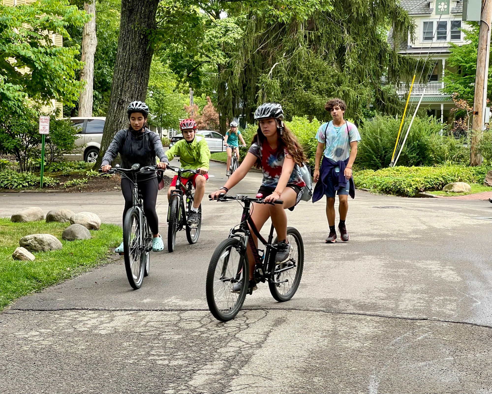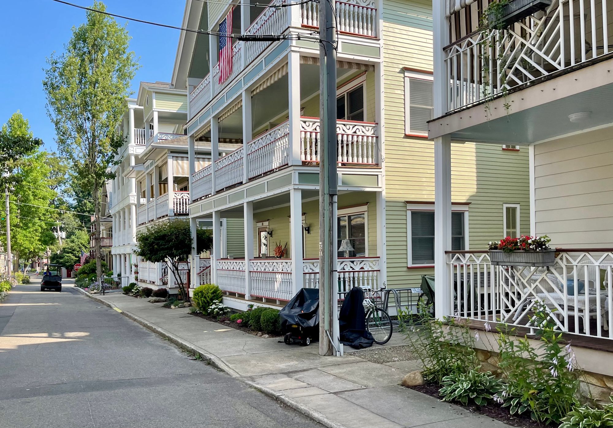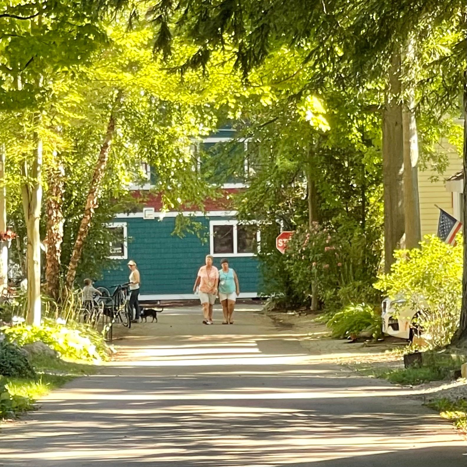 Chautauqua in Western New York was built in the late 19th Century and is known as "An American Utopia" because of how it focuses on community, nature and beauty, rather than on vehicle throughput. On many of the streets here, people share the space - walking, riding bikes, playing and jogging, all in the same place where cars are because speed limits are only 12 mph. It is understood that the streets are not the domain of cars but that they are shared by everybody.