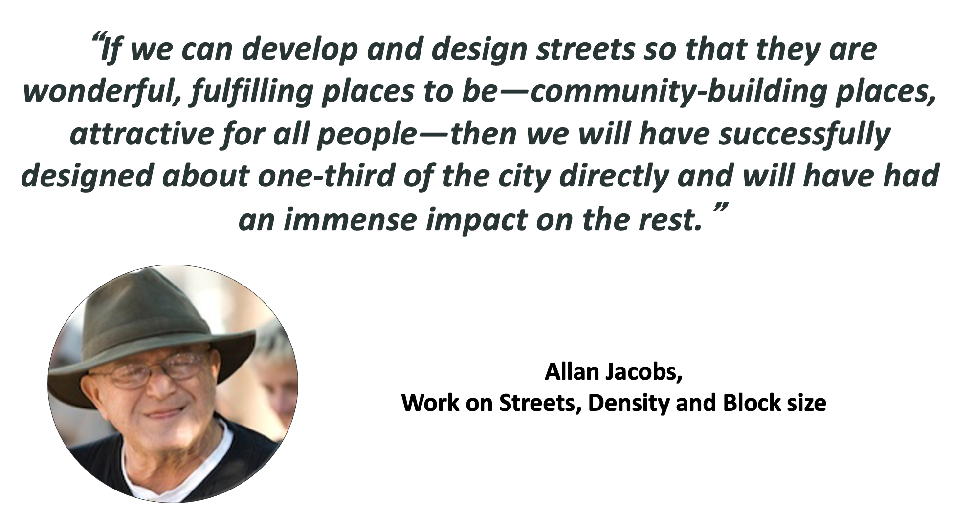 "If we can develop and design streets so that they are wonderful, fulfilling places to be—community-building places, attractive for all people—then we will have successfully designed about one-third of the city directly and will have had an immense impact on the rest." —Allan Jacob, Placemaking Pioneer