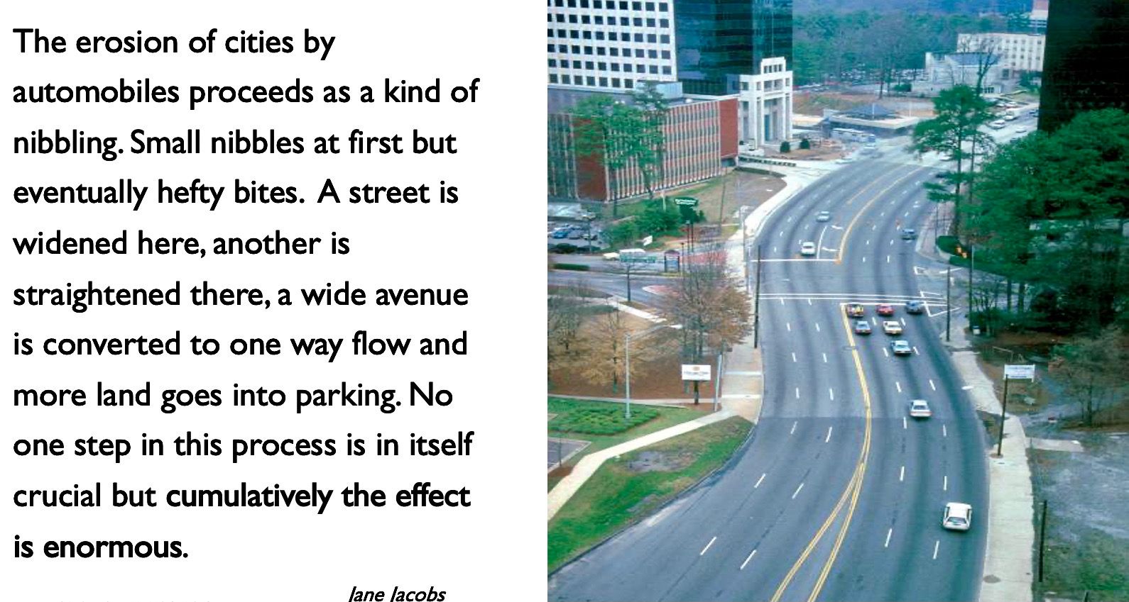 The resulting erosion and gradual disappearance of street life on the sidewalks was, and continues to be, a disastrous loss of life in our communities. A loss of social and economic wealth, and even of pride, in the places we once called home.