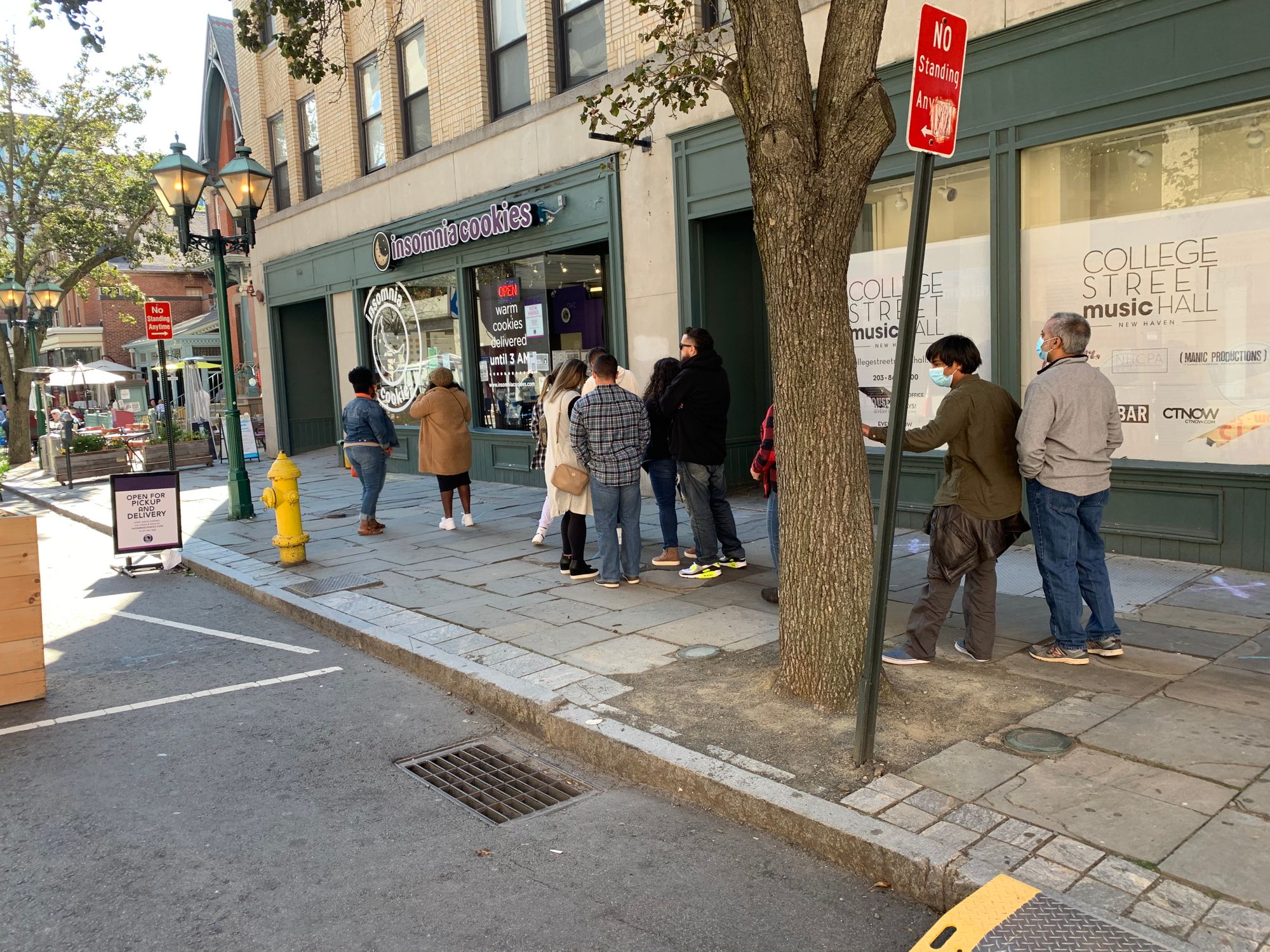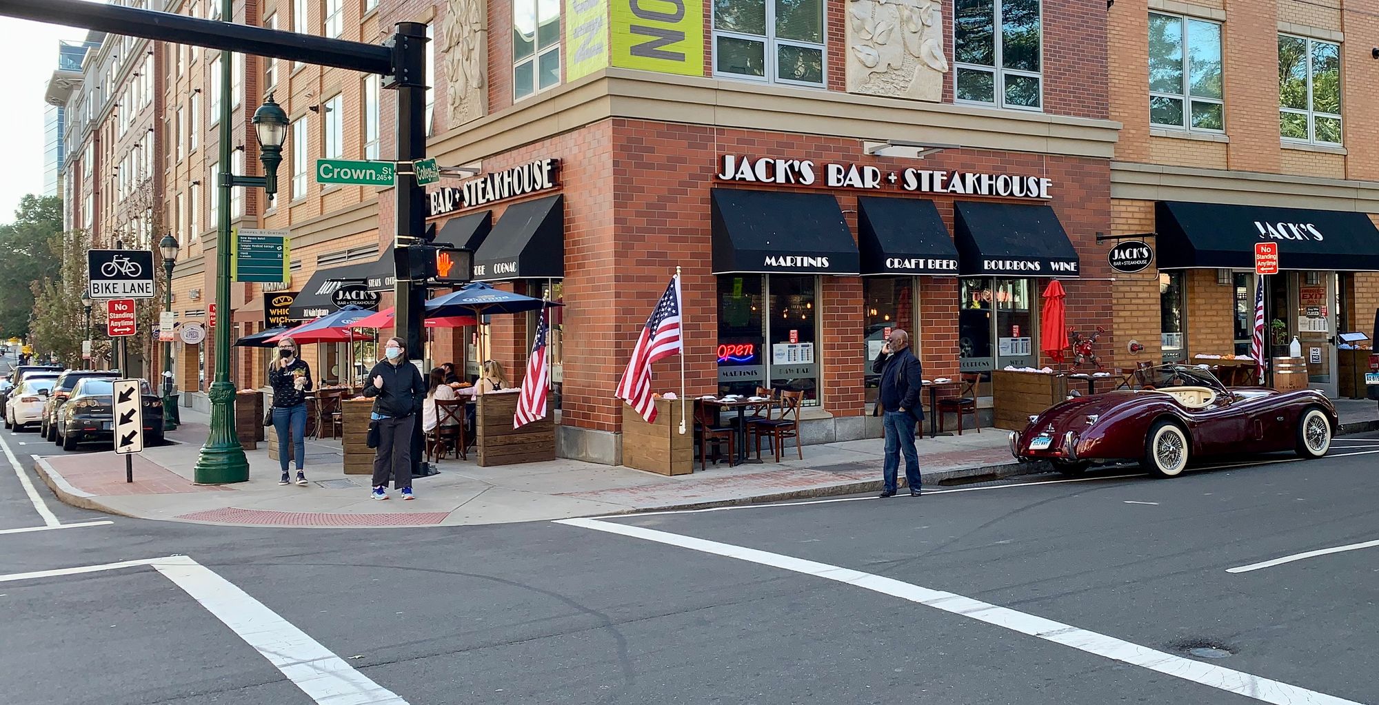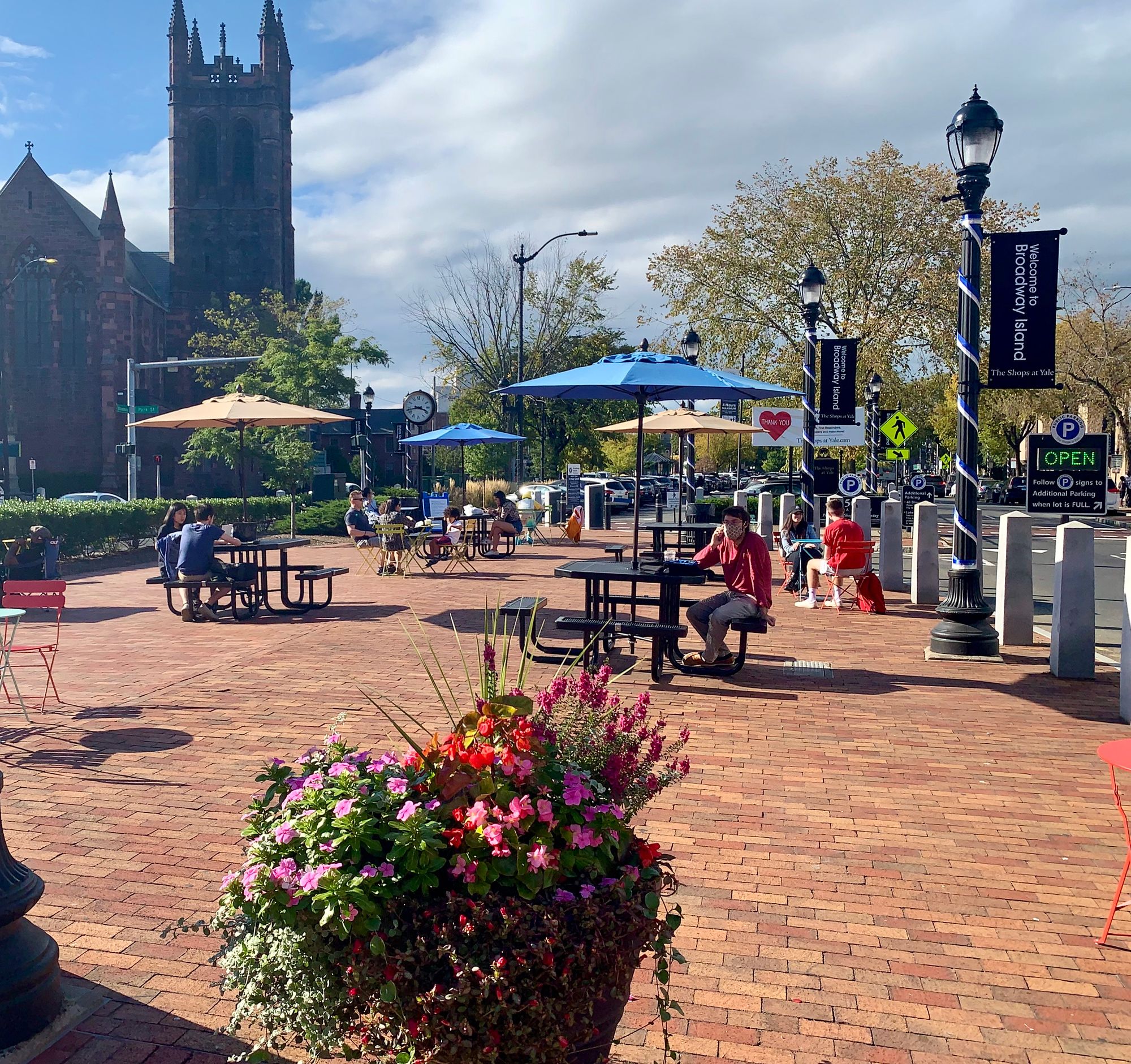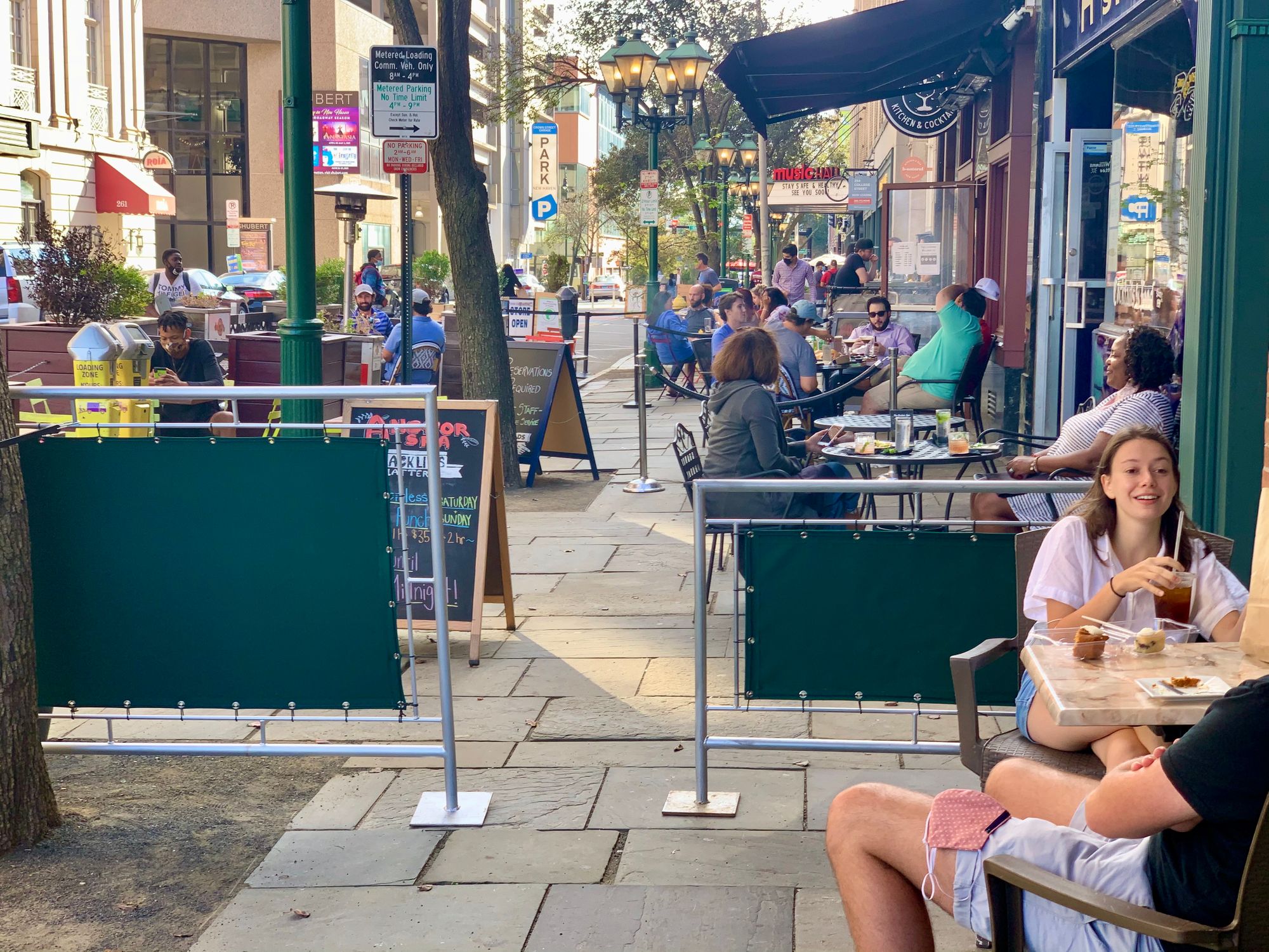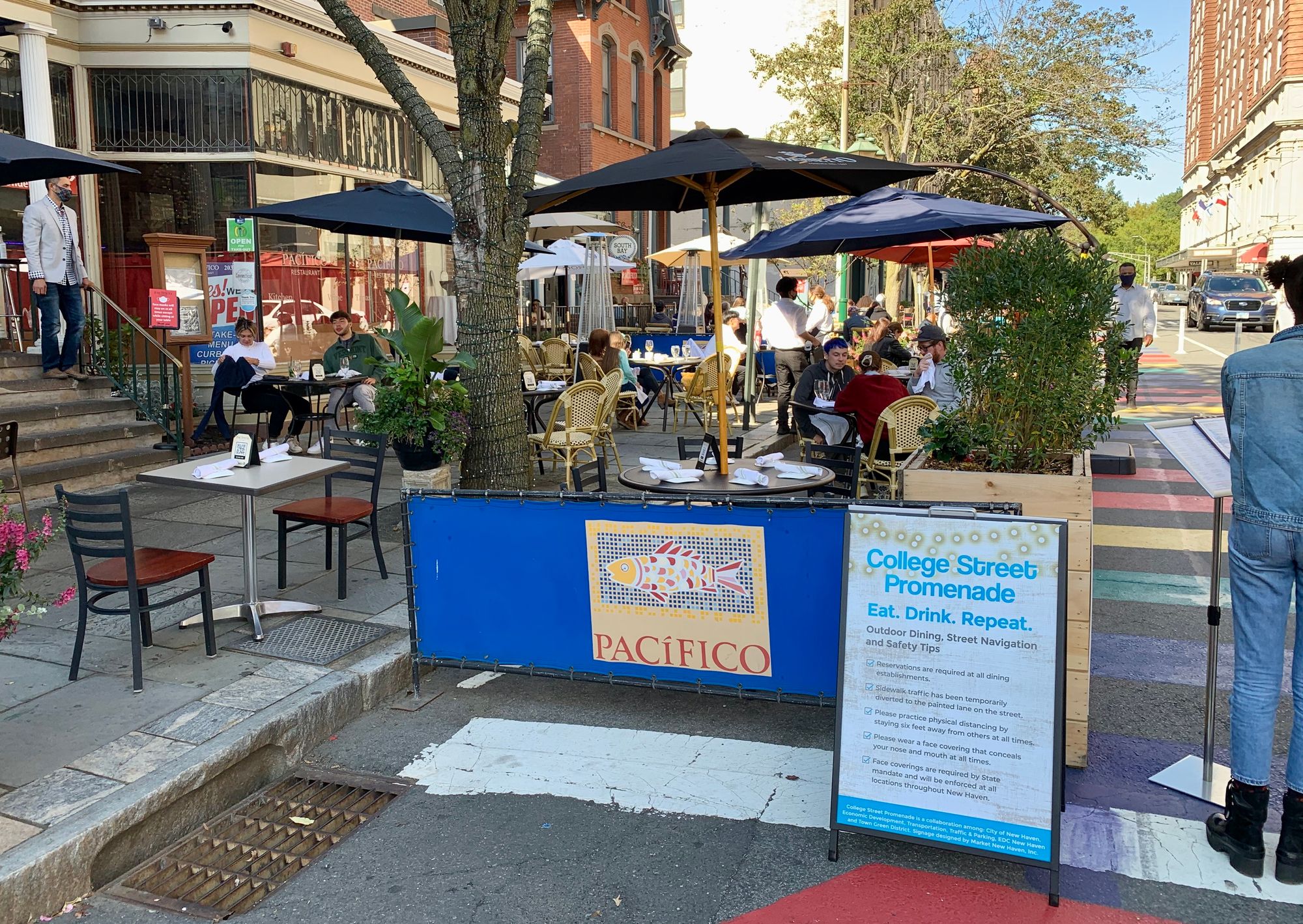 Now let's jump ahead to September 2020. To address the challenges of COVID-19, Yale University worked with the City to create an instant "Restaurant Row" on College Street. The City of New Haven relocated the sidewalk into the street, painting it in colorful stripes and replacing what had been a moving lane for traffic.