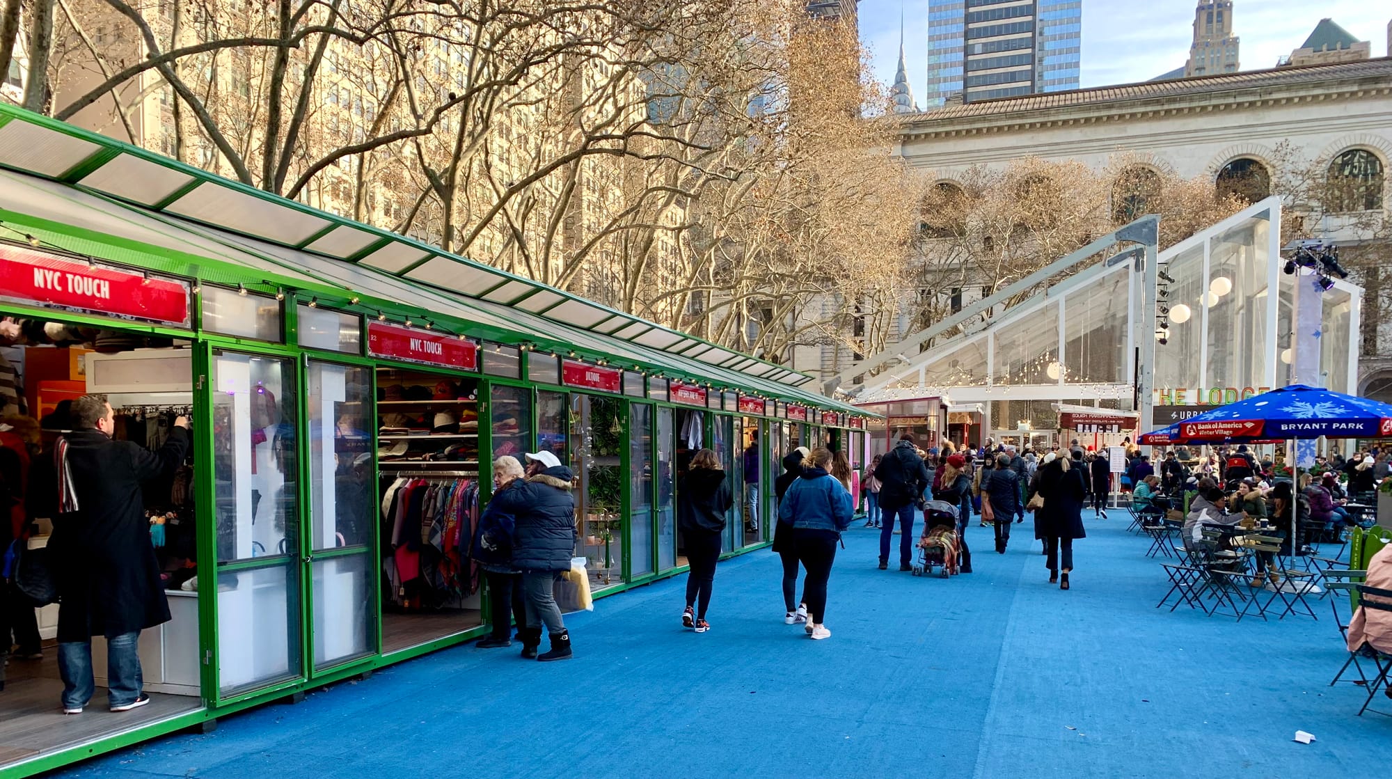 Bryant Park is located in the heart of Midtown Manhattan and is renowned for its dynamic design and numerous programs which draw in millions of people year-round. The holiday market at Bryant Park is a focal point of New York's winter celebrations with its charming green booths surrounding the large ice rink and Chirstmas trees.