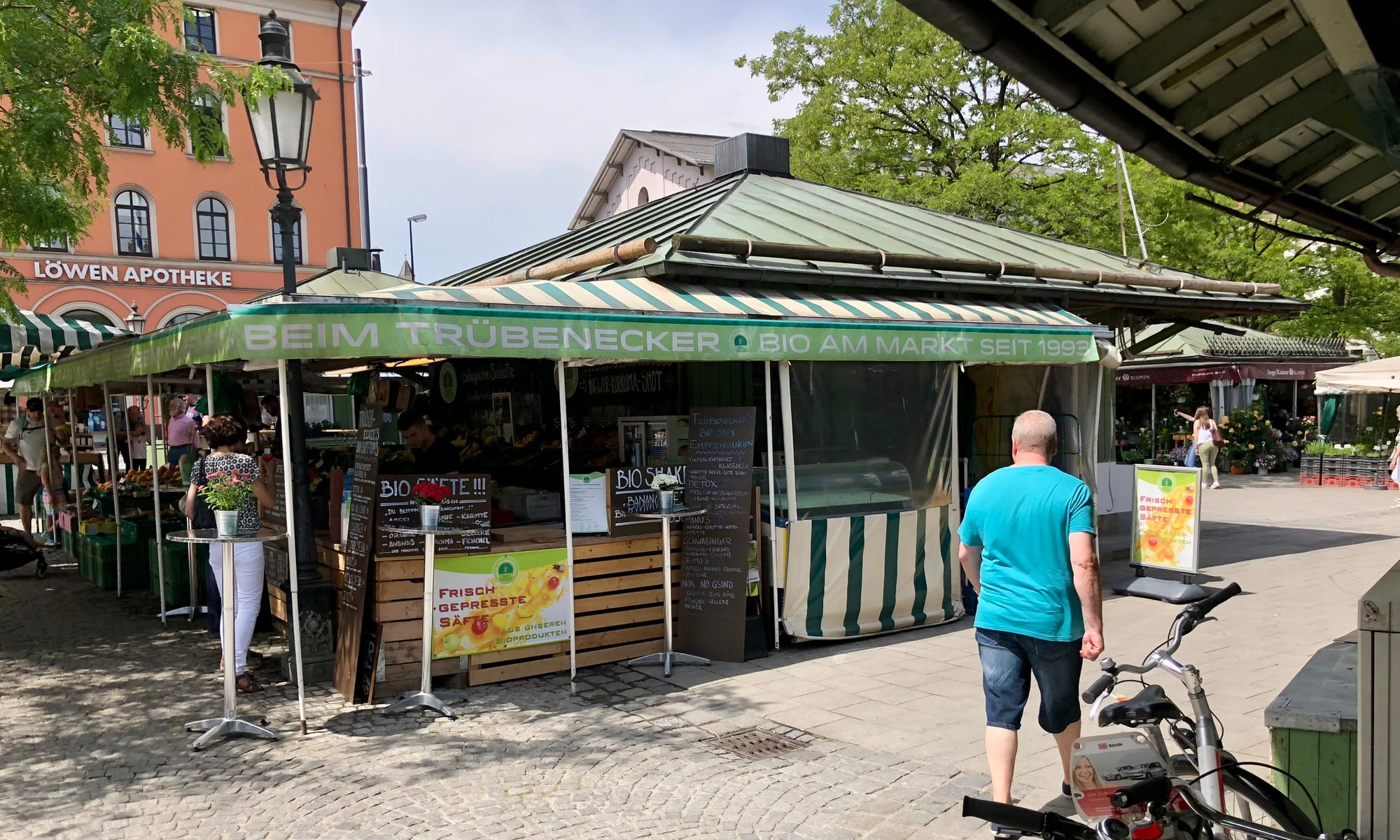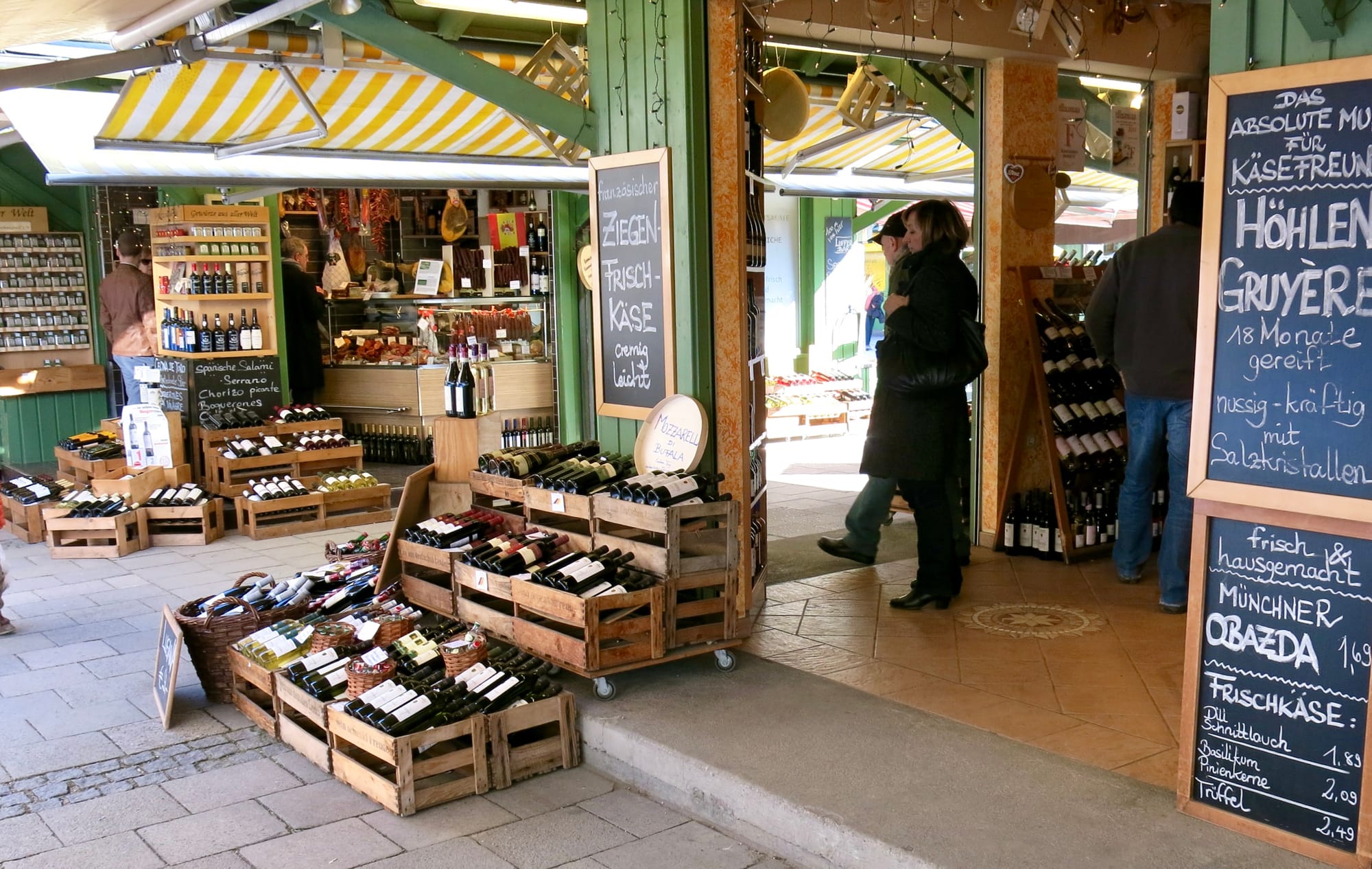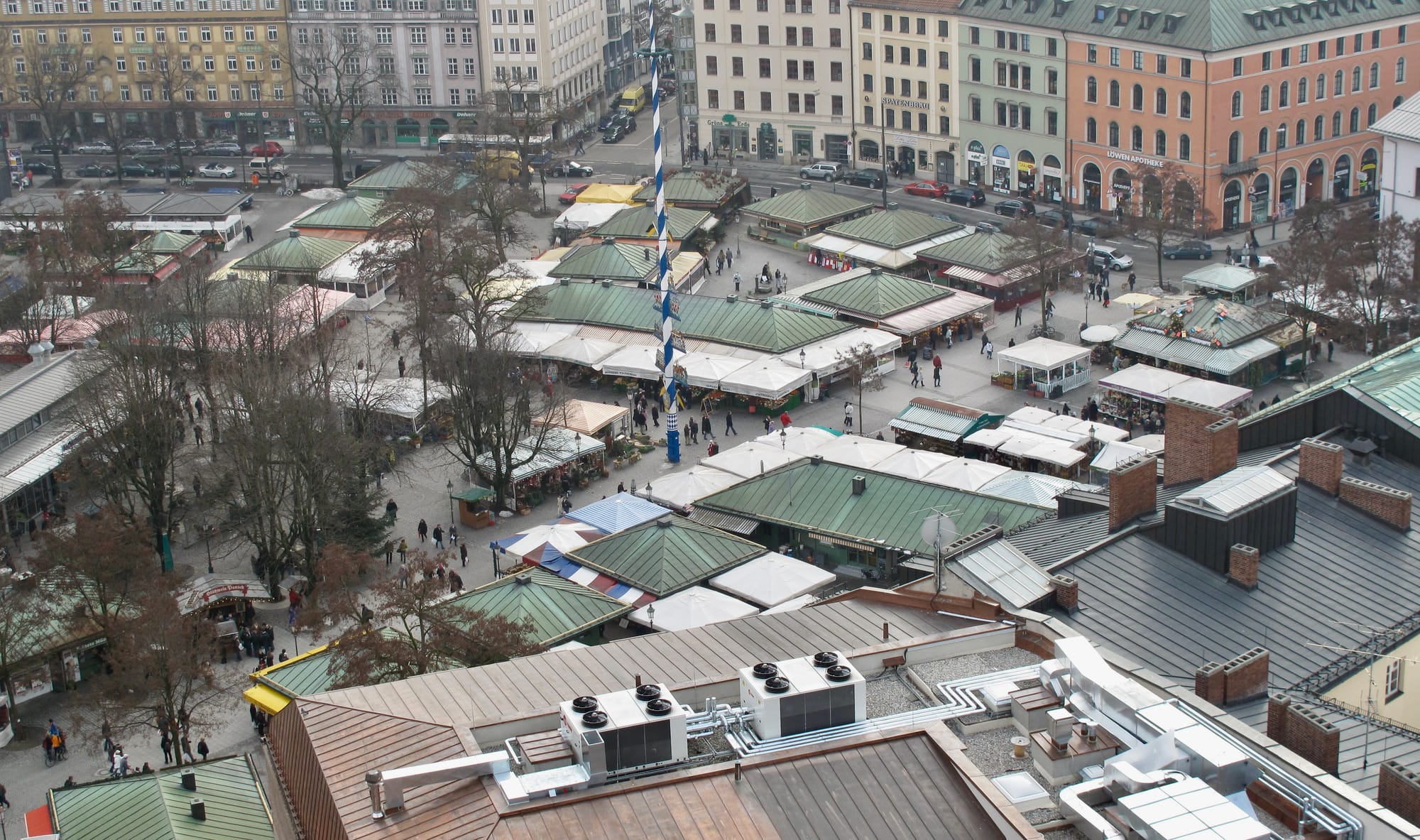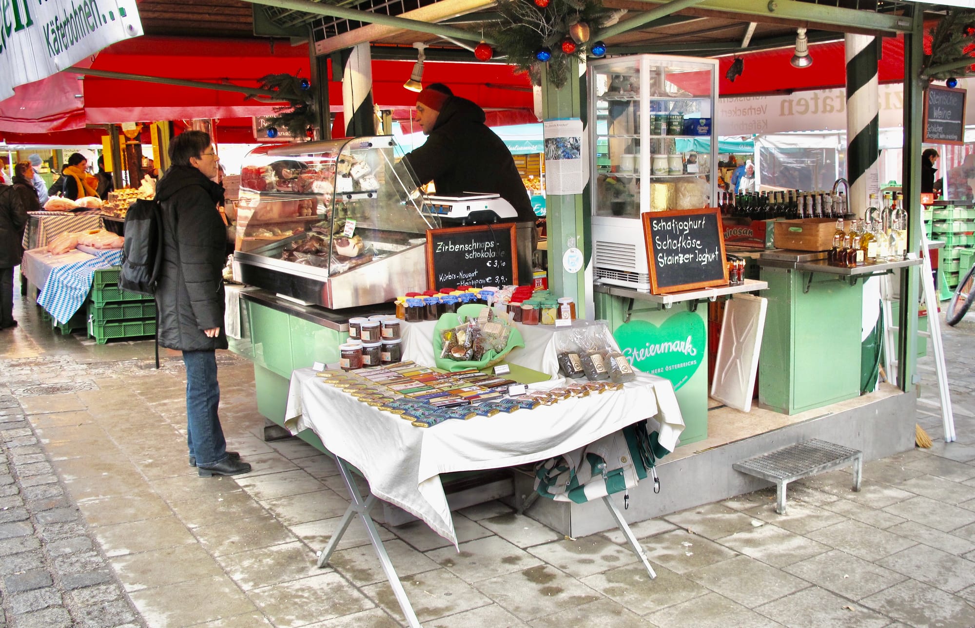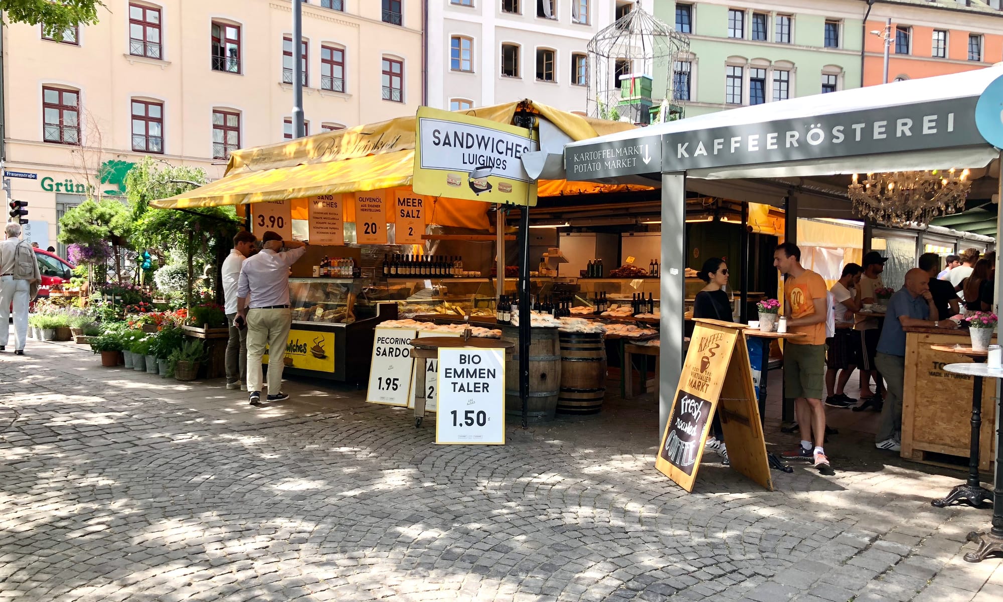 In Munich's Victuals Market we see a great example. The green-roofed stalls here transform the market from a lightweight setup just passing through into a firmly rooted establishment in the city. They give the market presence and dimension, allowing it to offer all manner of goods and services in every weather condition. On hot days, you can wind through the lanes and peruse the external displays. When a cold chill blows, you can walk deeper under the awnings of the buildings, or even inside them for shelter, as you enjoy endless things to see, smell, and touch.