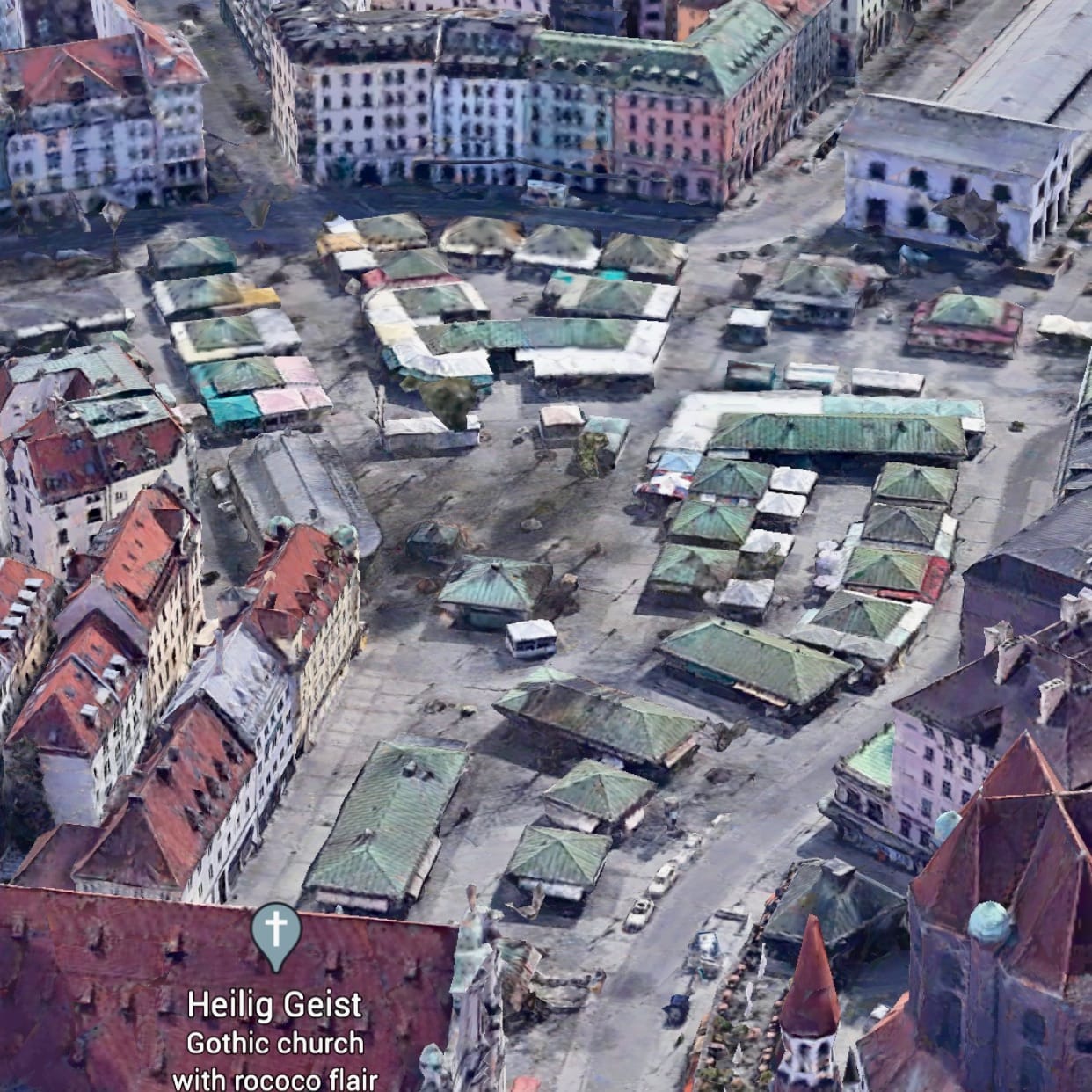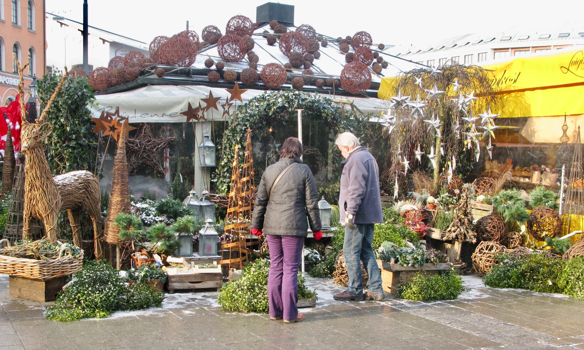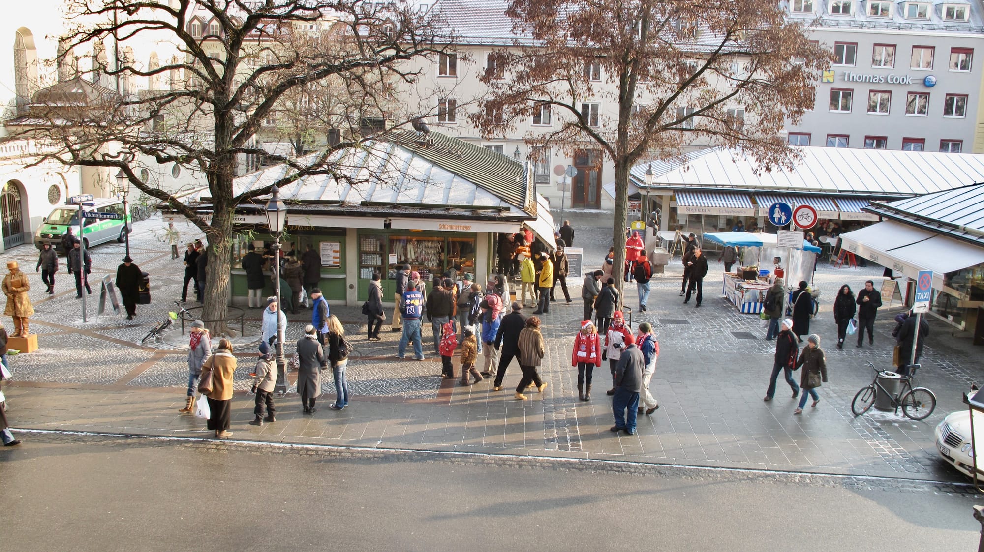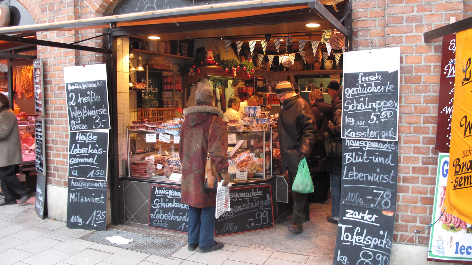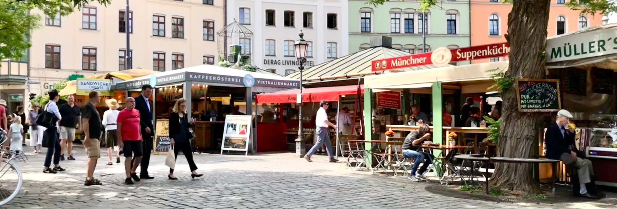 In Munich's Victuals Market we see a great example. The green-roofed stalls here transform the market from a lightweight setup just passing through into a firmly rooted establishment in the city. They give the market presence and dimension, allowing it to offer all manner of goods and services in every weather condition. On hot days, you can wind through the lanes and peruse the external displays. When a cold chill blows, you can walk deeper under the awnings of the buildings, or even inside them for shelter, as you enjoy endless things to see, smell, and touch.
