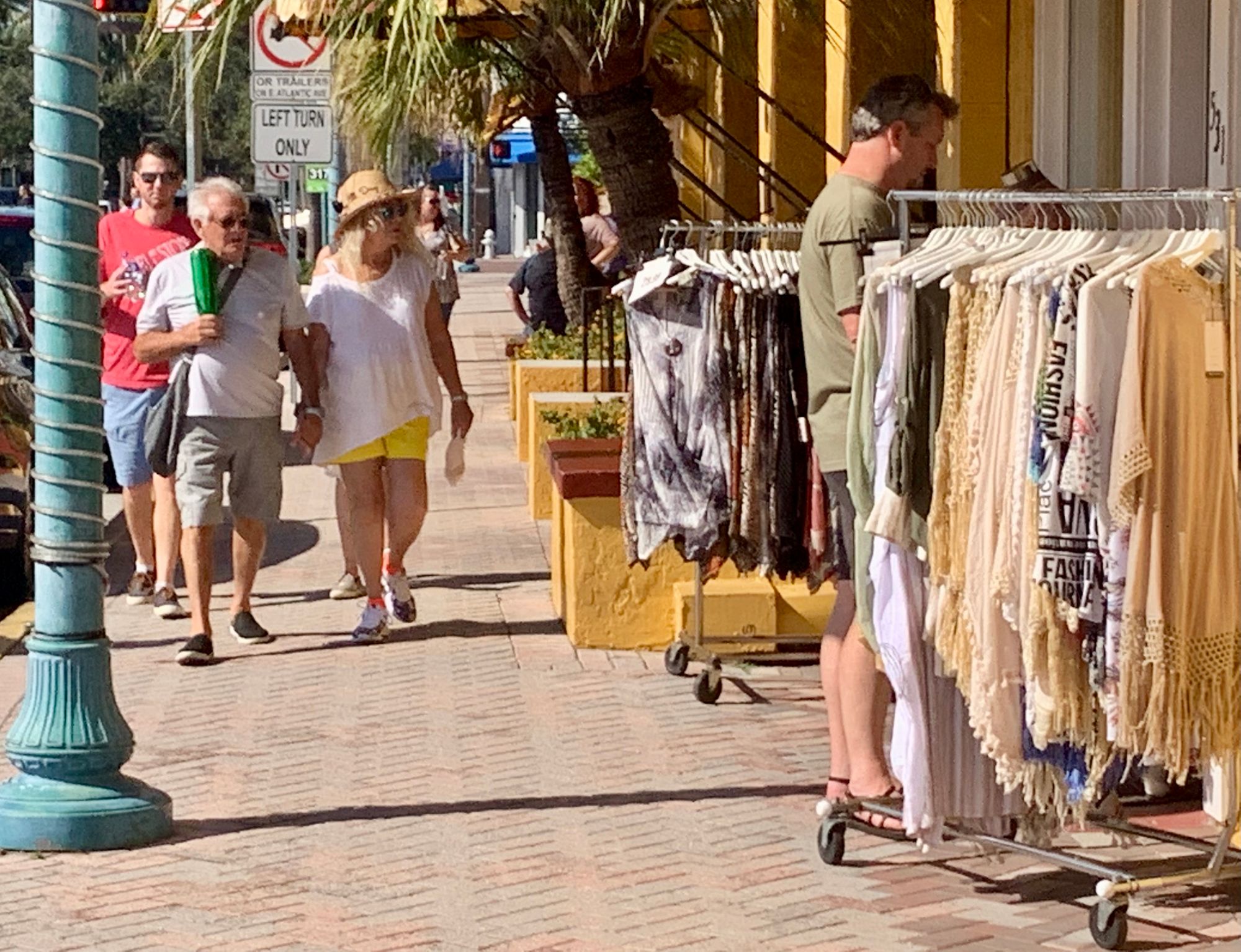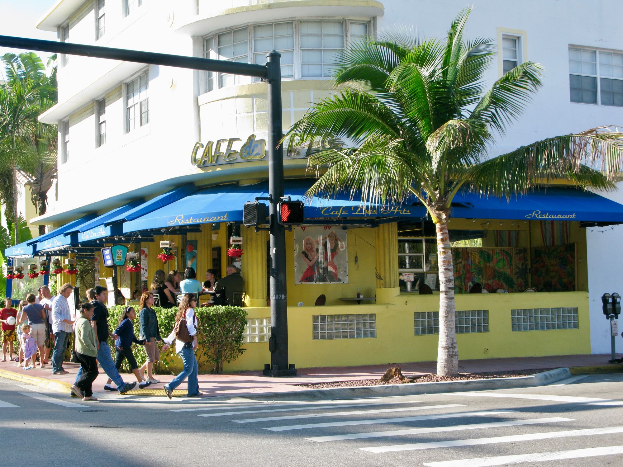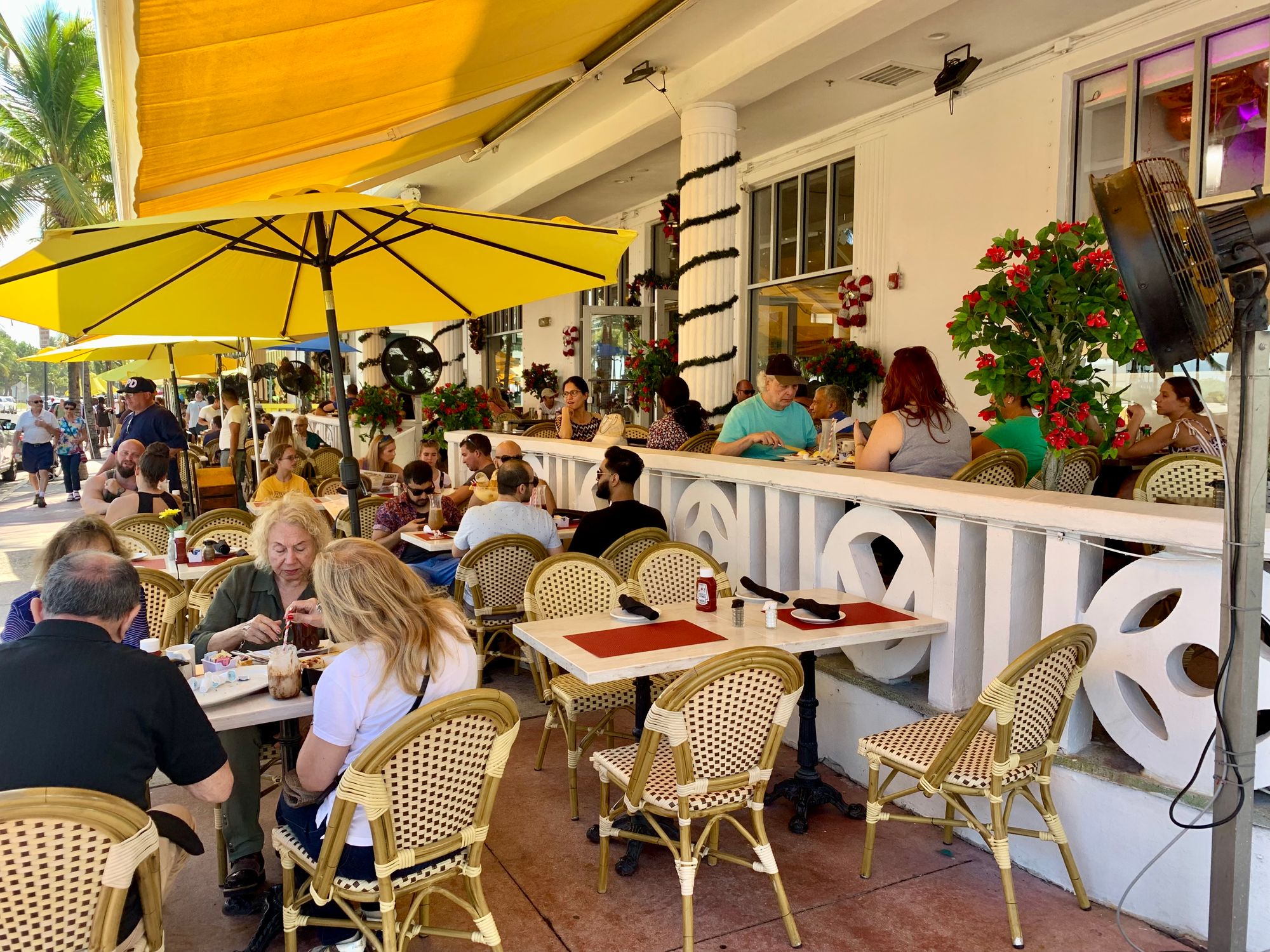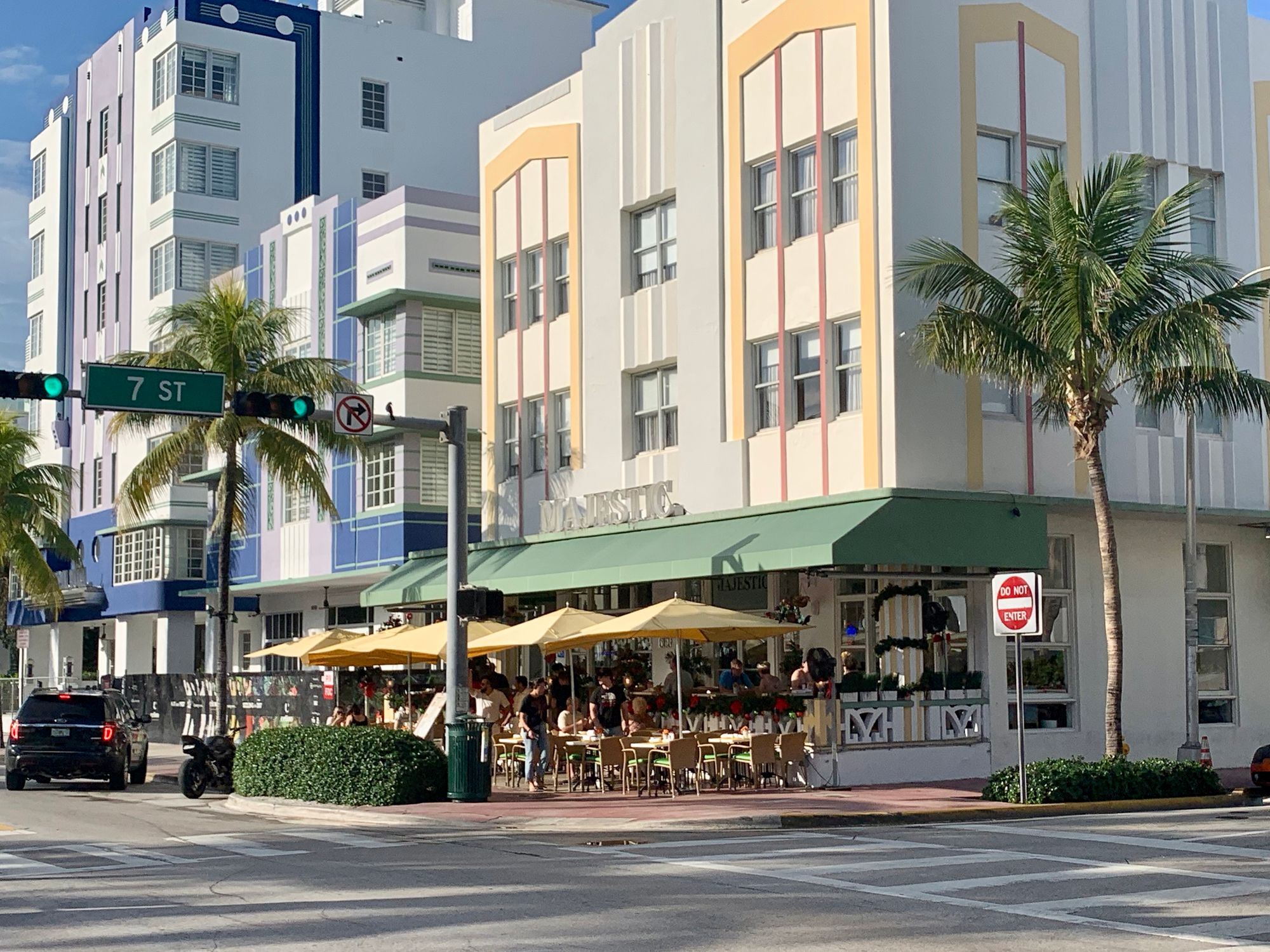 With Art Deco buildings lining Ocean Drive on one side, and a park and extensive beach on the other, streets in Miami Beach are not about traffic, but about experiencing the "show" and enjoying the sights. Many buildings have porches from which people can view the passing throngs of visitors.