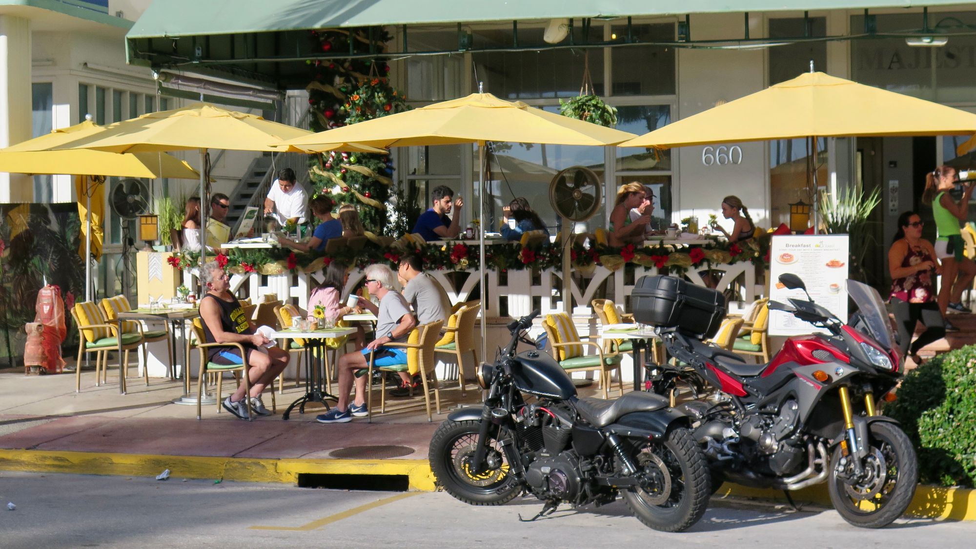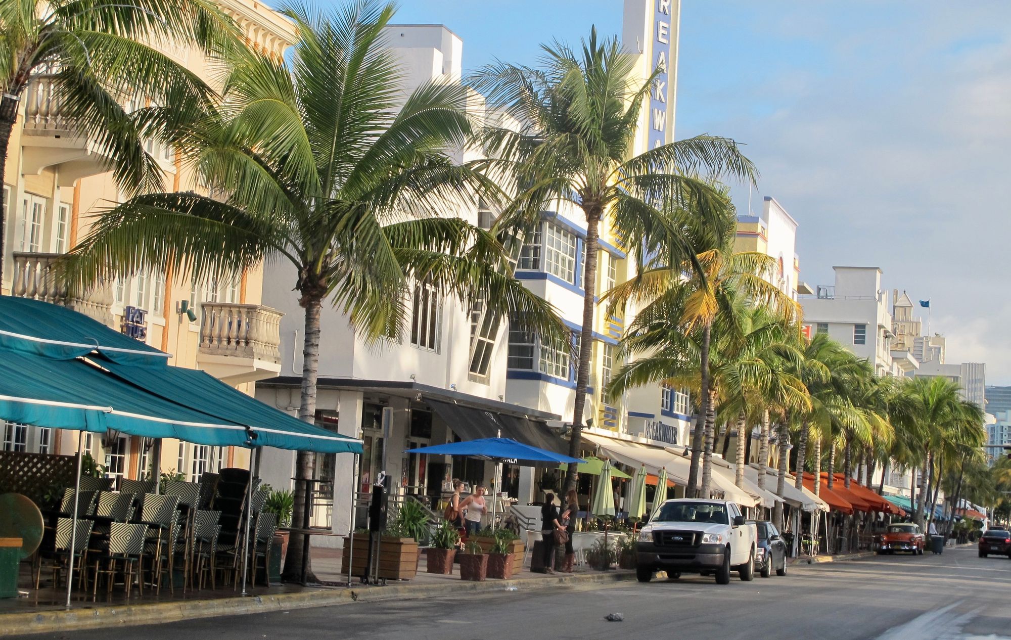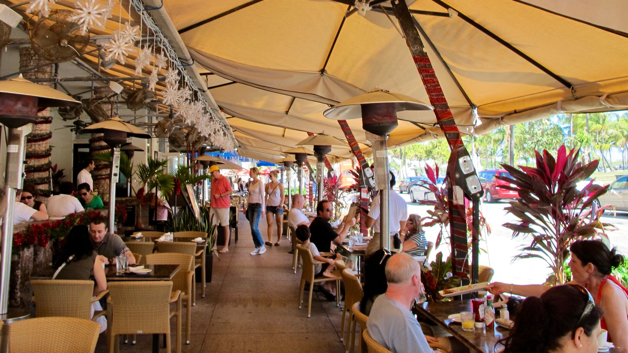 With Art Deco buildings lining Ocean Drive on one side, and a park and extensive beach on the other, streets in Miami Beach are not about traffic, but about experiencing the "show" and enjoying the sights. Many buildings have porches from which people can view the passing throngs of visitors.
