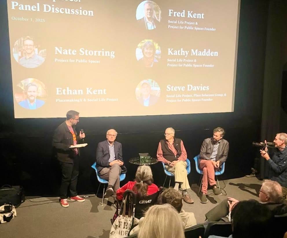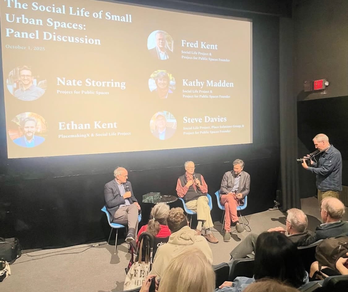 When William H. (“Holly”) Whyte's now-classic film, The Social Life of Small Urban Spaces, was released in 1980, it had an immediate impact on people’s understanding of the importance of public spaces – and created a lifelong career for all of us. The print of the film, long in distribution, was of poor quality, however, and was rarely screened. Last January, I found what turned out to be an excellent original print of the film in the SLP archives. On October 1, 2025 — Holly Whyte’s birthday – Fred, Kathy, and I hosted a special screening of the restored version of the film at Anthology Film Archives. Poignantly, it was the last time the three of us would ever appear publicly together, as Kathy passed away soon after.