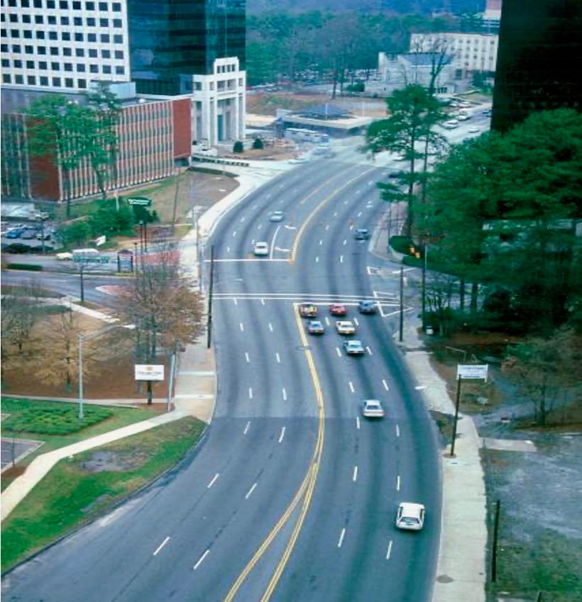 Over the years, as lanes were expanded, sidewalks were shrunk. Now, in many places they are no more than slivers, if they exist at all. Image source.