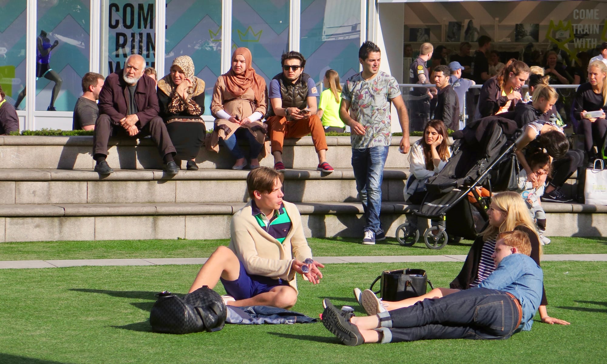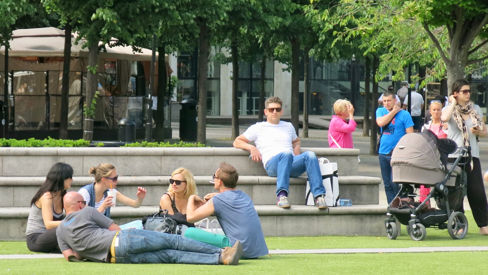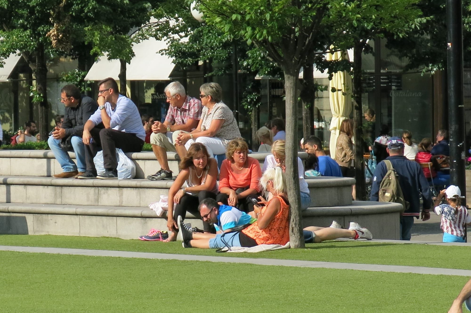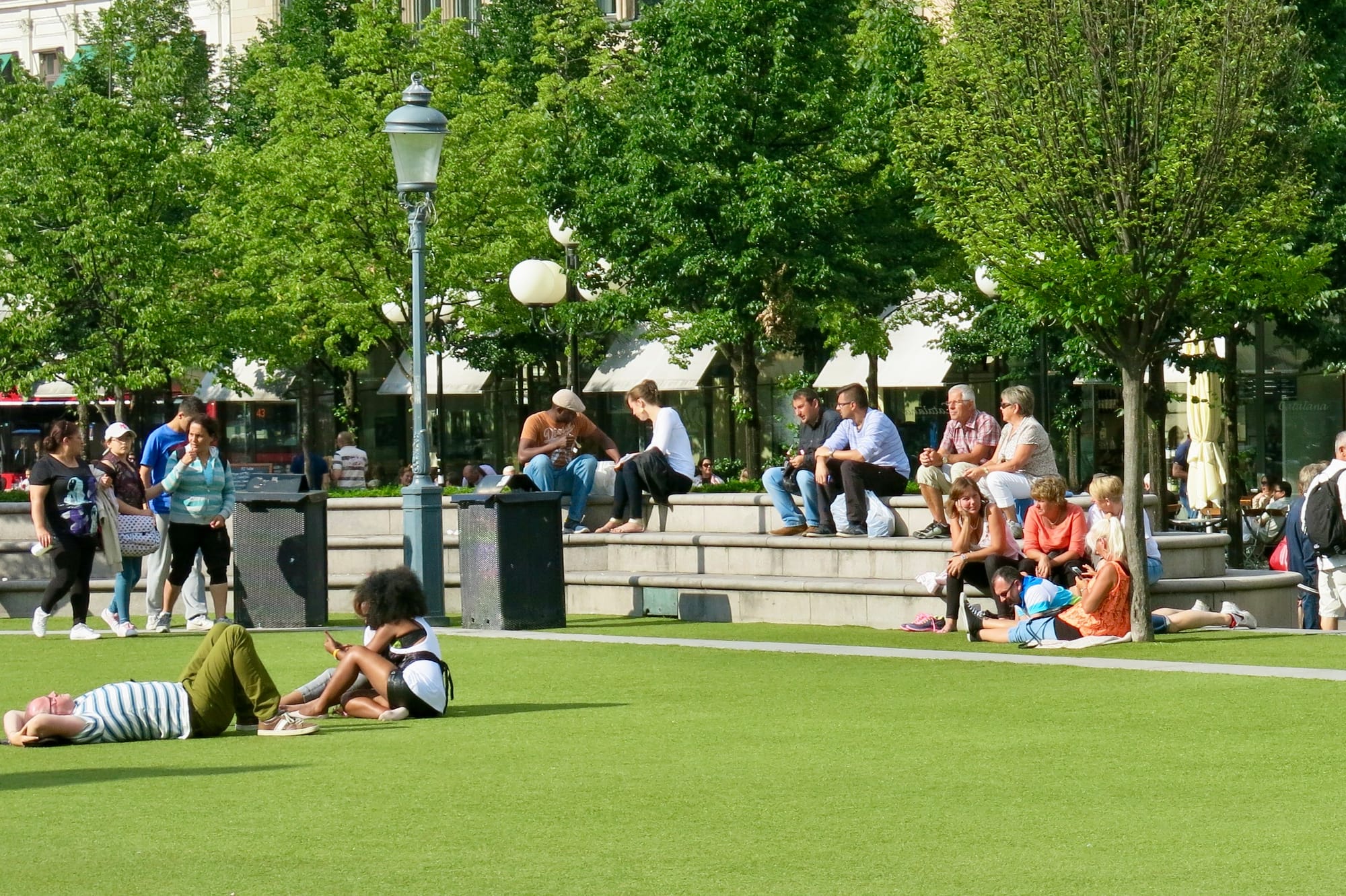 The central lawn is encircled by low steps, giving it a cozy enclosed feeling that further creates a sense of comfort, relaxation, and security. The low seating wall creates something of a viewing platform for people to watch "the show" of social life play out in the park. From the steps and surrounding cafés, adults can keep an eye on their children as they play freely on the grass while enjoying their own time chatting, reading, or relaxing. They can also lie comfortably on the ground and enjoy some sunbathing as the little ones run around.