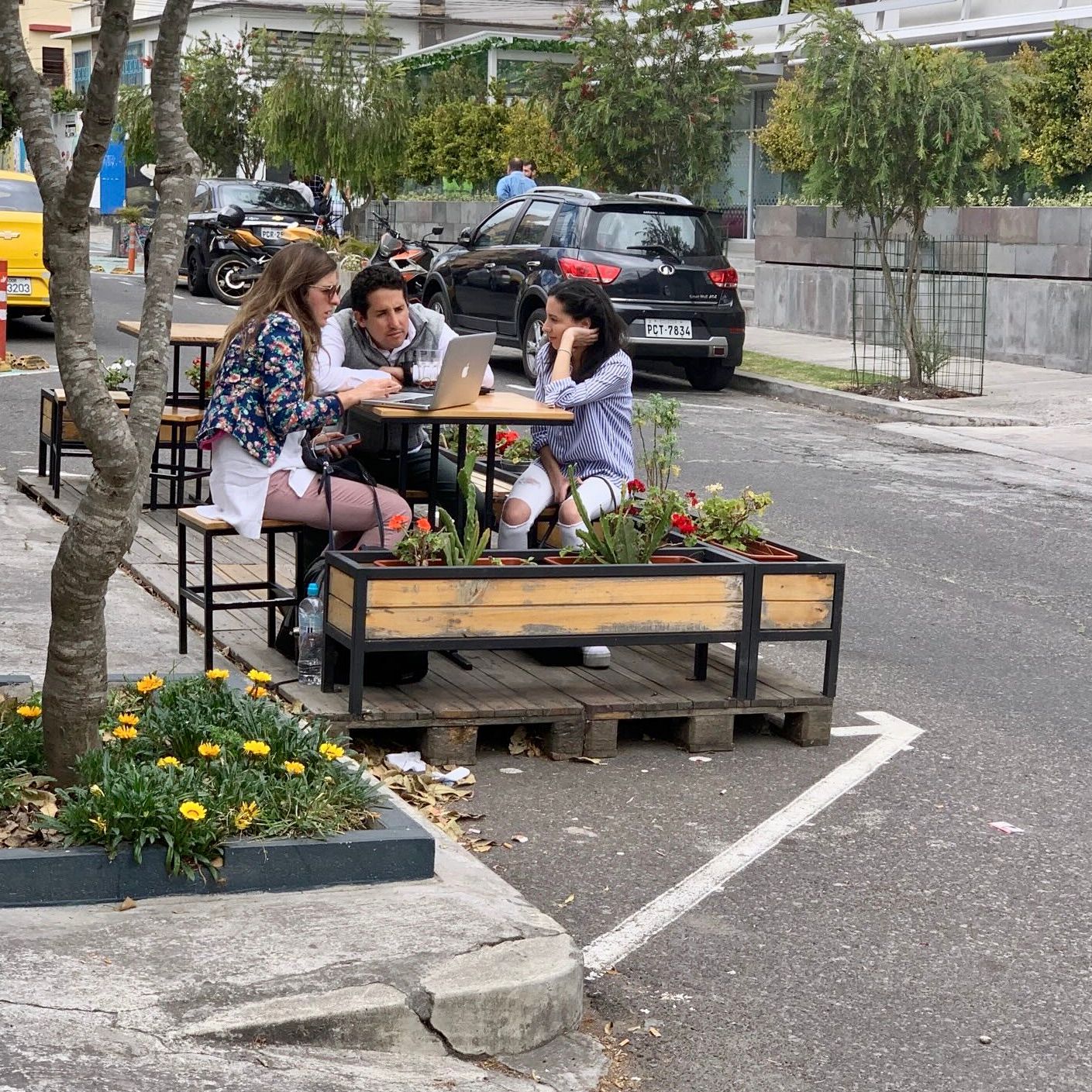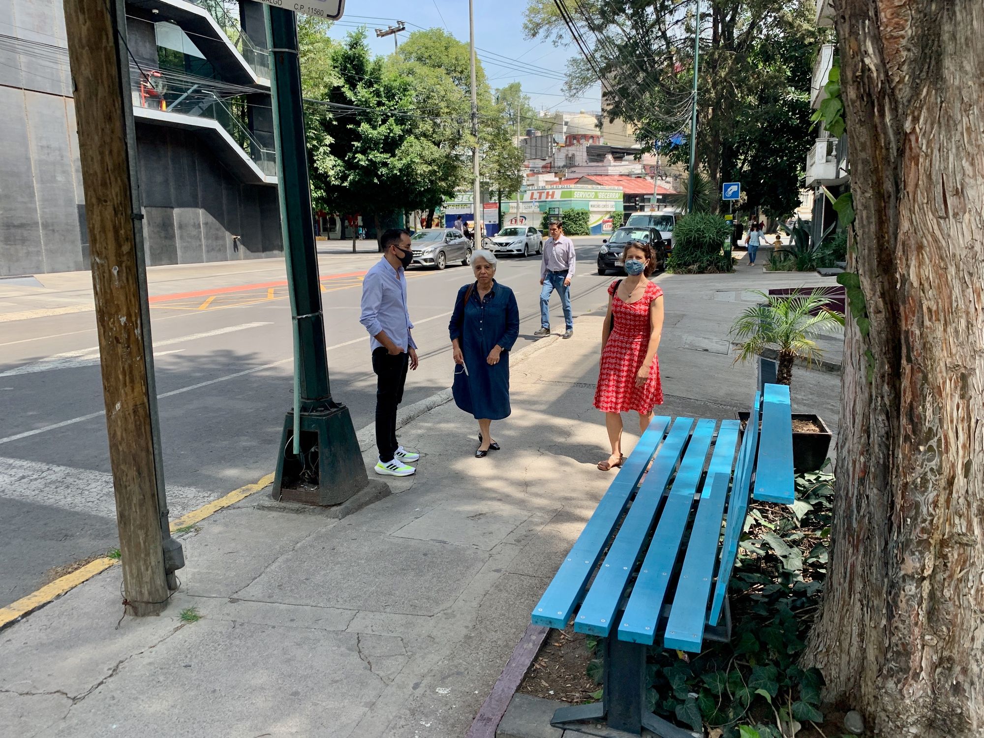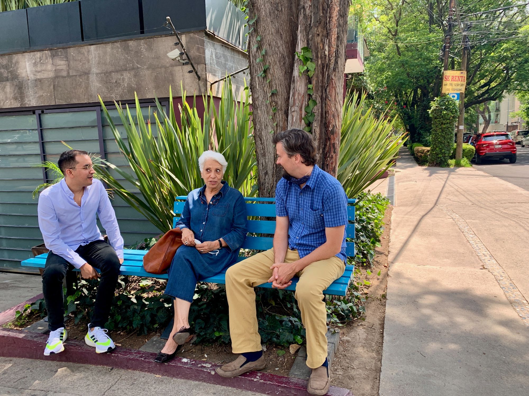 Our partner in Mexico City, Fundacion Placemaking Mexico added a bench at the corner in front of our long time friend, Cecilia Martinez's house in Mexico City. Guillermo Bernal, Cecilia Martinez, Ethan, and Aley Kent can be seen here spending time on that corner.