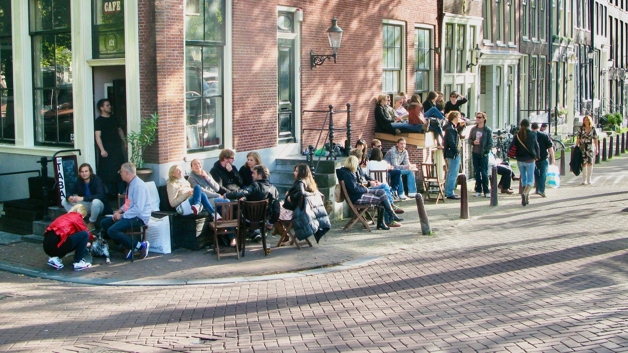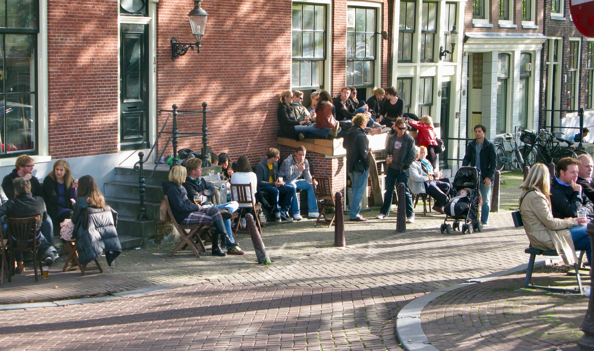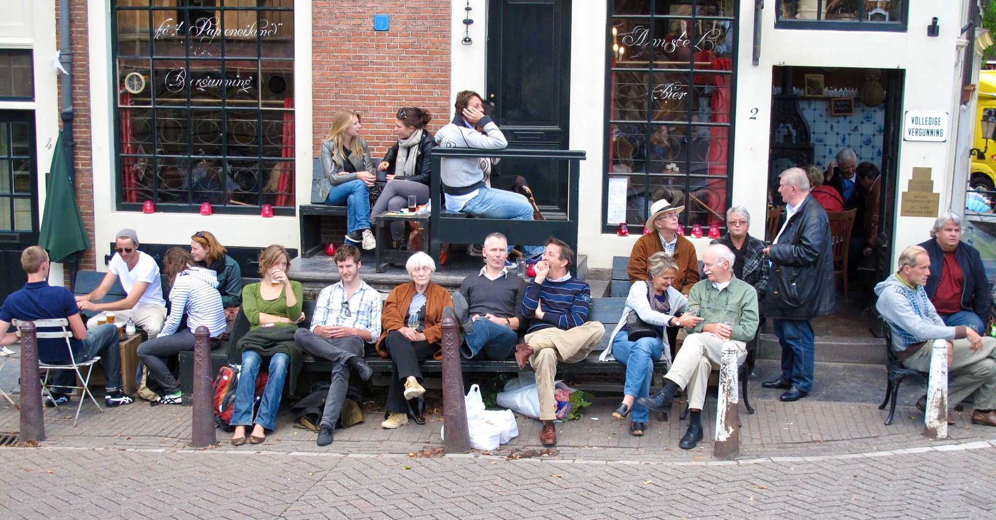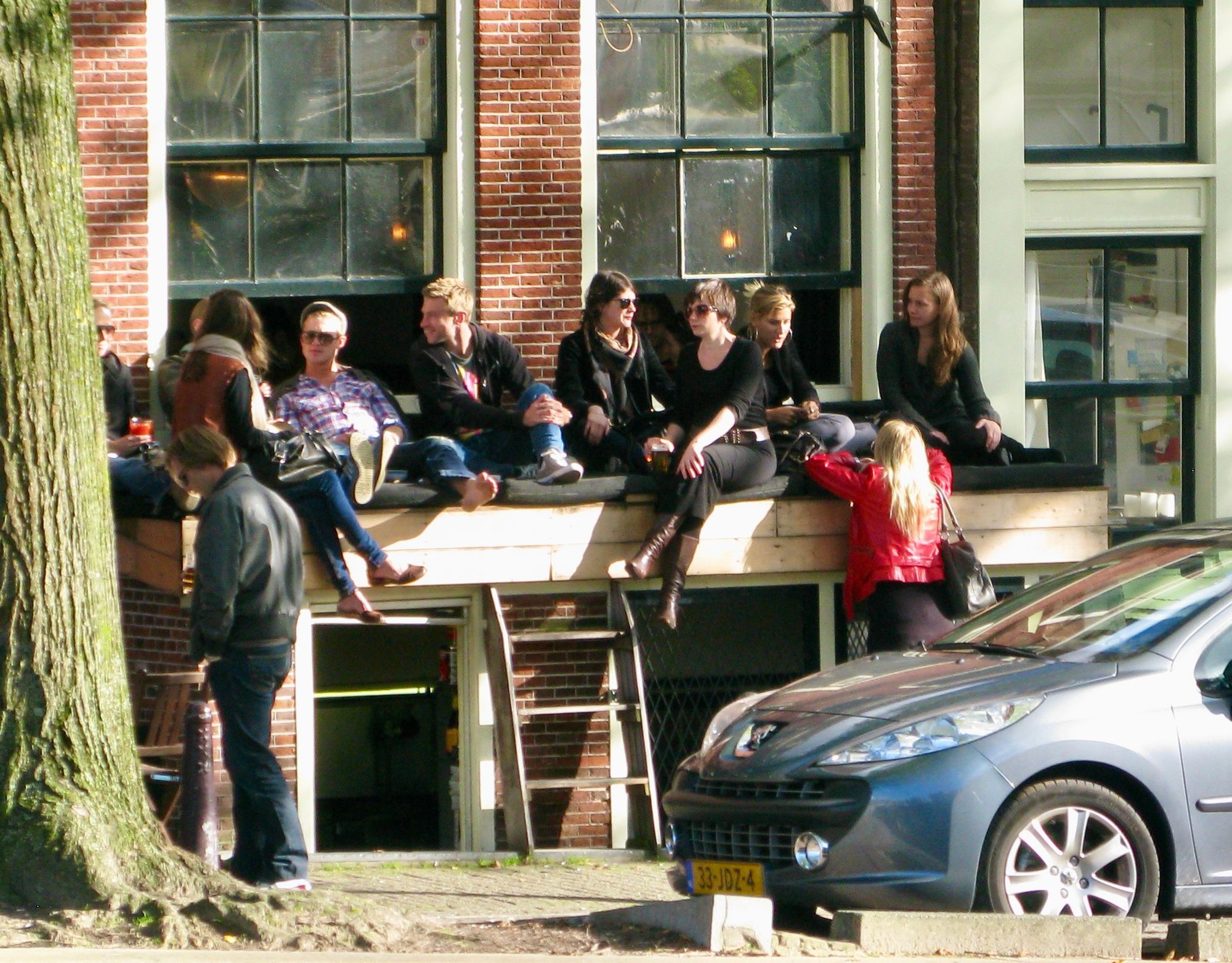 These two places are across from the Keizersgracht canal from each other. Both are famous gathering spaces with layers of people perched, standing, leaning, or just slowly walking through each space.