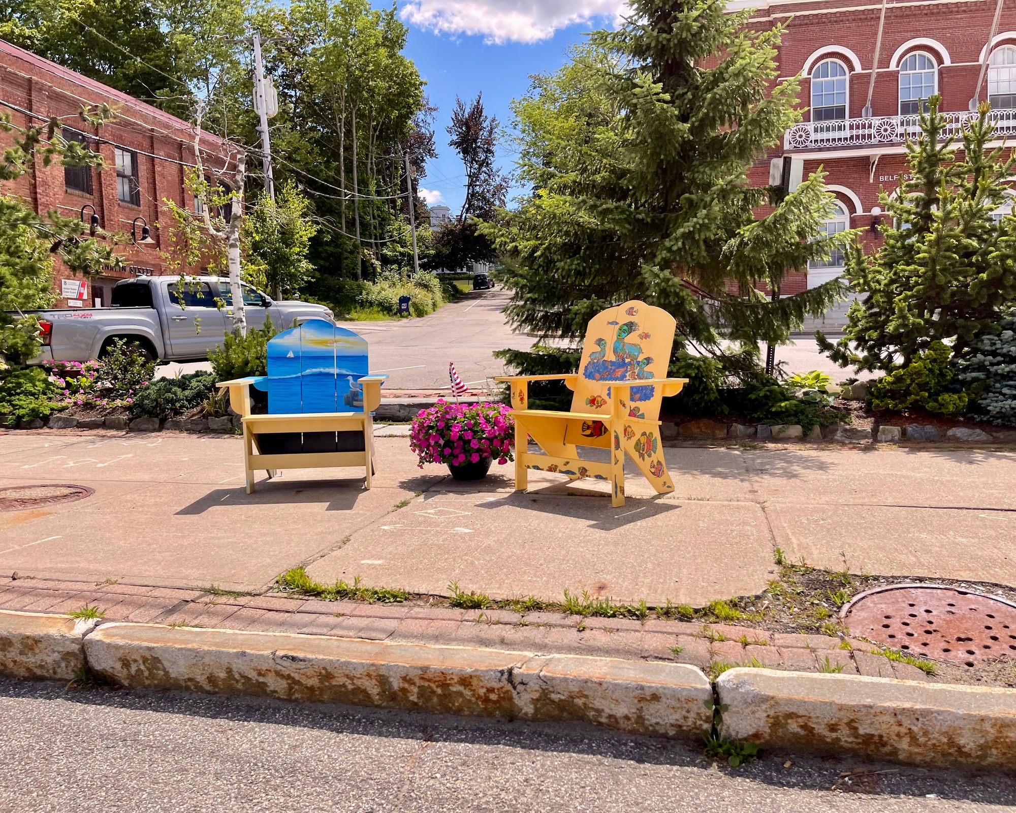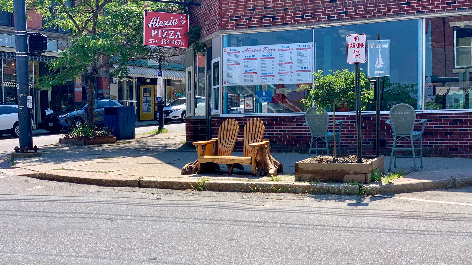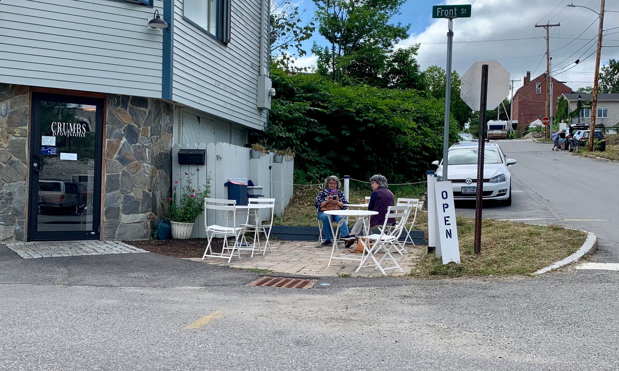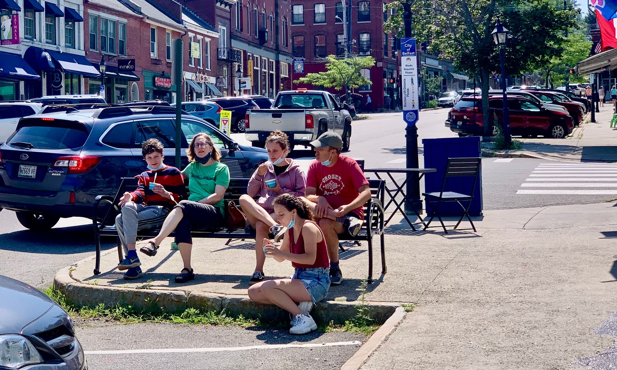 Belfast, Maine and Los Altos, California have good examples of corner seating. Both of these communities are successful at evolving from the traditional car-centric community into one where people and social life thrive. Over time they have reduced automobile parking and even how much people drive within the downtown.