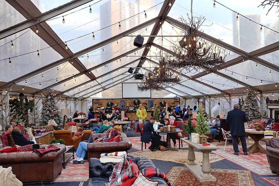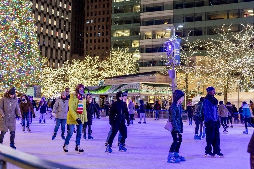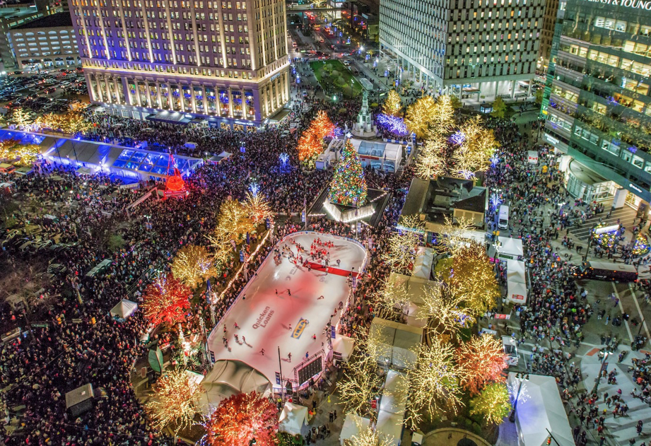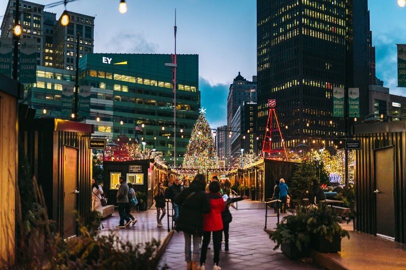 Cadillac Lodge anchors a popular holiday market and ice skating at Campus Martius Park.