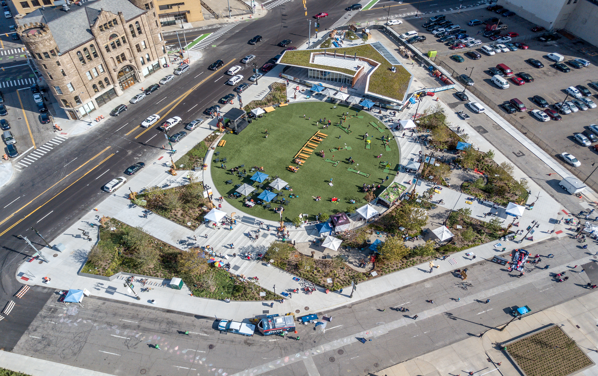 Connecting Campus Martius to City Hall and the Detroit River, this new space transformed a landscaped traffic island into a heavily used pedestrian promenade and transit terminal for a new streetcar line. Buildings adjacent to the promenade have also been activated.